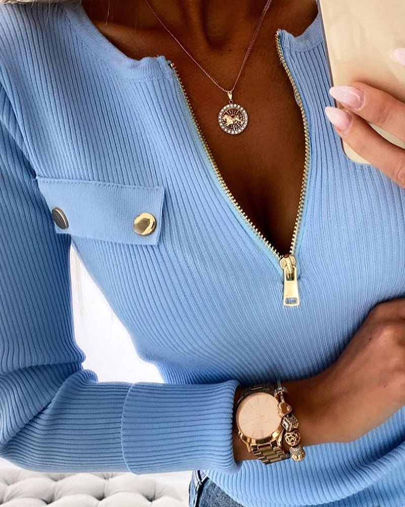 Crewneck Half Zipper Flap Detail Knit Sweater Long Sleeve Slim Fit Ribbed Pullover Top