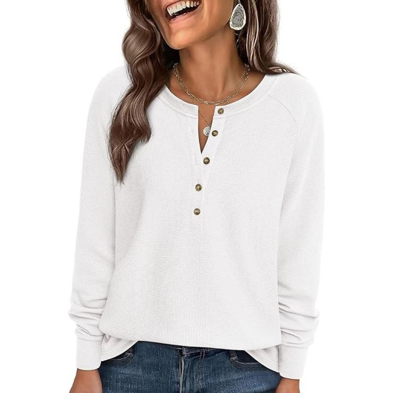 • Women's Button Up Waffle Top Long Sleeve Knit Shirts Fall Casual Henley V Neck Tunic Tops Loose Fit Basic Tees