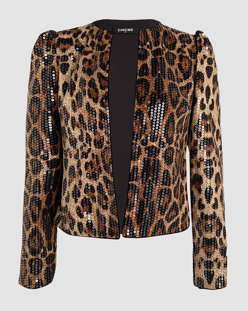 • Allover Sequin Leopard Print Puff Sleeve Open Front Slim Fit Jacket Casual Crop Coat
