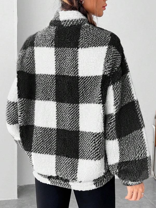 Women's Plaid Print Half Zip Drop Shoulder Fleece Sweatshirt, Casual Long Sleeve Stand Collar Pullover for Spring & Fall, Ladies Clothes for Daily Wear
