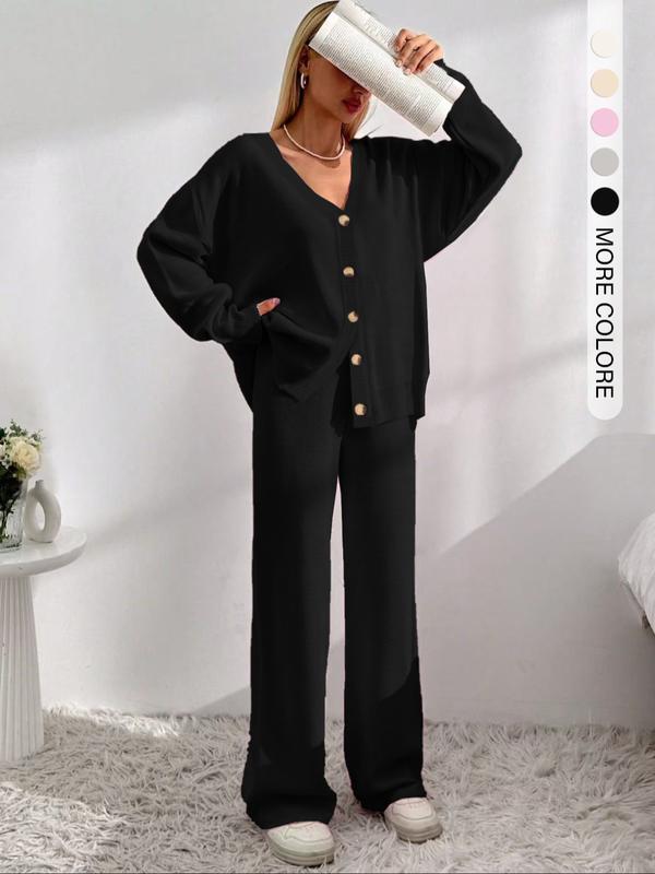 Women's Solid Button Front V-Neck Cardigan & Wide Leg Pants Knitwear Set