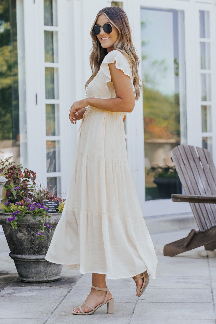 Add this timeless one-and-done boho midi dress to your wardrobe before it sells out! Our Celine Crochet Lace Tiered Boho Midi Dress is one of our absolute favorites featuring short flutter sleeves, a v-neckline with functional button-up closure at the bust, crochet lace accents along the bodice, a functional elastic drawstring waistline, and a tiered midi dress length with slightly ruffled detailing.�