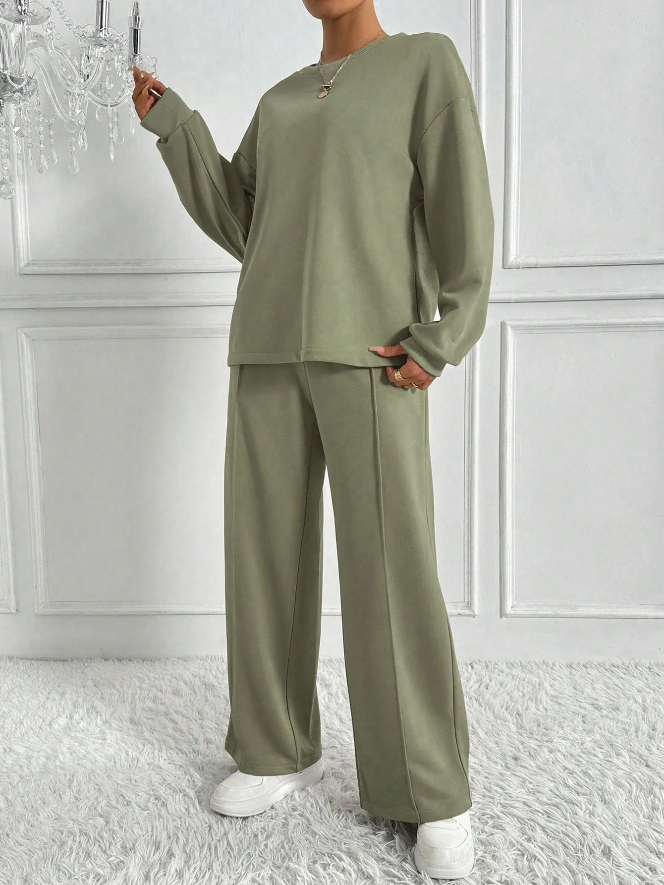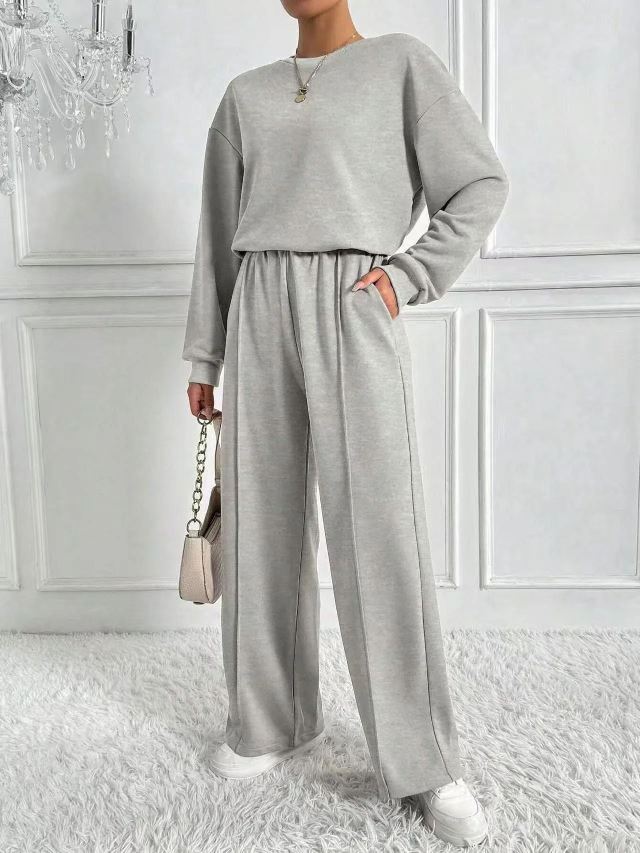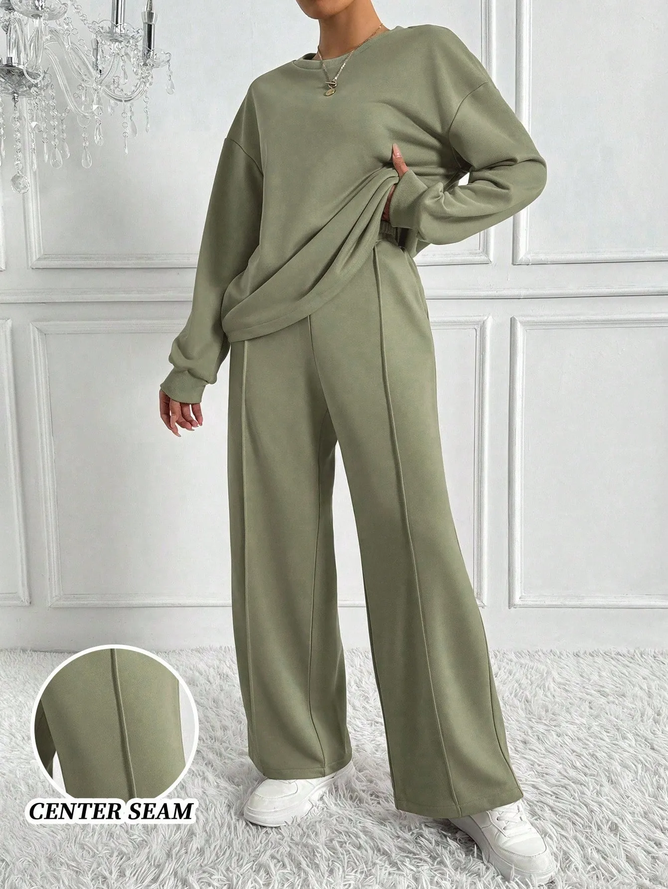 Women's Solid Color Drop Shoulder Sweatshirt & Elastic Waist Pants Two-piece Set, Casual Fashion Cozy Breathable Two Piece Outfits for Daily Outdoor Wear, Women Clothes for Spring & Fall, Womenswear