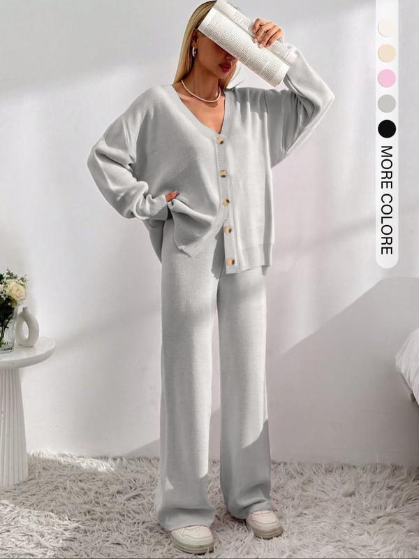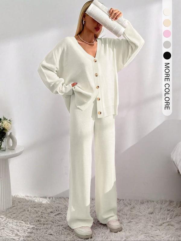 Women's Solid Button Front V-Neck Cardigan & Wide Leg Pants Knitwear Set