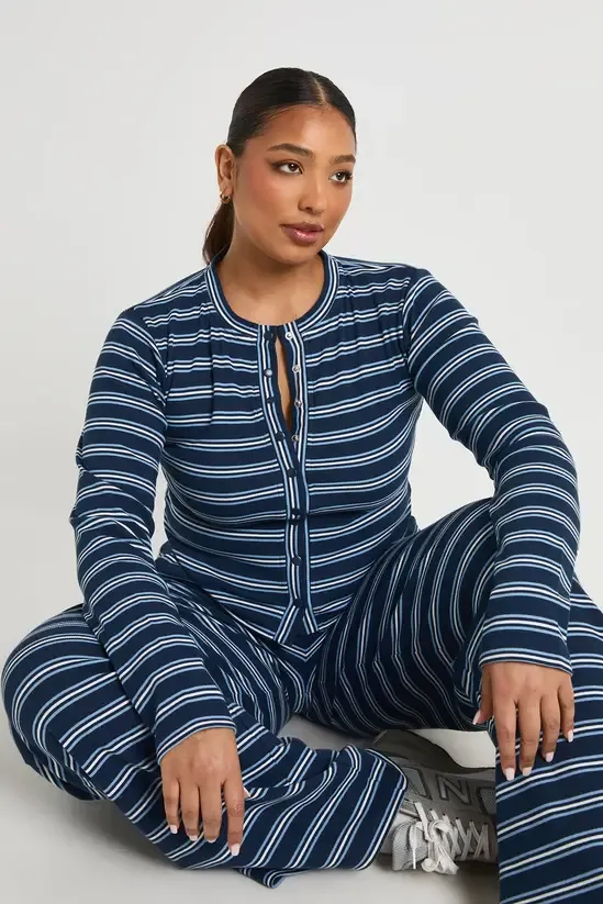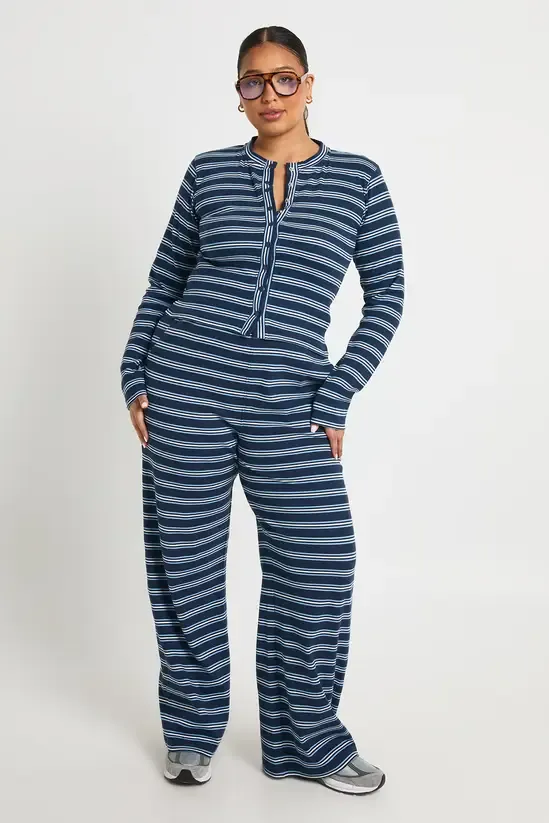 • Women's Striped V-Neck Long Sleeve T-Shirt & Elastic Waist Pants Set, Casual Fall Winter, Loose Fit, Regular Length