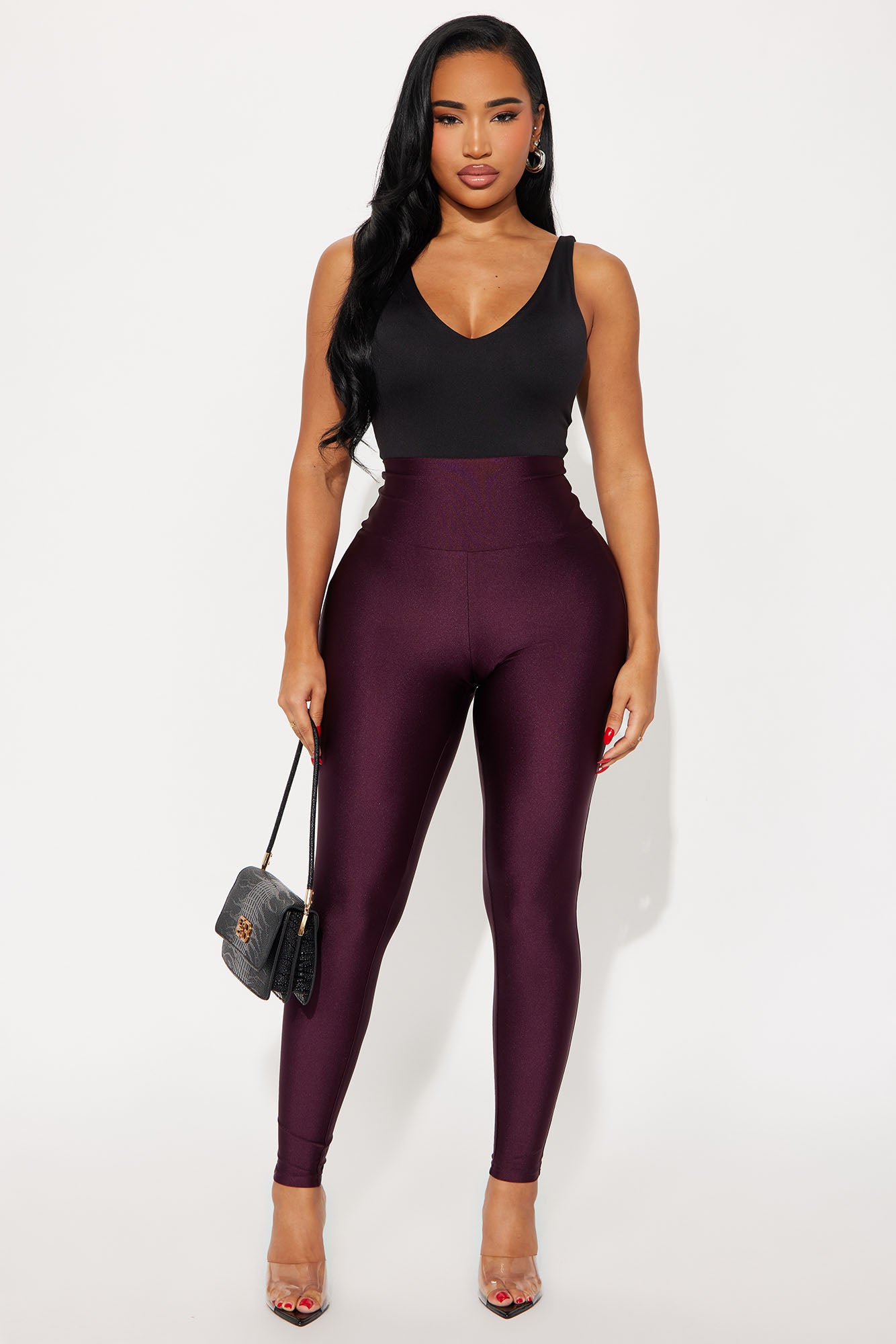 Available In Black, Chocolate, Eggplant, Magenta And Navy.High RiseSlinky FabricFull StretchWide WaistbandSkinny LegSelf: 82% Nylon 18% SpandexImported