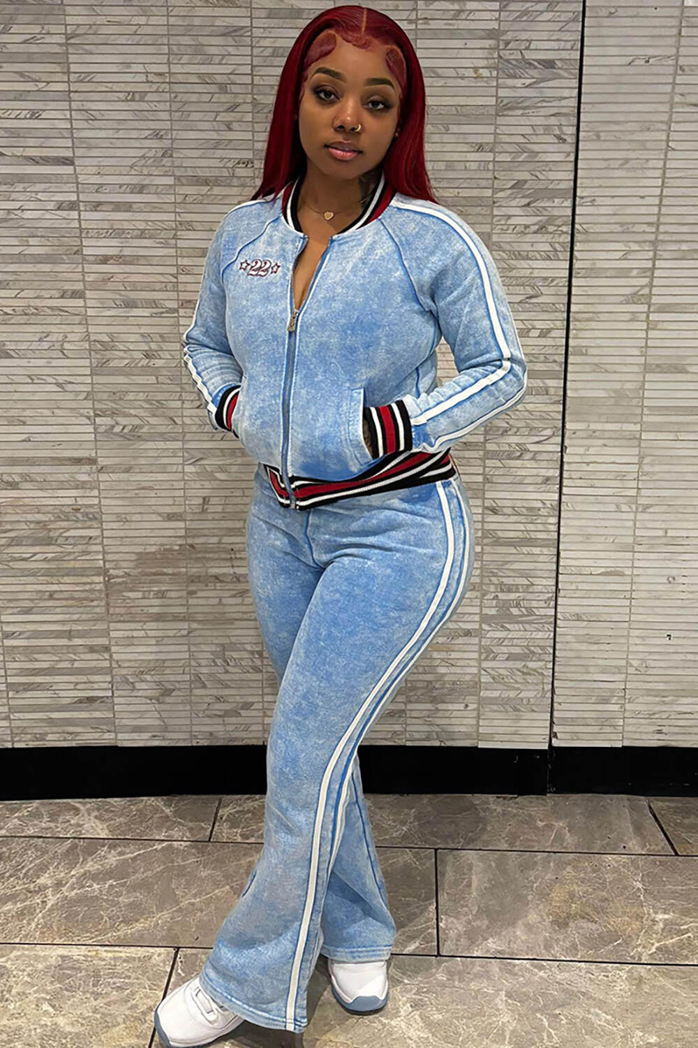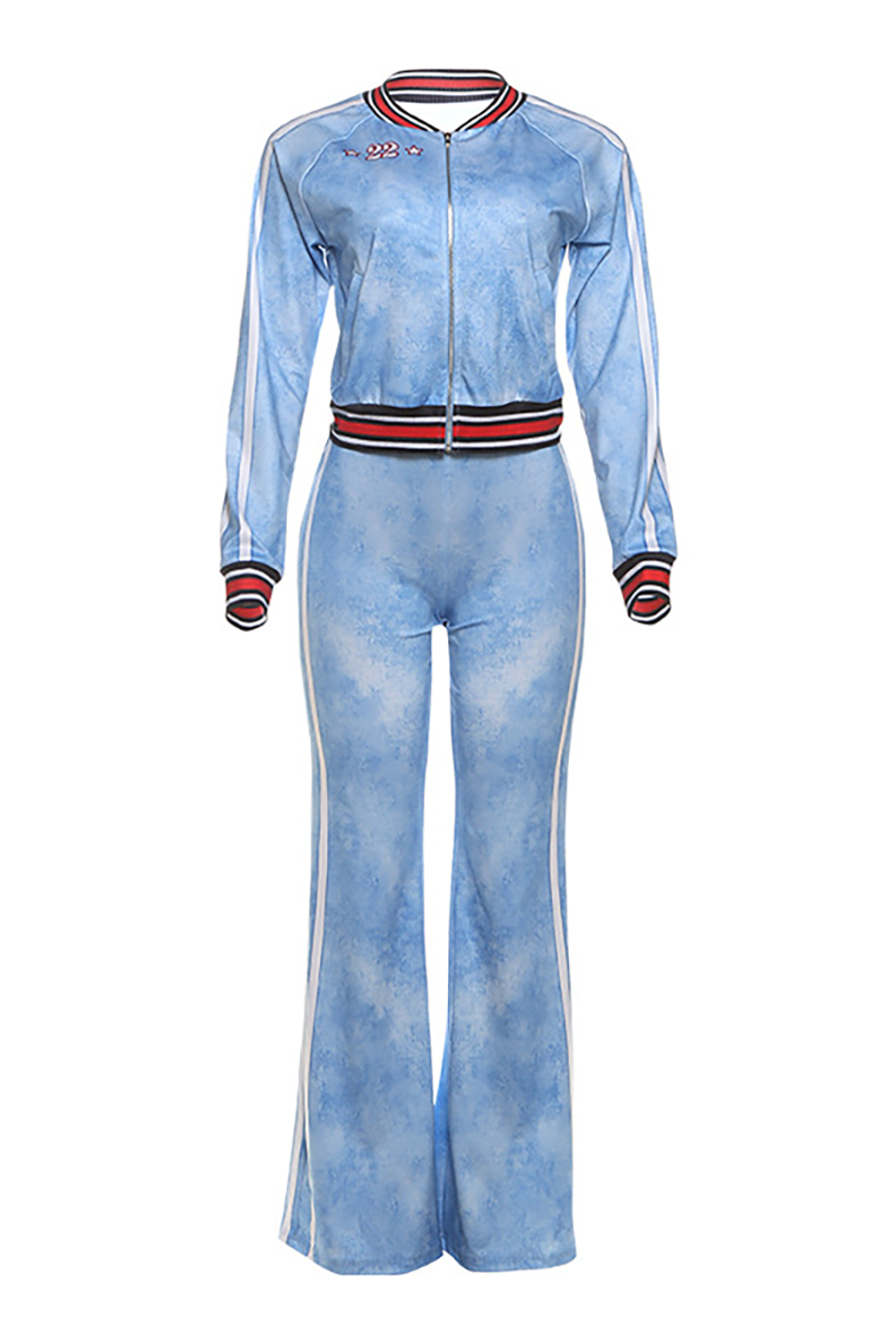 Colorblock Striped Long Sleeve Track Jacket Bootcut Pants 2pcs Set-Blue