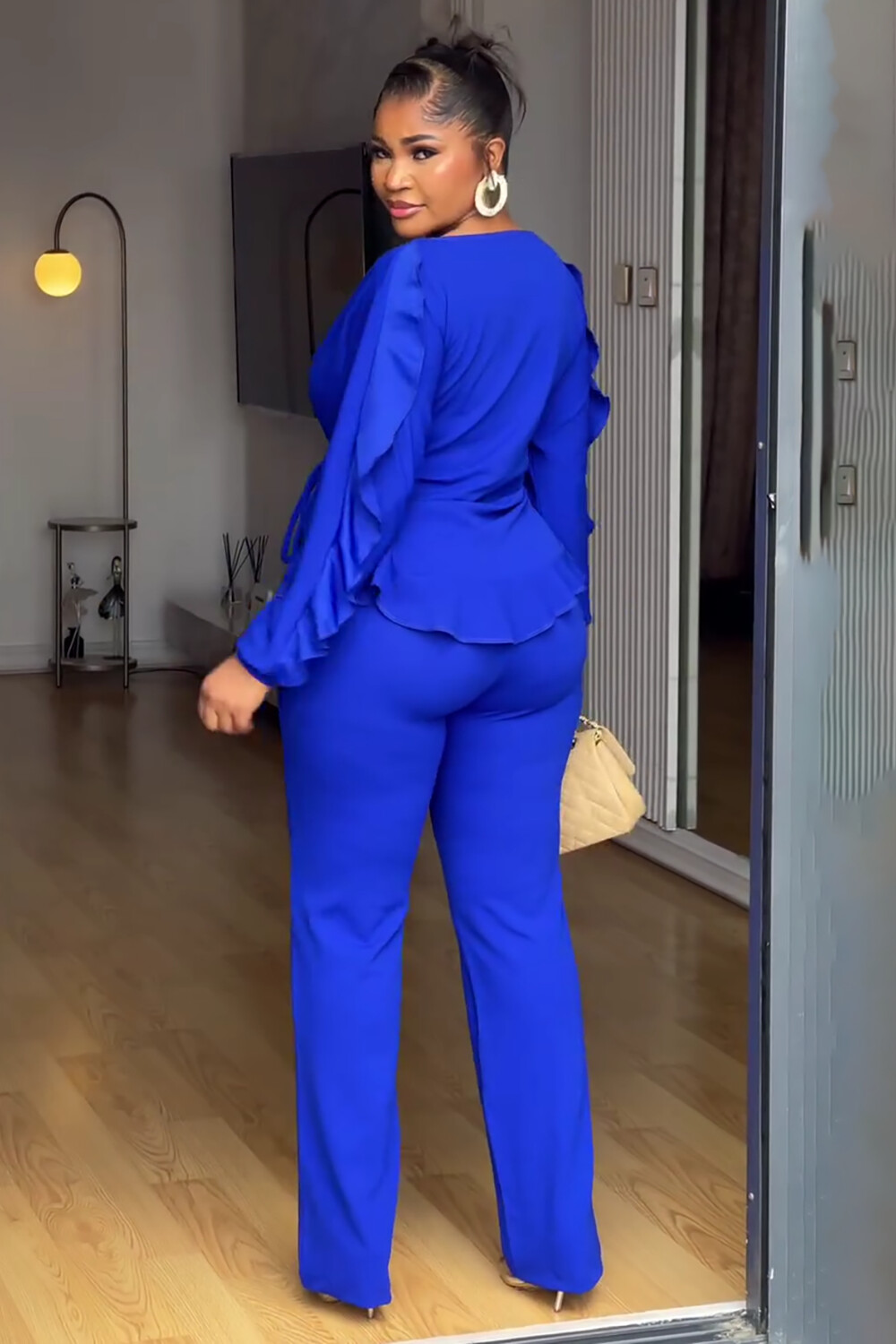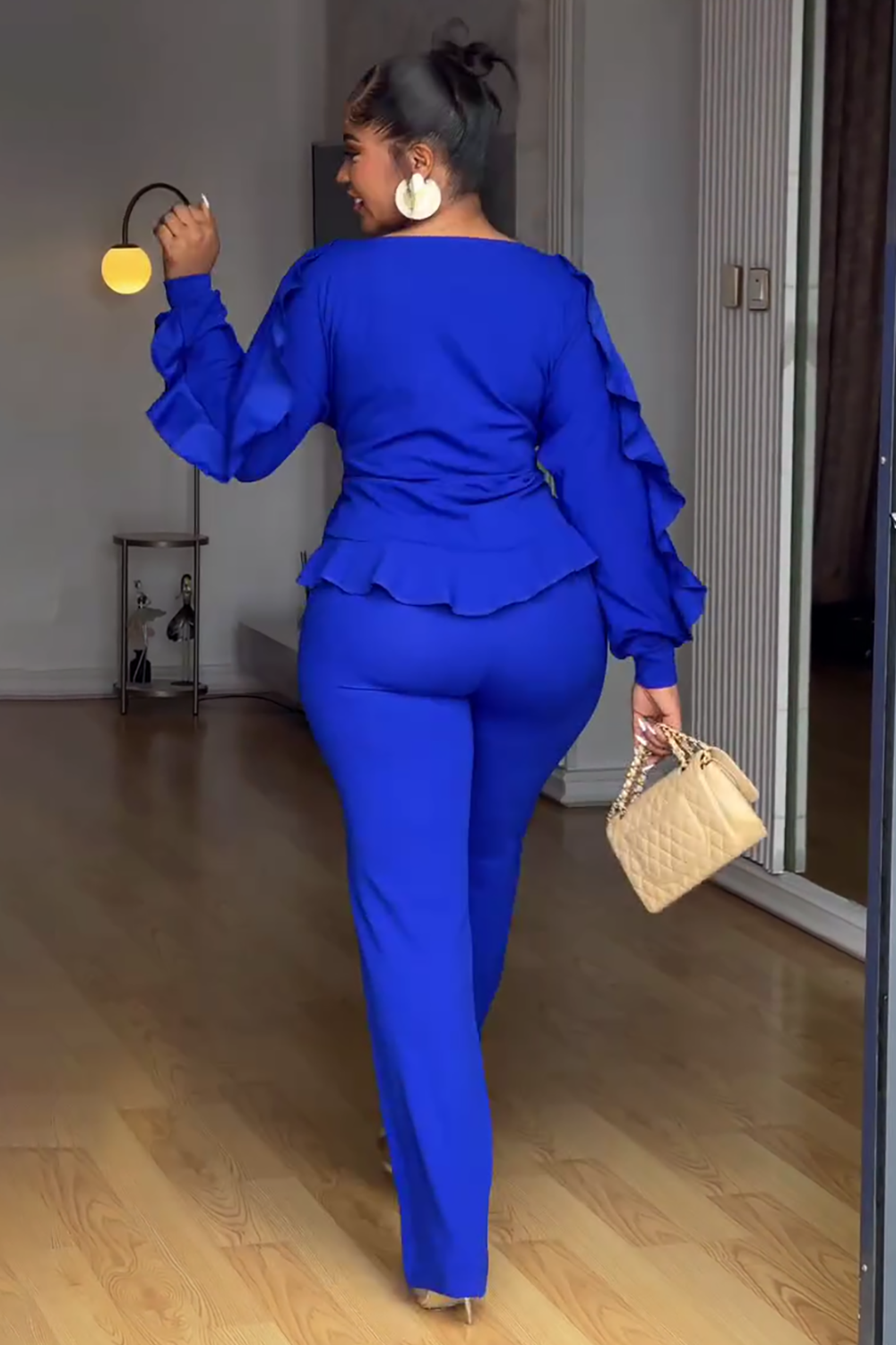 Long Sleeve Drawstring Cinch Waist Top Pants 2pcs Set-Blue