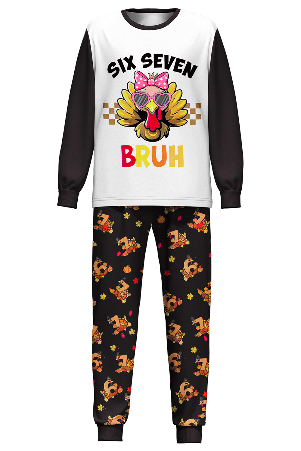 This SIX SEVEN set features a shades-wearing turkey with "BRUH" swag, rocking black and white style with tiny turkeys and fall prints all over. Super soft, totally fun—your kid will be the freshest at the holiday table. These unique SIX SEVEN pajamas make the ultimate holiday gift.