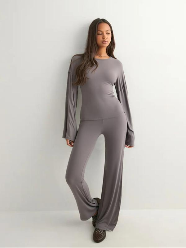 • Women's Fall New Round Neck Flare Long Sleeve Top & Elastic Waist Straight Leg Pants Set, Casual Fashion for Daily Wear