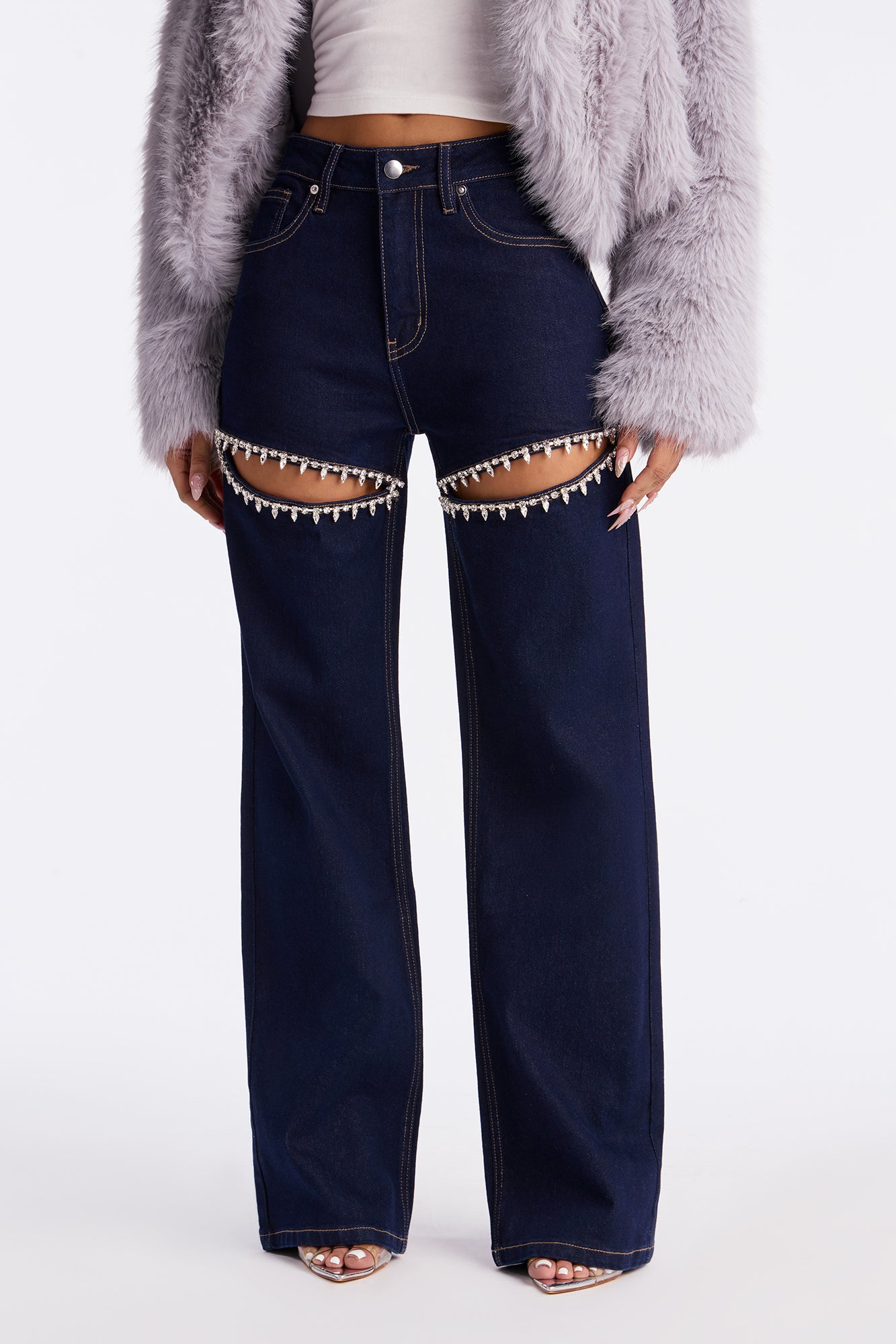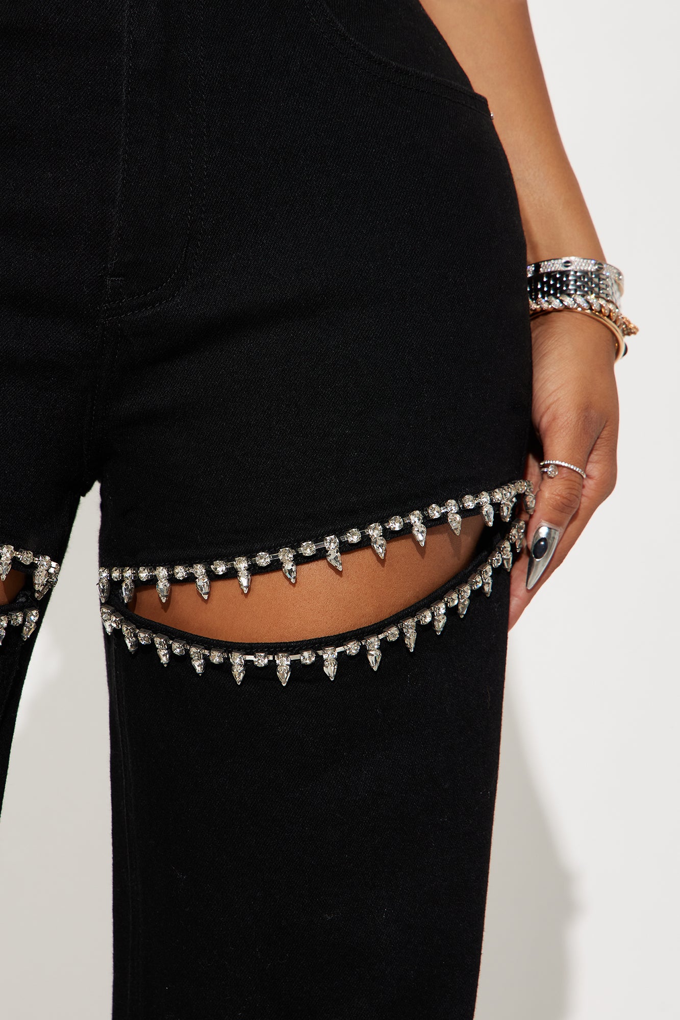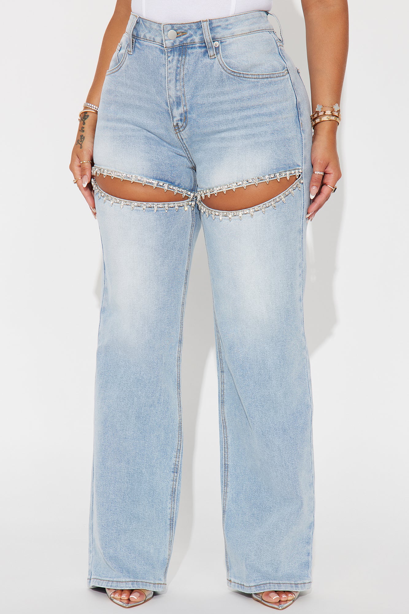Available In Black, Dark Denim And Light Wash.Straight Leg Jean5 PocketCut Out DetailEmbellished11.25" High Rise32" InseamLow StretchSelf: 73.9% Cotton 25.5% Polyester 0.6% SpandexImported