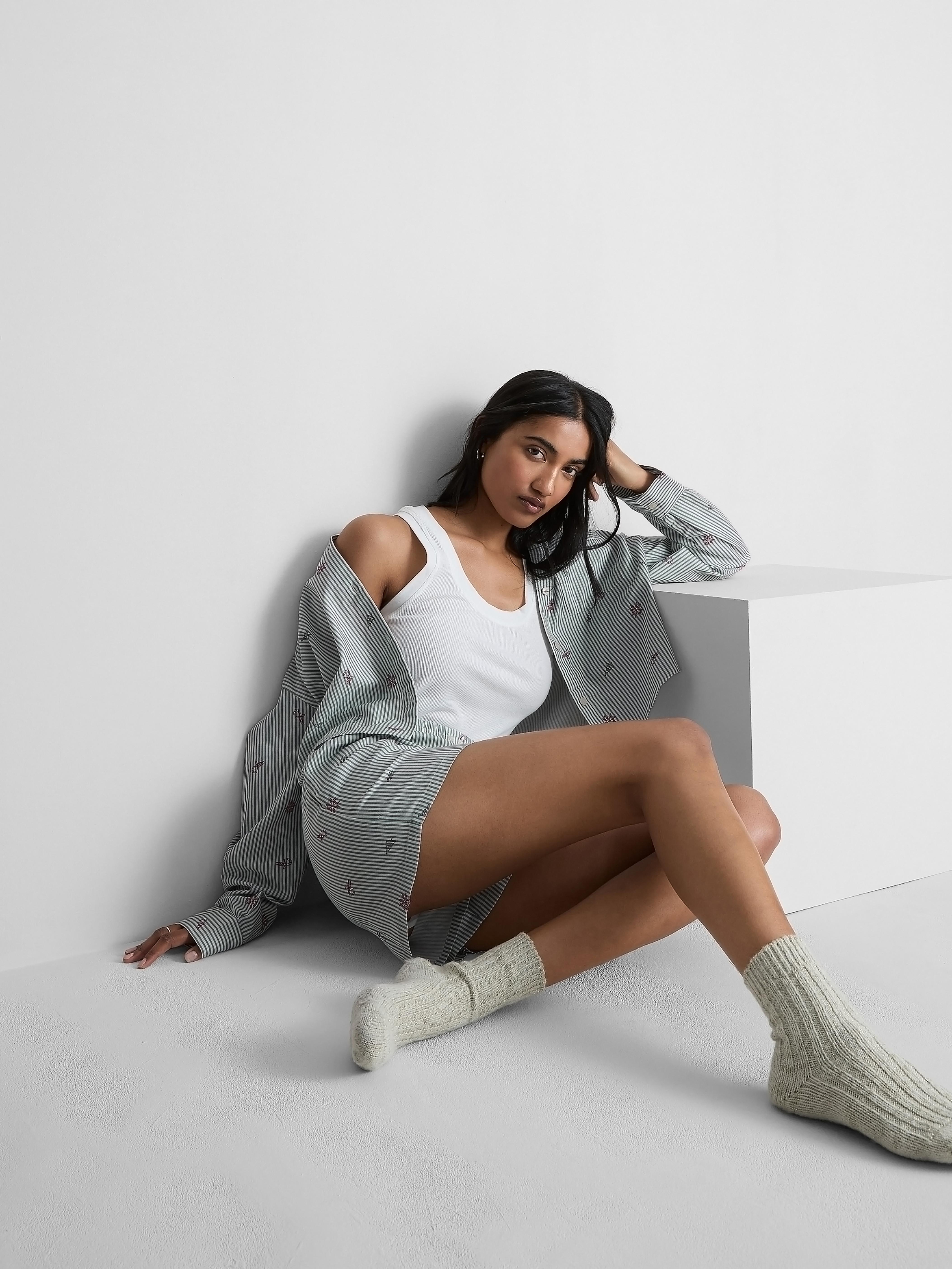 Made from a soft cotton, these striped pajama shorts have an allover Christmas inspired print