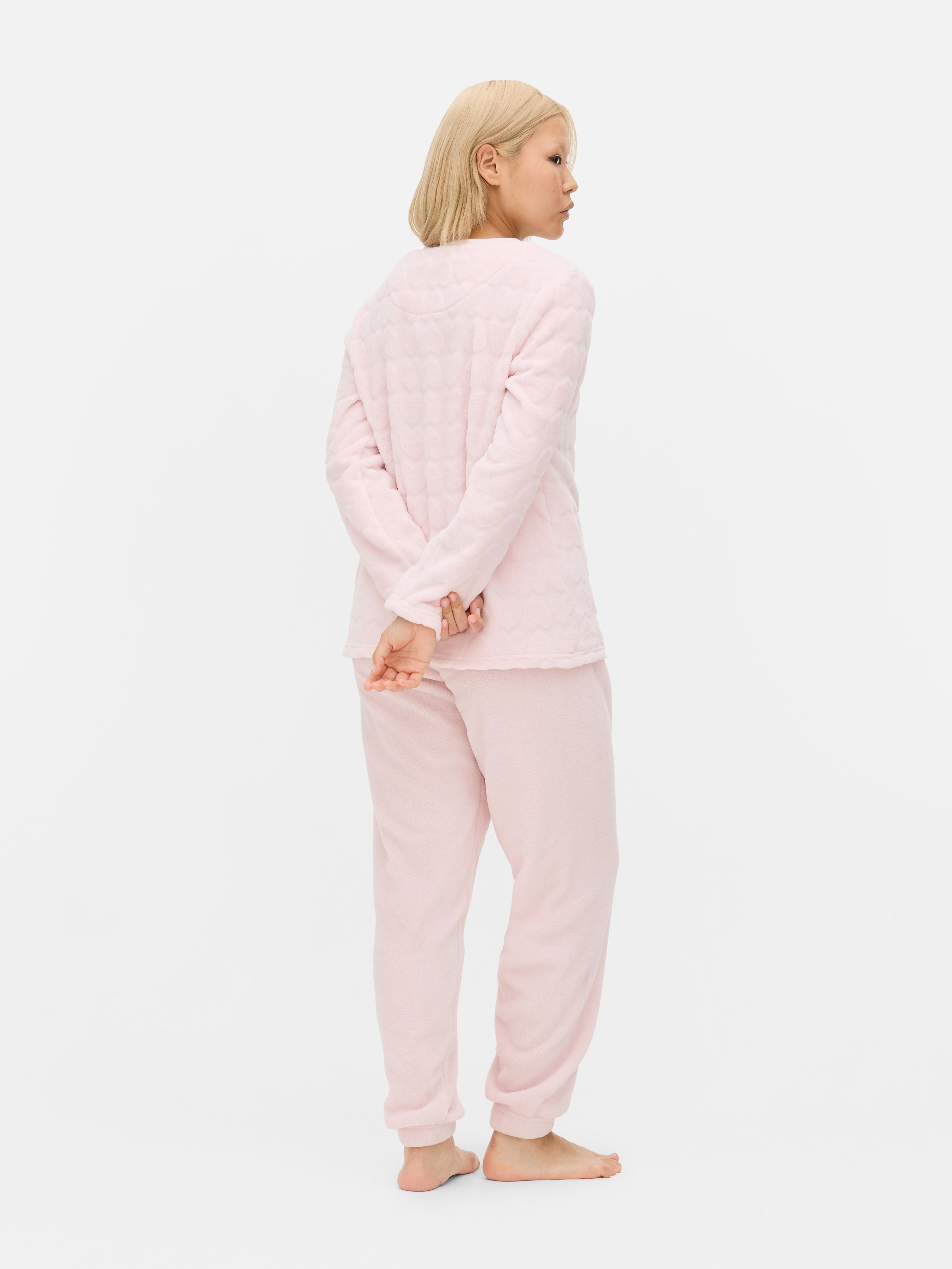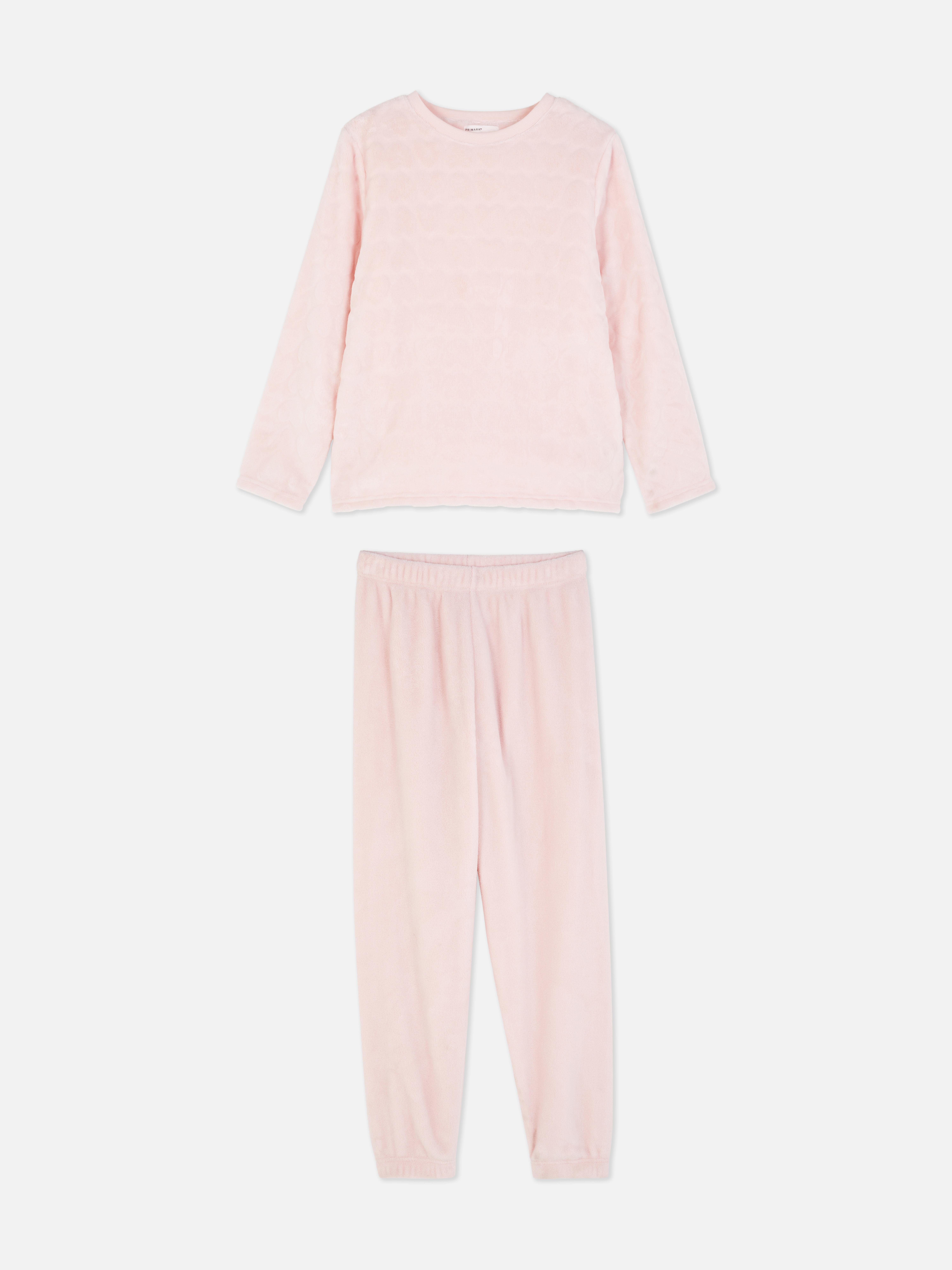 Get snug in seconds with this pyjama set. Made from super-soft, fluffy fabric, this two-piece comes in a cosy light pink shade that’s perfect for chilly nights. The long-sleeved top is embossed with hearts, has a classic crew neckline and relaxed fit, with a fleece finish for extra warmth. The bottoms are just as comfy, designed with a loose fit and gathered ankles to help keep the cold out. Whether it’s bedtime or sofa time, this set brings all the cosy vibes.