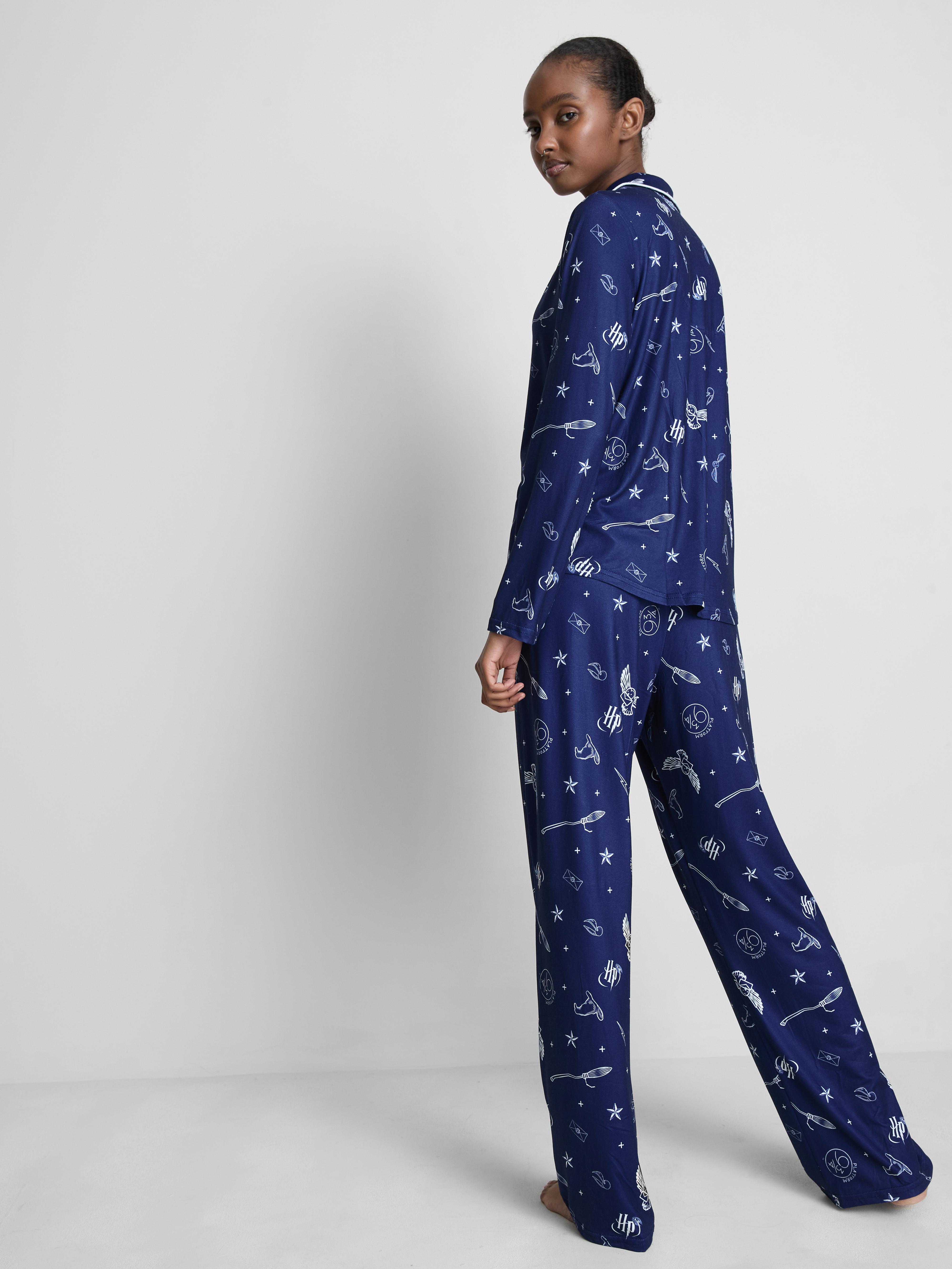 Settle in for a spellbinding night with these Harry Potter™ boyfriend pyjamas. This two piece set includes a button-up shirt and full-length trousers, both covered in a magical all-over print on a deep navy base. White piping trims the collar, placket, cuffs, and hems for a classic finish, while the elasticated waistband keeps things comfy all night long. Made from soft, lightweight fabric and designed with a relaxed fit, it’s perfect for lounging or drifting off to dreamland — Hogwarts style.