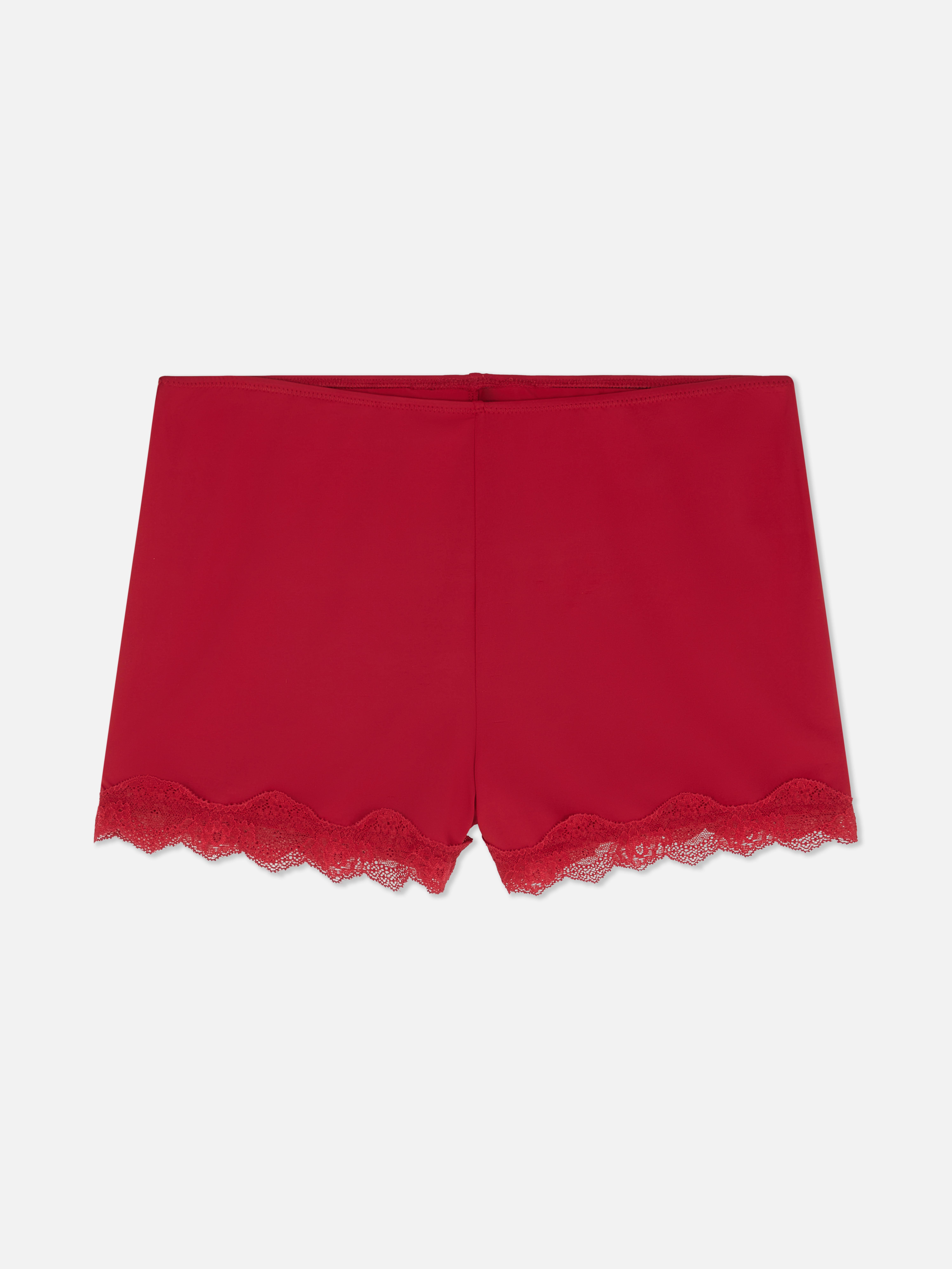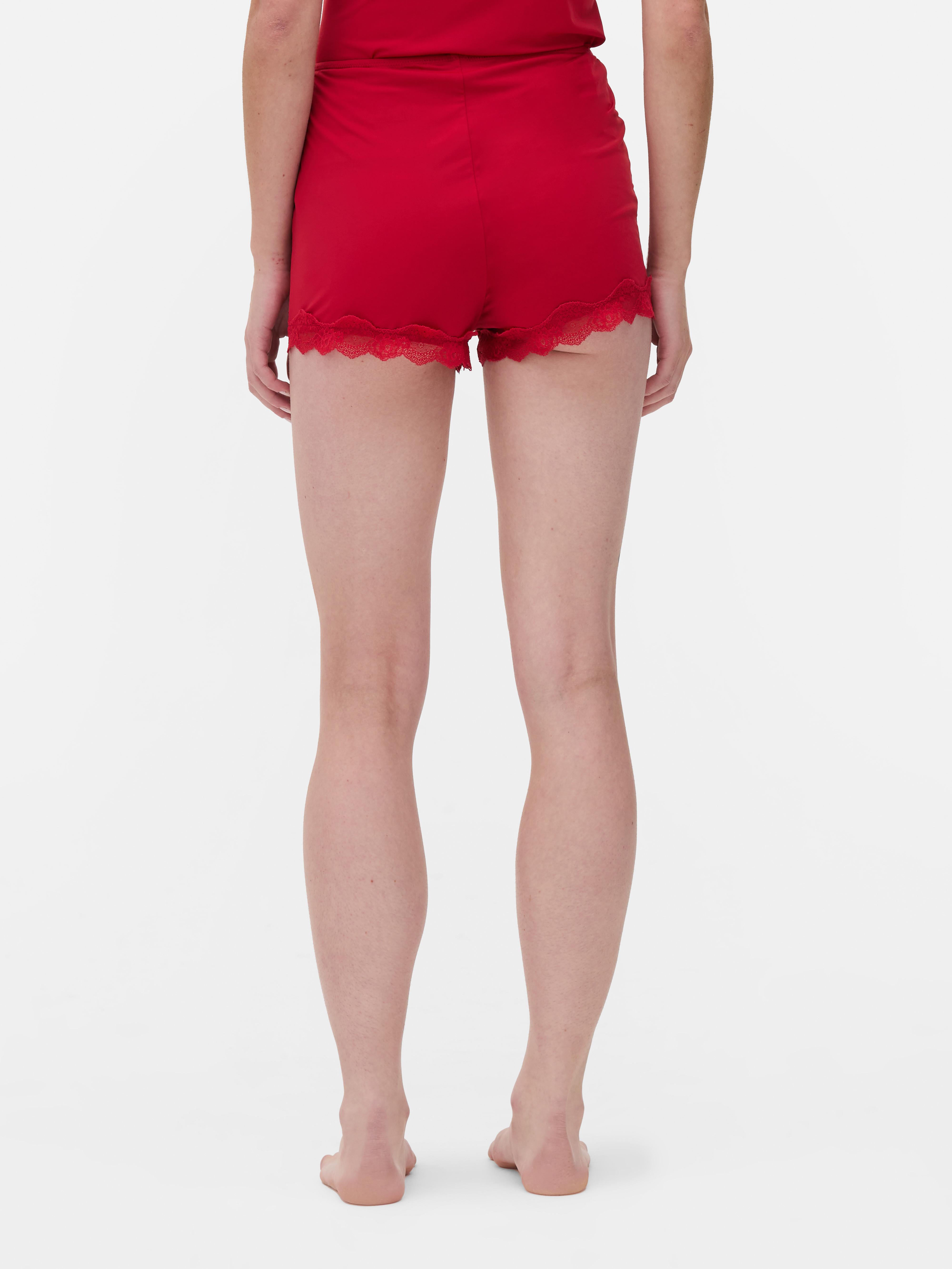 In a soft, slinky fabric, these shorts come with an elasticated waist and are finished with a lace trim