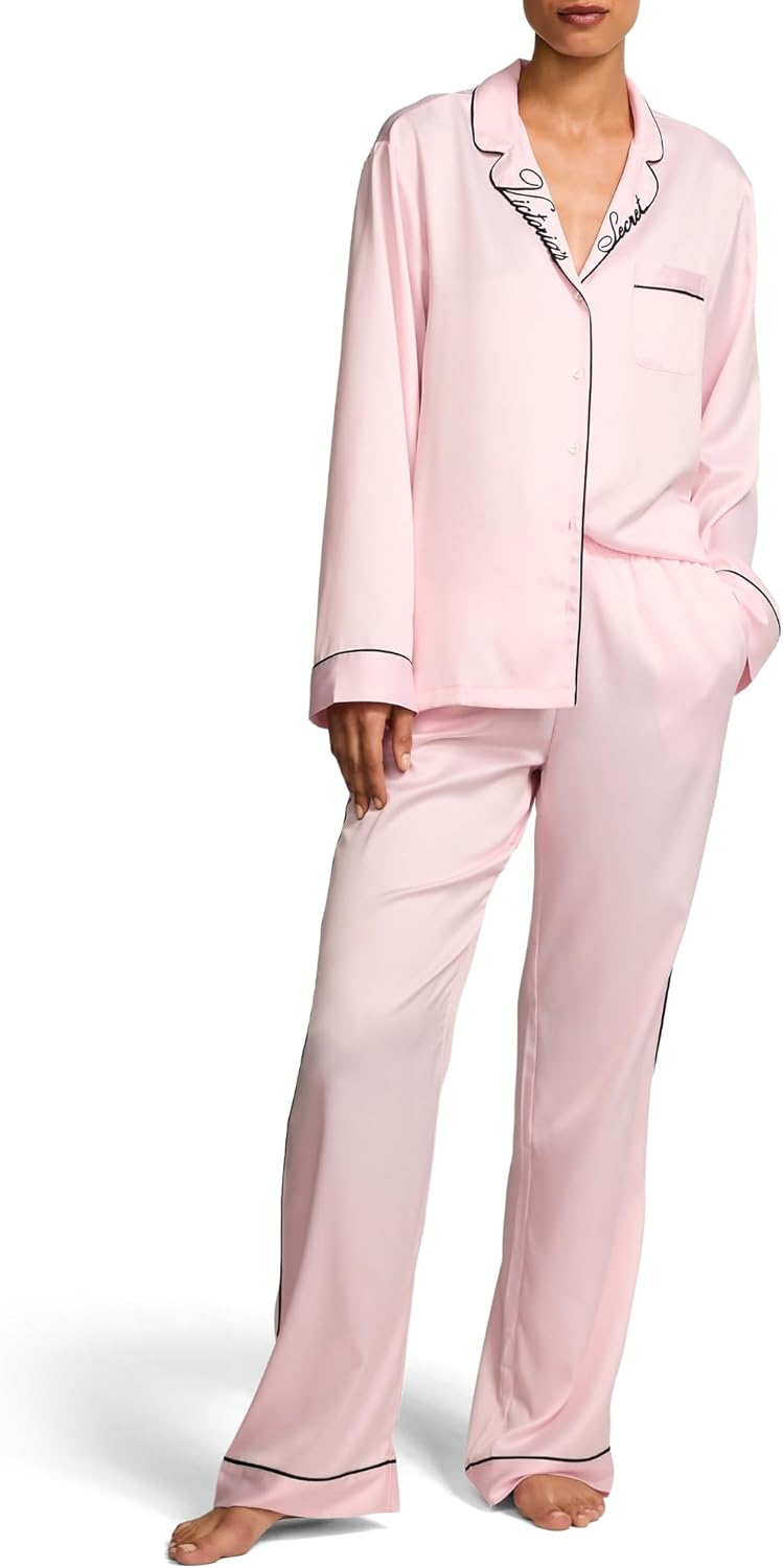 • Now entering sleep mode. Relax in this satin pant and matching long sleeve top.