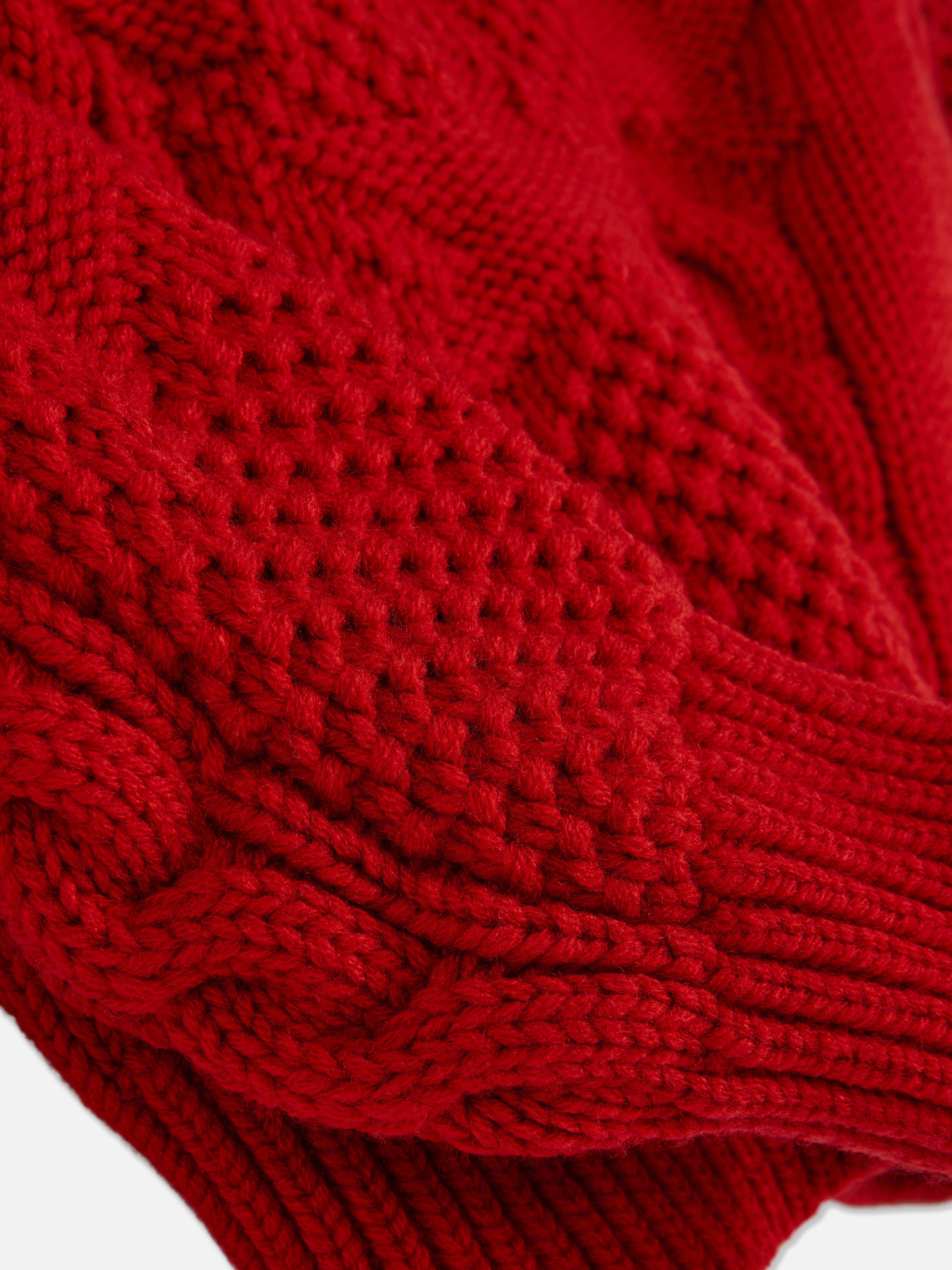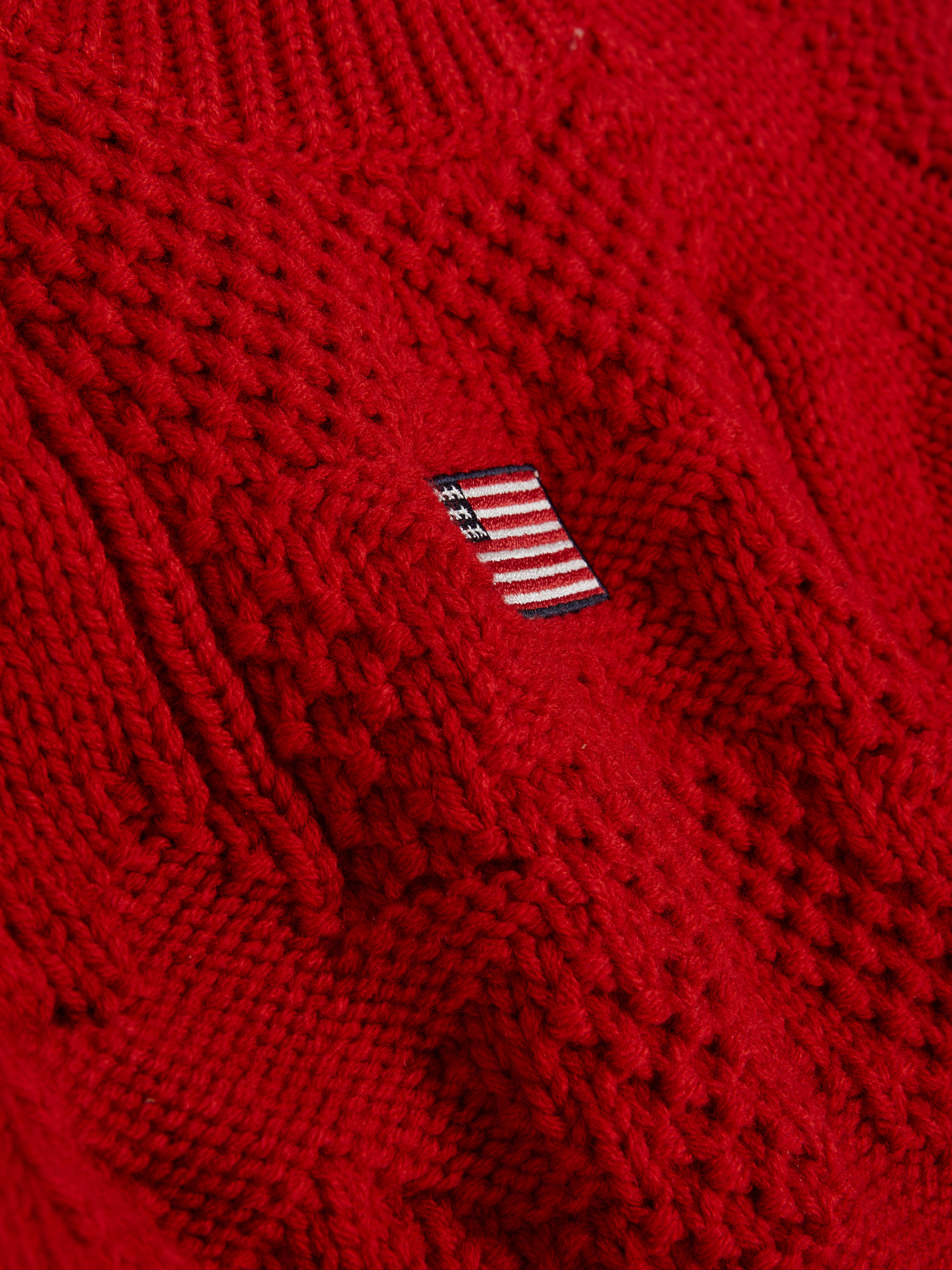 This bold cable knit jumper is a statement piece with a patriotic twist. The intricate cable knit texture adds depth, while the striking red hue ensures a standout look. Featuring an American flag design on the front, this jumper blends classic and contemporary styles. The crew neckline and long sleeves with ribbed cuffs provide a snug feel, while the slightly cropped fit gives it a modern edge. Pair it with high-waisted jeans for an effortlessly stylish outfit, or layer it over a collared shirt for a preppy touch.