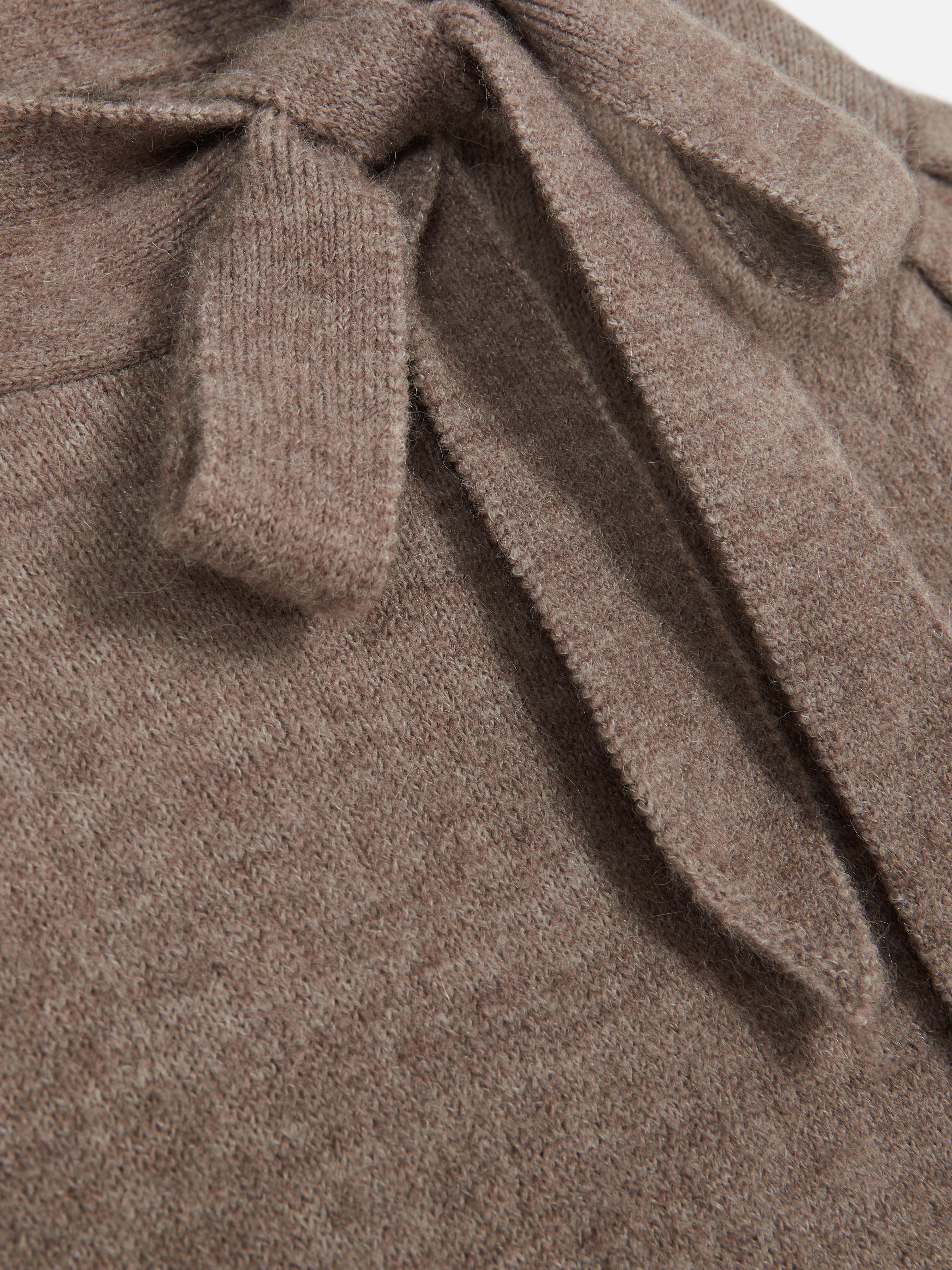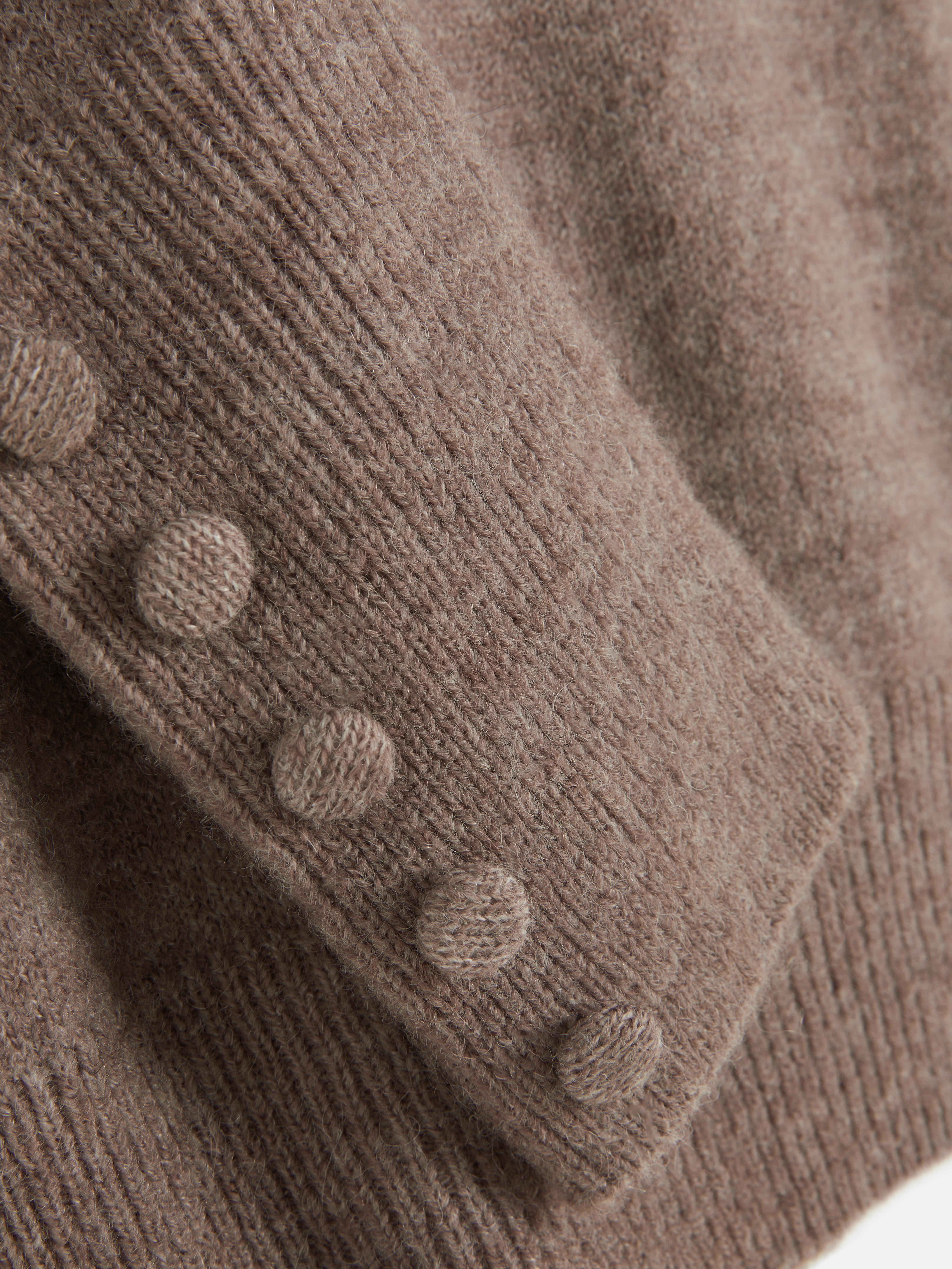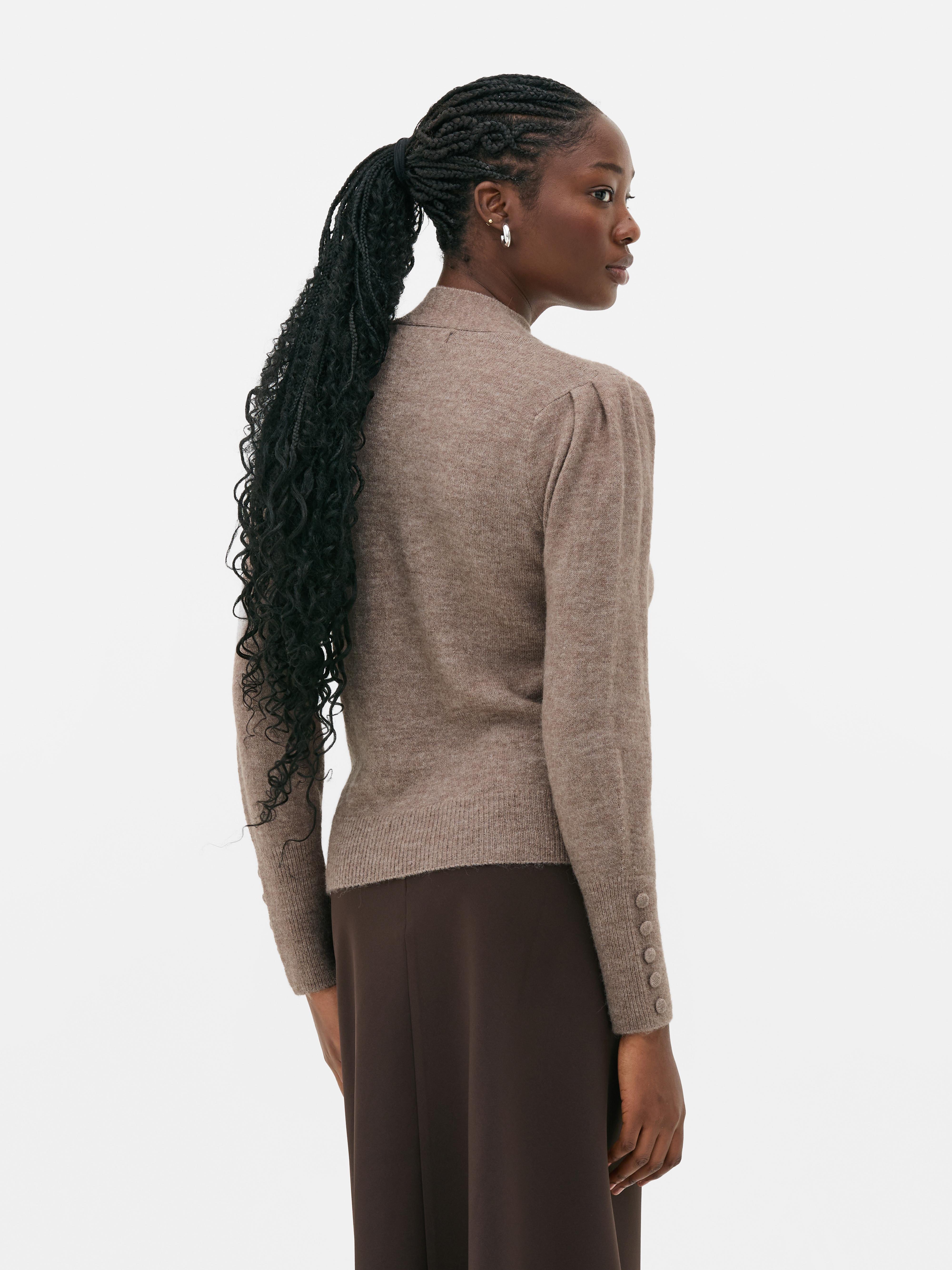 Full of pretty details, this sweater has a high neck with a bow on the collar and long sleeves finished with button detailing in a regular length and fit