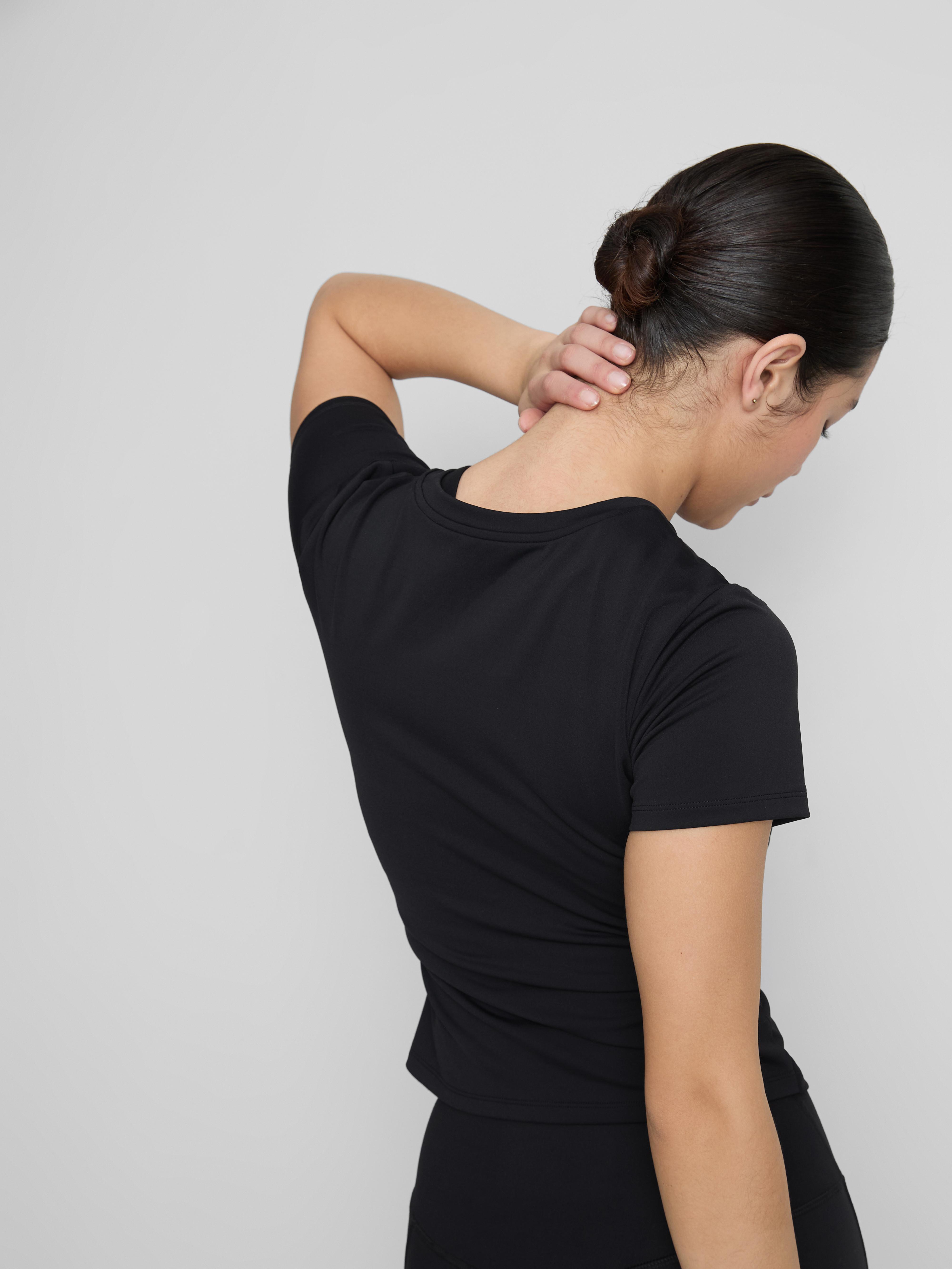Experience comfort like never before with this buttery soft fitted tee in a classic black shade. Made from a smooth, stretchy fabric, it hugs your body gently while keeping you comfortable all day long. The crew neck and short sleeves create a timeless look that works perfectly on its own or layered up. Pair it with the matching leggings for an easy, coordinated outfit that feels as good as it looks.