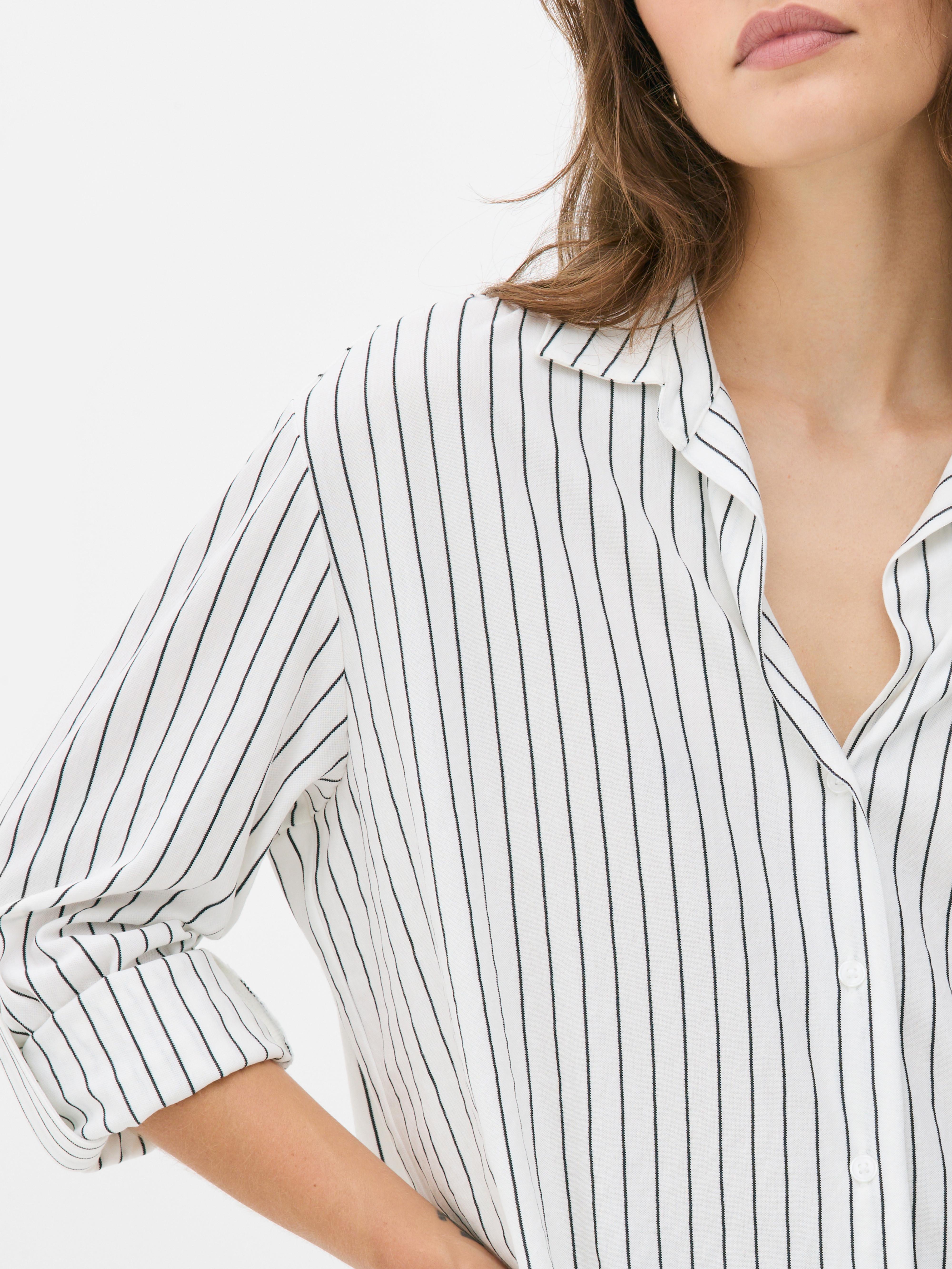 Give your everyday wardrobe a smart update with this classic striped jersey shirt. Designed with a timeless black and white pinstripe pattern, it’s cut in a regular fit from soft jersey fabric for comfort and ease. The V-neckline and classic collar keep things polished, while the button-up front and long sleeves add those tailored touches. Finished with a curved hemline, it’s perfect for tucking into trousers or leaving loose over jeans. Whether for workdays or weekends, this shirt is an easy go-to for a crisp yet relaxed look.