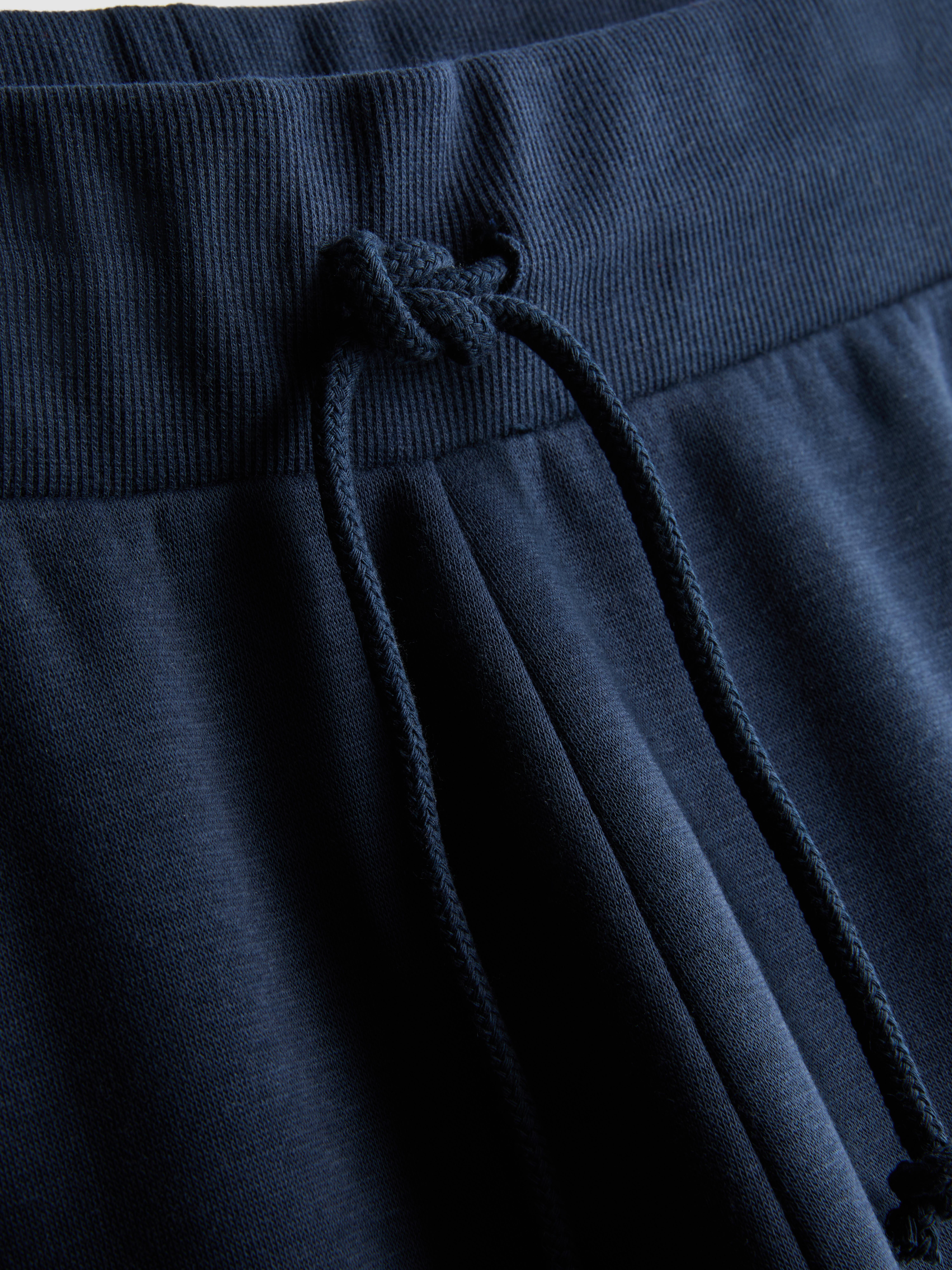 Settle into comfort with these cotton blend skinny joggers. Made in a navy shade, they have a tapered leg, cuffed ankles and a soft, brushed feel that’s ideal for easy days. The elasticated waistband and adjustable drawstring help you find your perfect fit and the side pockets keep small essentials close. A small print sits below the waistband, adding a simple graphic touch. Great for lounging, light activity or relaxed outings, they bring comfort without fuss.