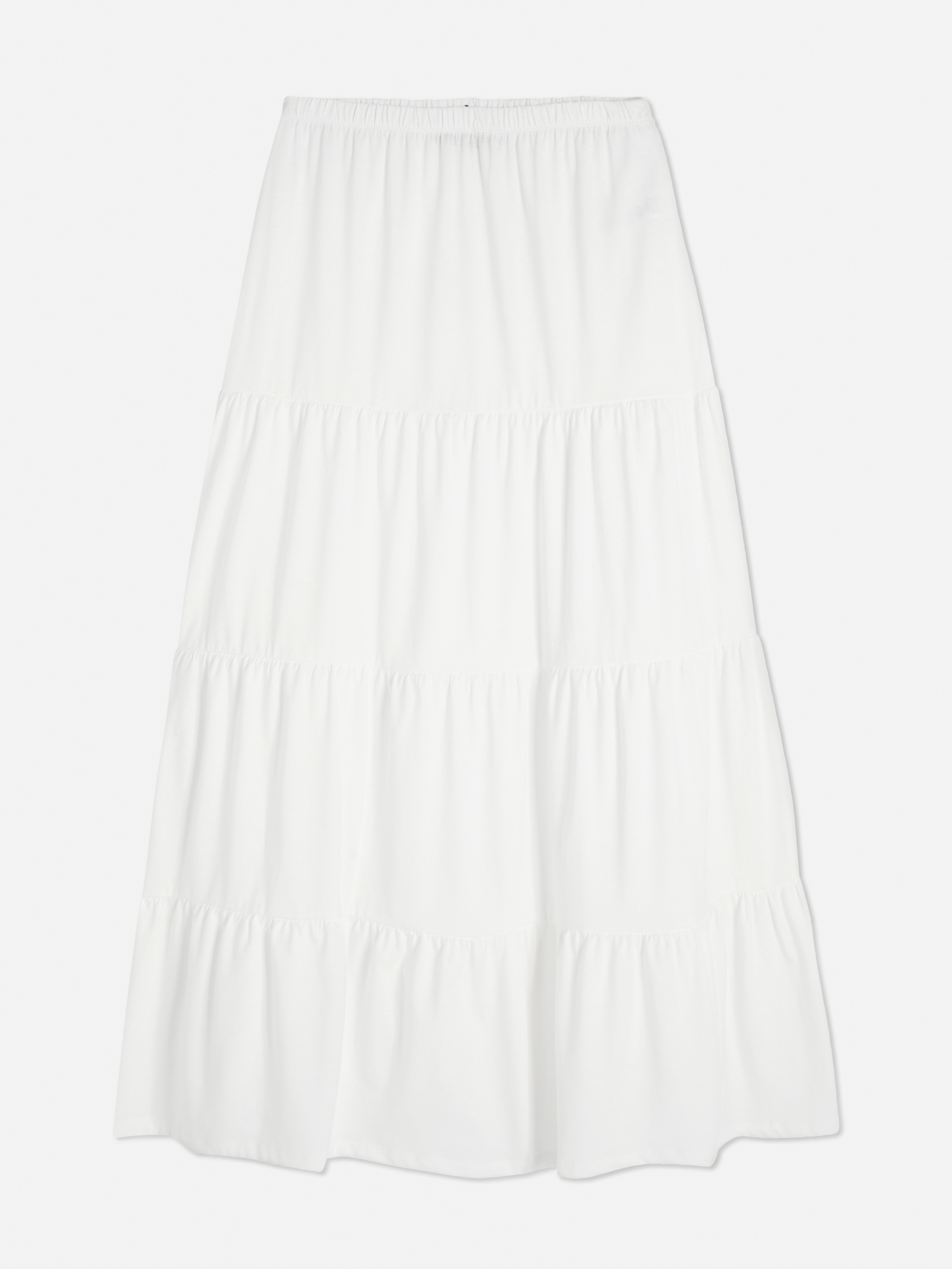 Step into easy style with this white tiered maxi skirt. Made from 100% cotton, it's light, breathable and full of movement. The gathered tiers create a flowy silhouette that swishes with every step, while the wide waistband adds comfort for all-day wear. Whether you're pairing it with a fitted top or a tucked-in tee, this ankle-skimming skirt is ready to go wherever the day takes you.