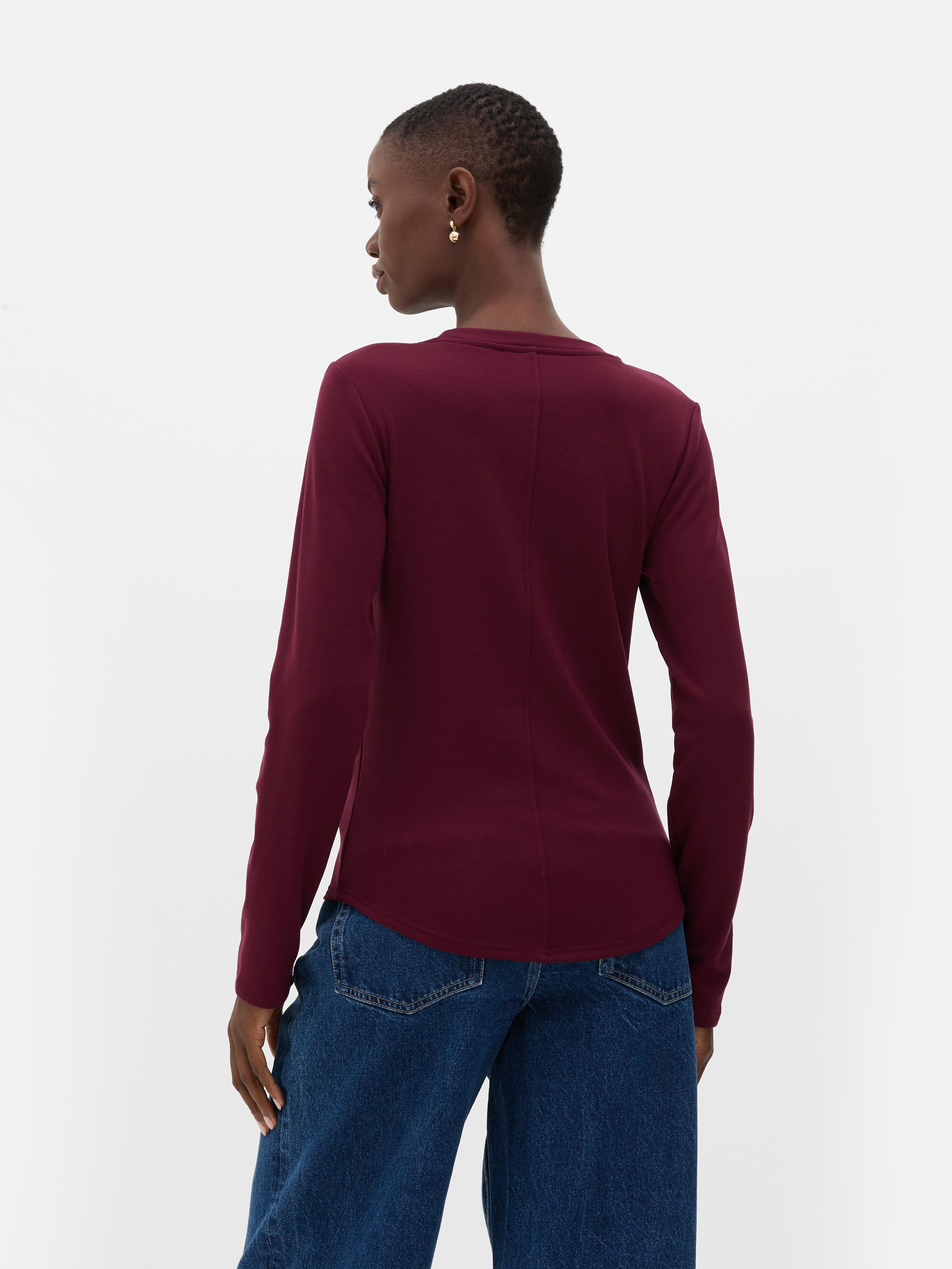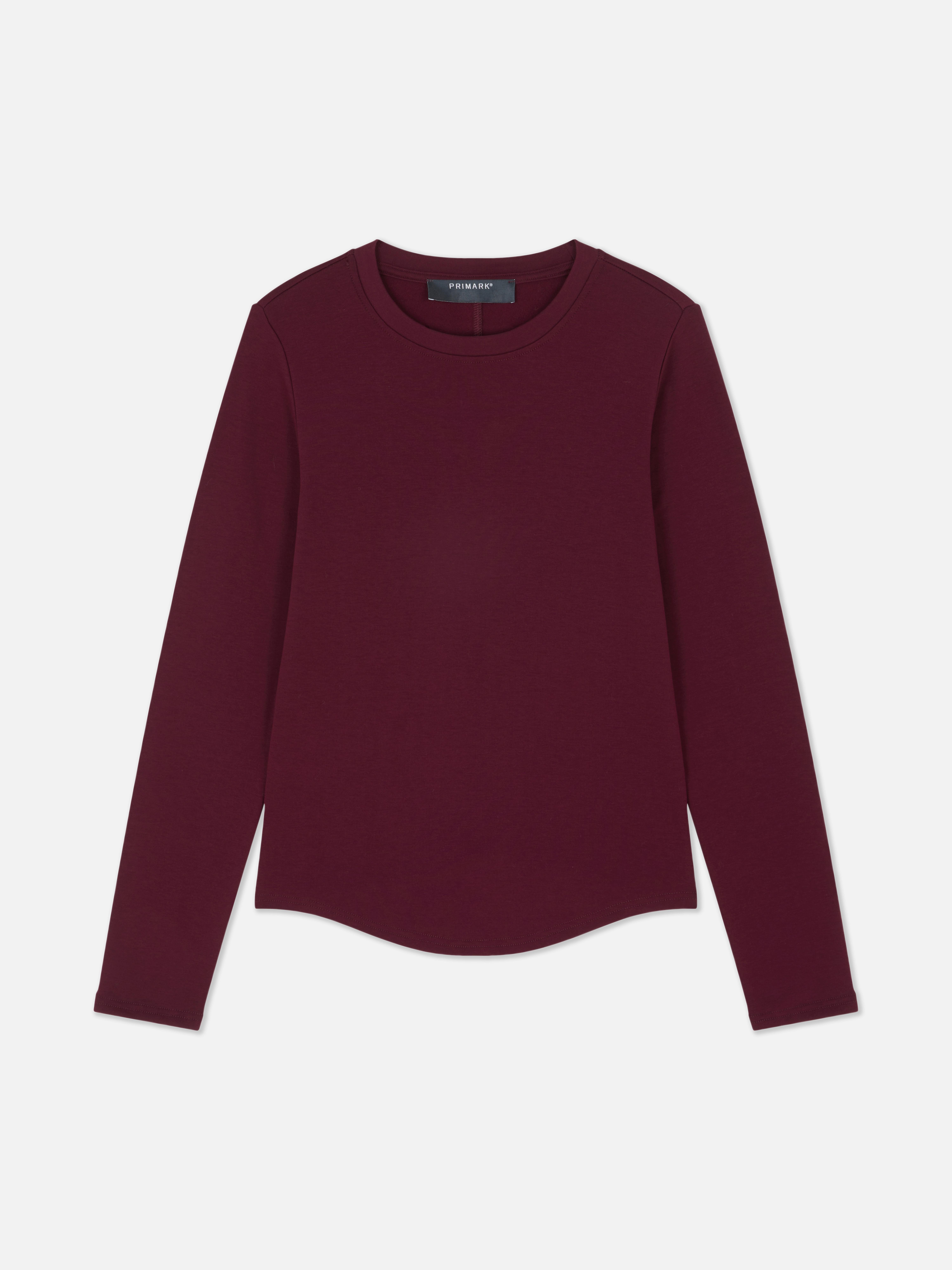 Wrap yourself in softness with this cosy long sleeve top. Made from a comfy fabric in a burgundy shade, it’s perfect for layering or wearing solo. The fitted silhouette hugs gently, while the crew neckline keeps things classic. A subtle curved hem adds shape and interest to the design, making it easy to tuck in or leave out. Whether you’re relaxing at home or heading out, this top brings warmth and versatility to your everyday wardrobe.