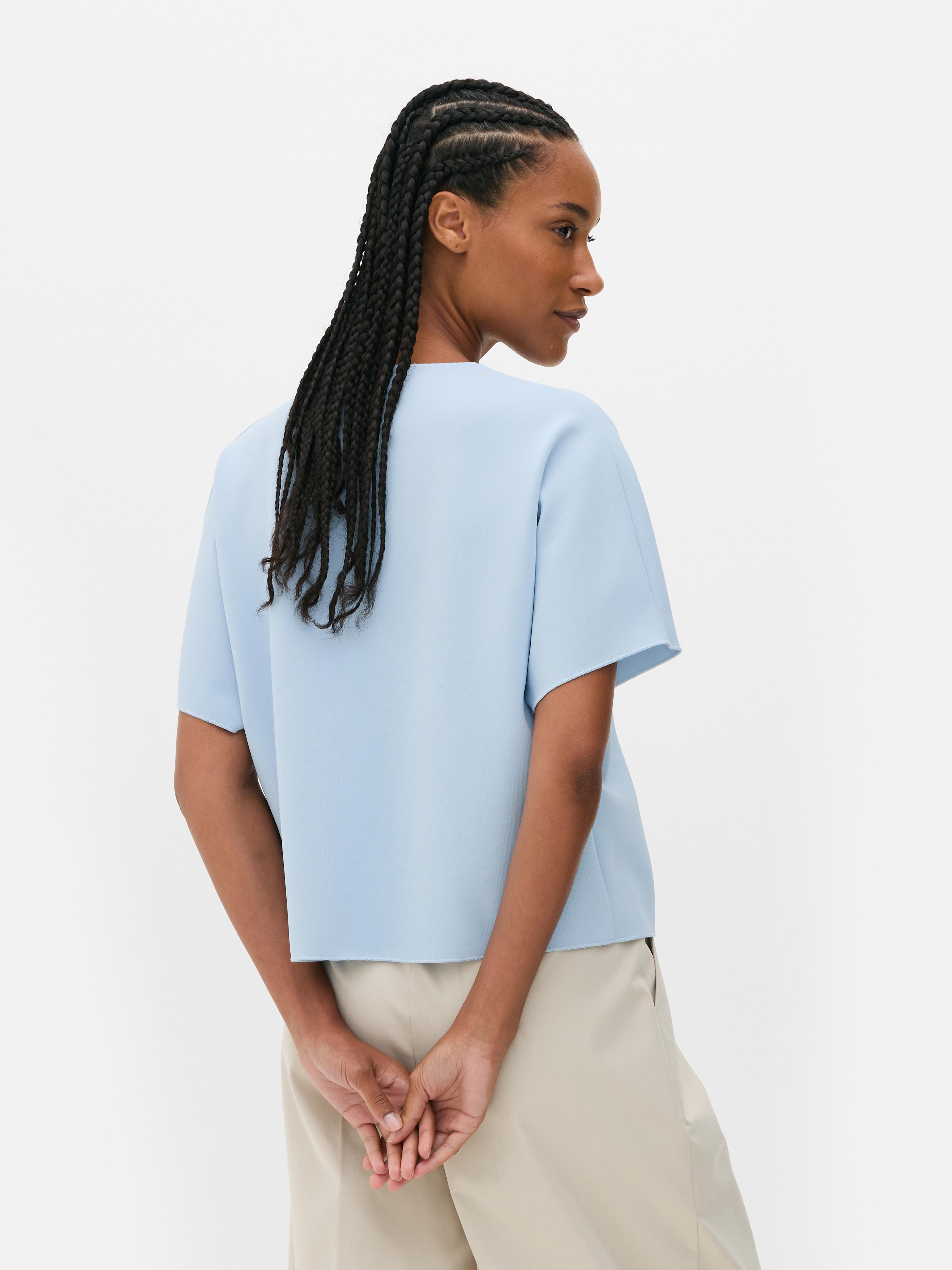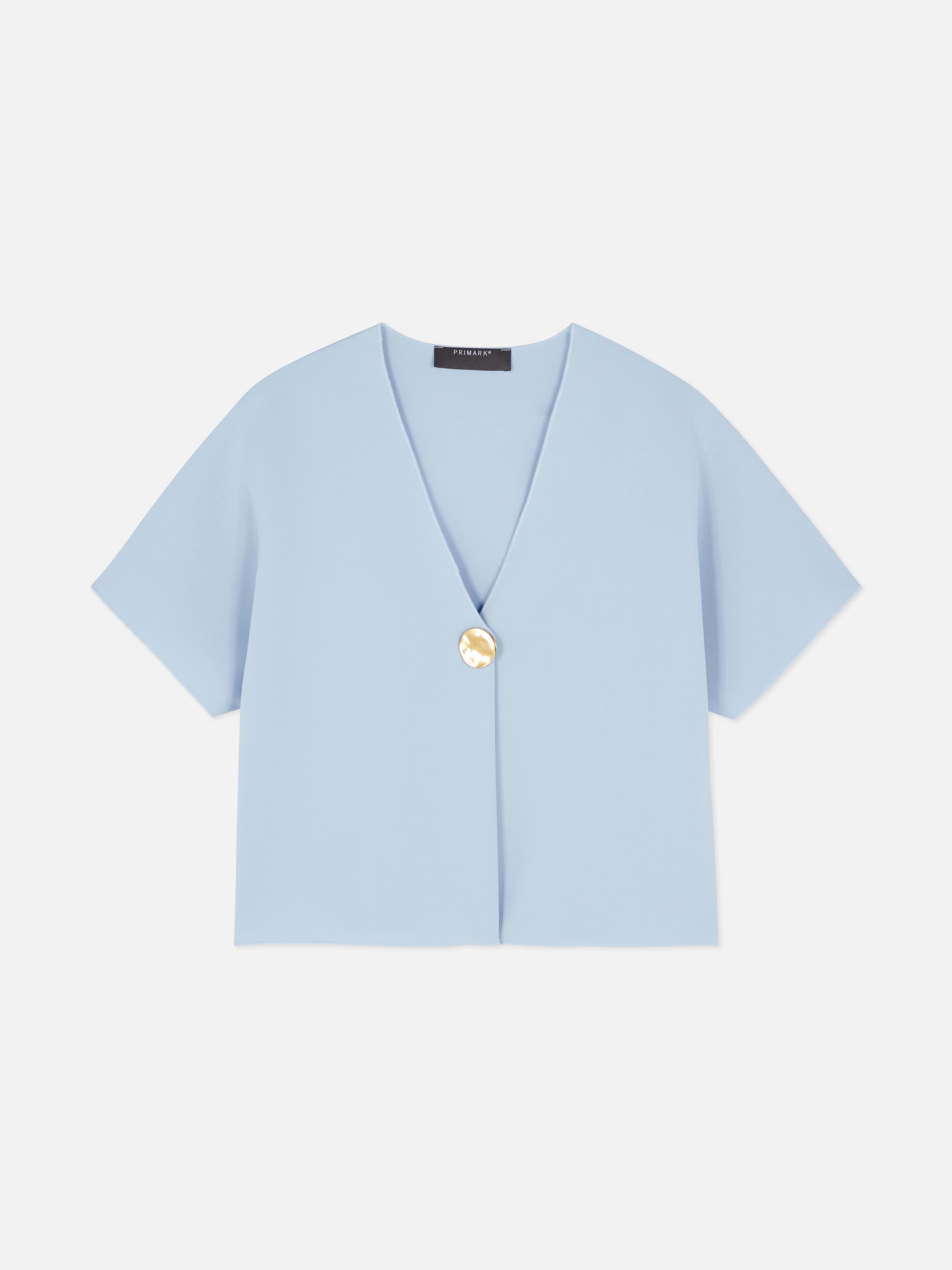 Soft colour, easy shape - this crepe V-neck cardigan is made for those in-between days. In a light blue tone with a gently textured finish, it’s designed with short sleeves, a straight hem and a relaxed, slightly boxy fit. The standout detail? A single statement button that closes the front and adds a clean touch. Light enough to wear solo and easy to layer, it’s the kind of piece you’ll reach for again and again.