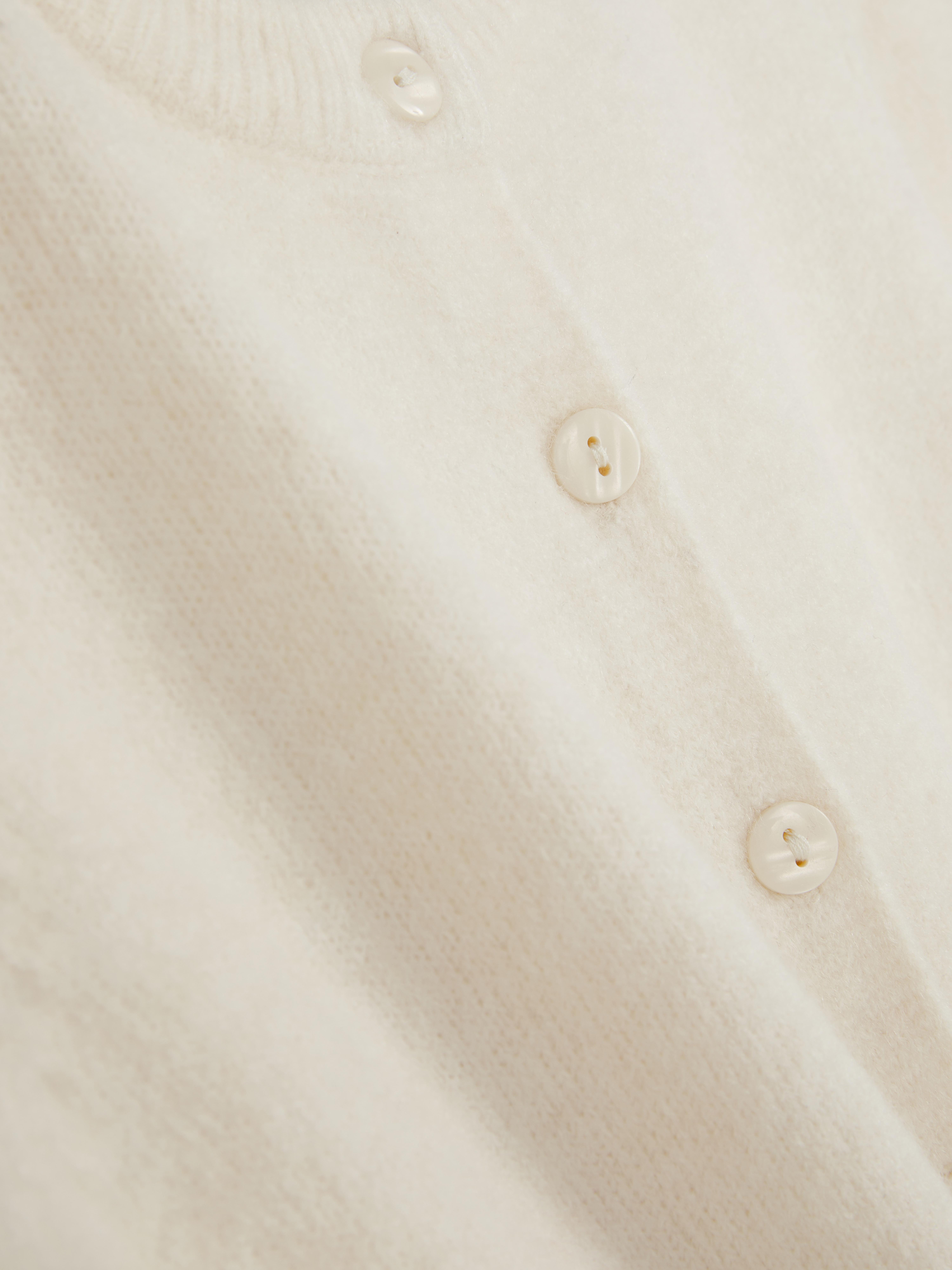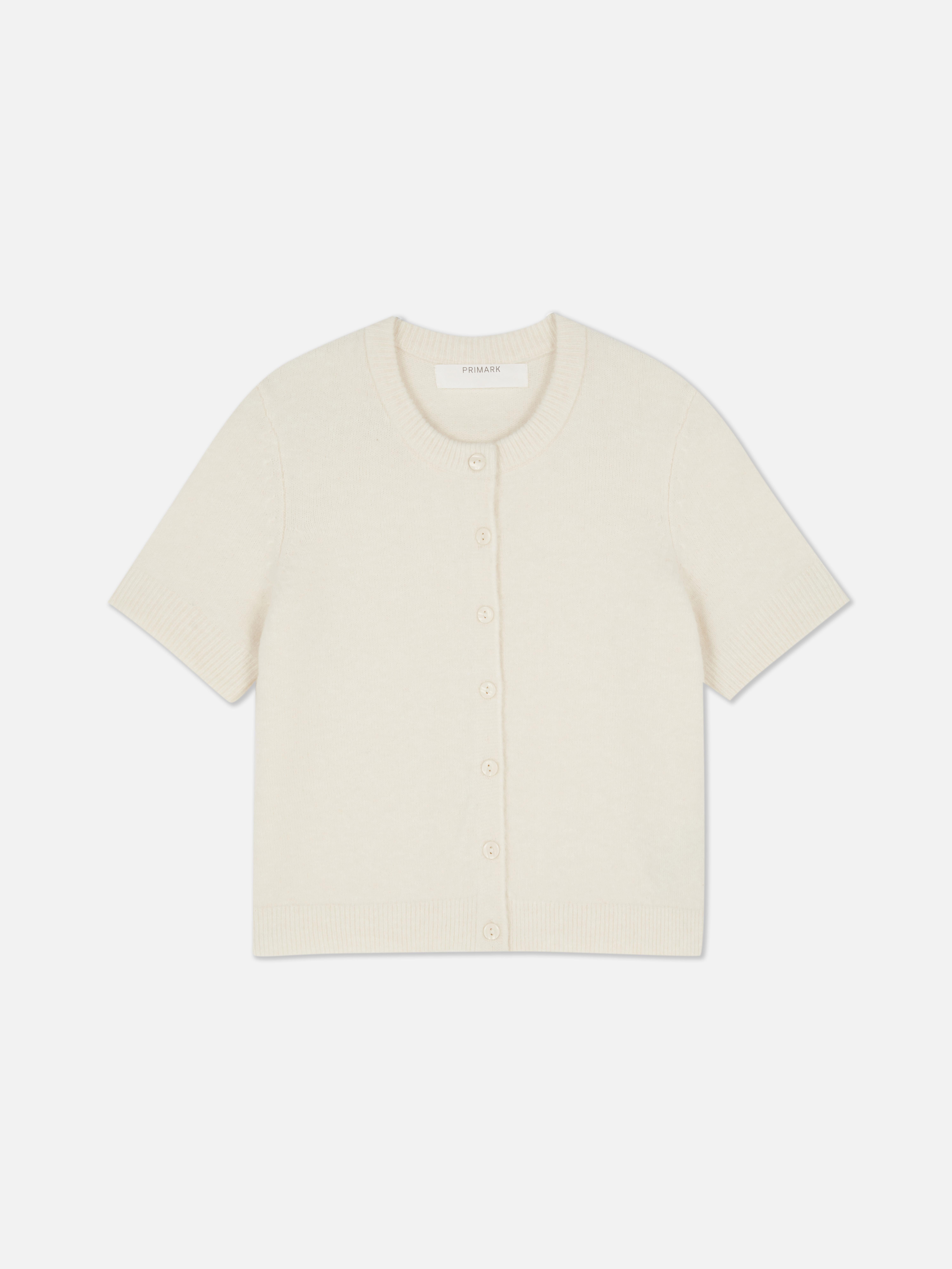 This cropped cardigan comes with short sleeves, a crew neck, and a button-up front in a soft-touch finish