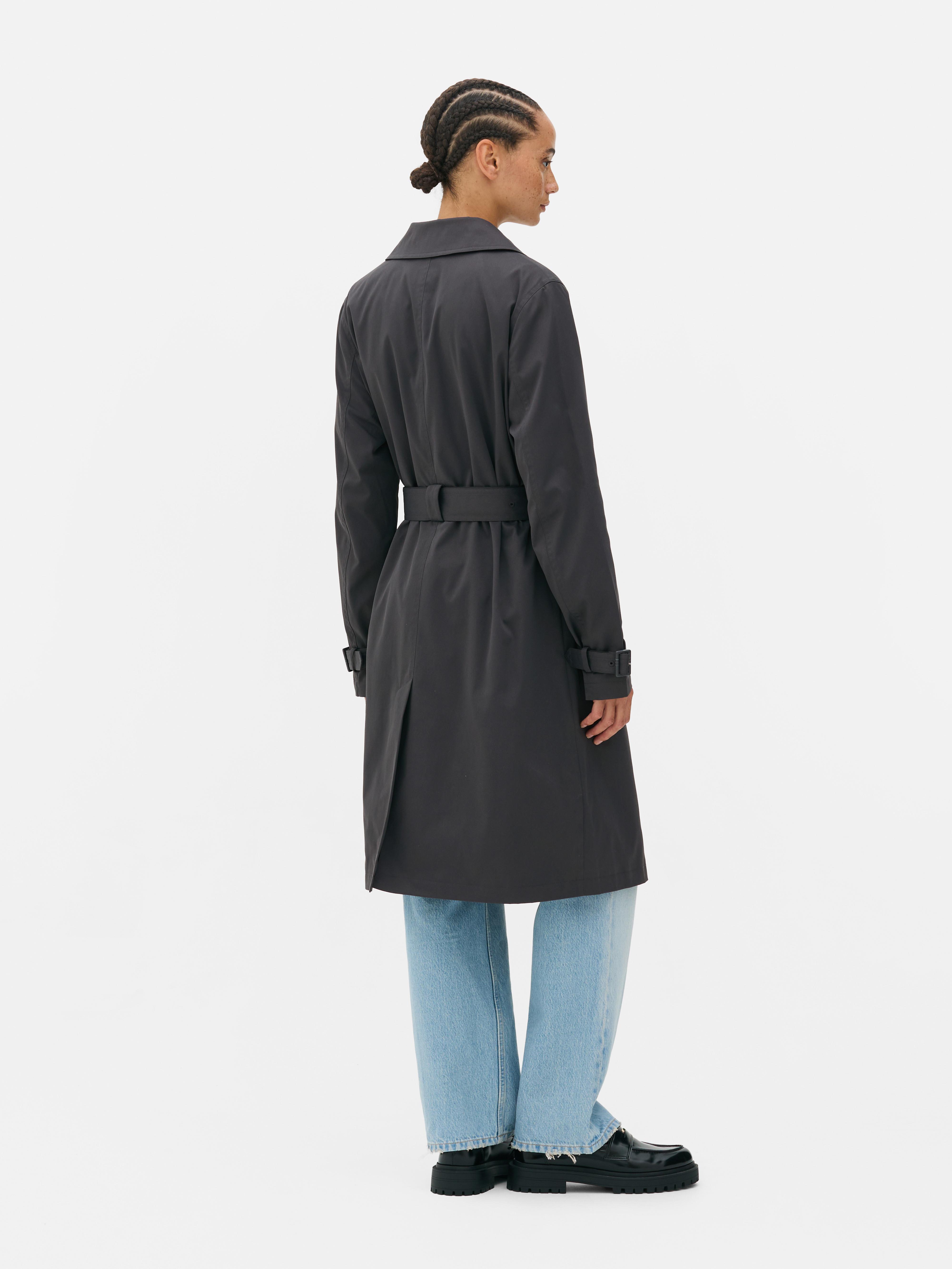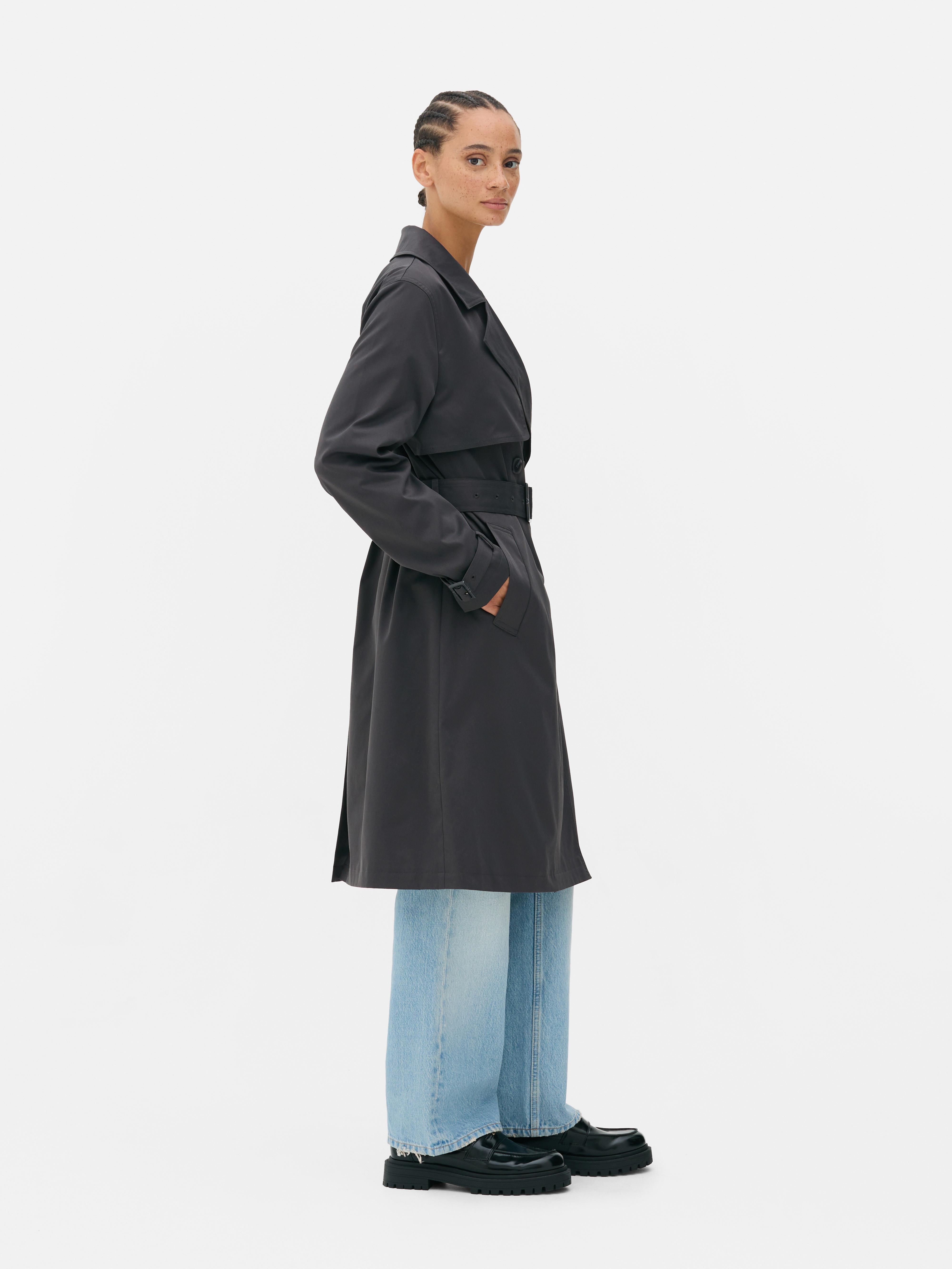 Slip into timeless style with this essential belted trench coat. Cut to a knee-length fit in a charcoal tone, it’s designed with a double-breasted front, wide lapels and long sleeves with belted cuffs. The adjustable waist belt lets you shape your silhouette your way, while handy side pockets keep essentials close. Finished with a button closure and a classic straight cut, it’s the outer layer you’ll never want to put down.