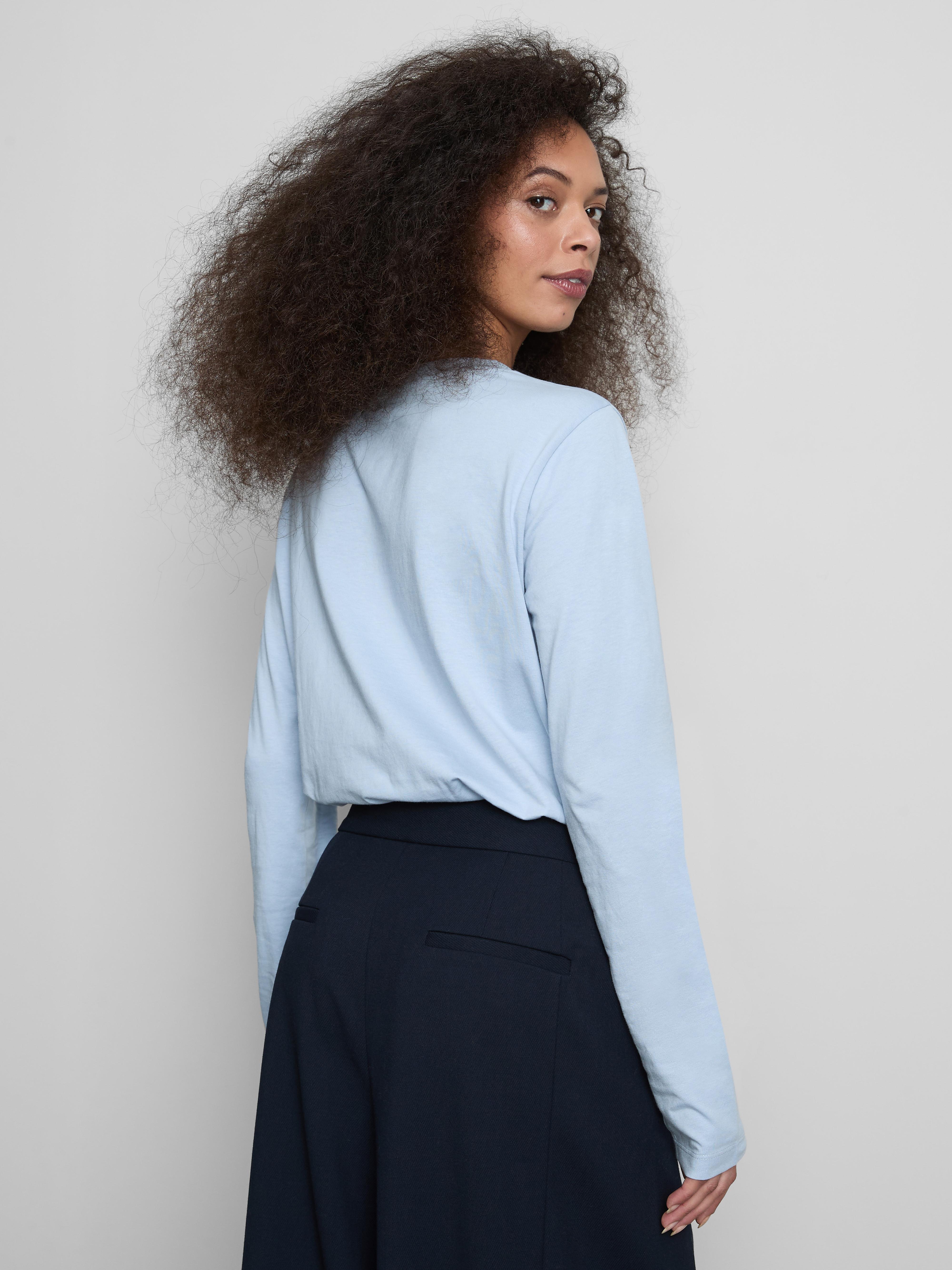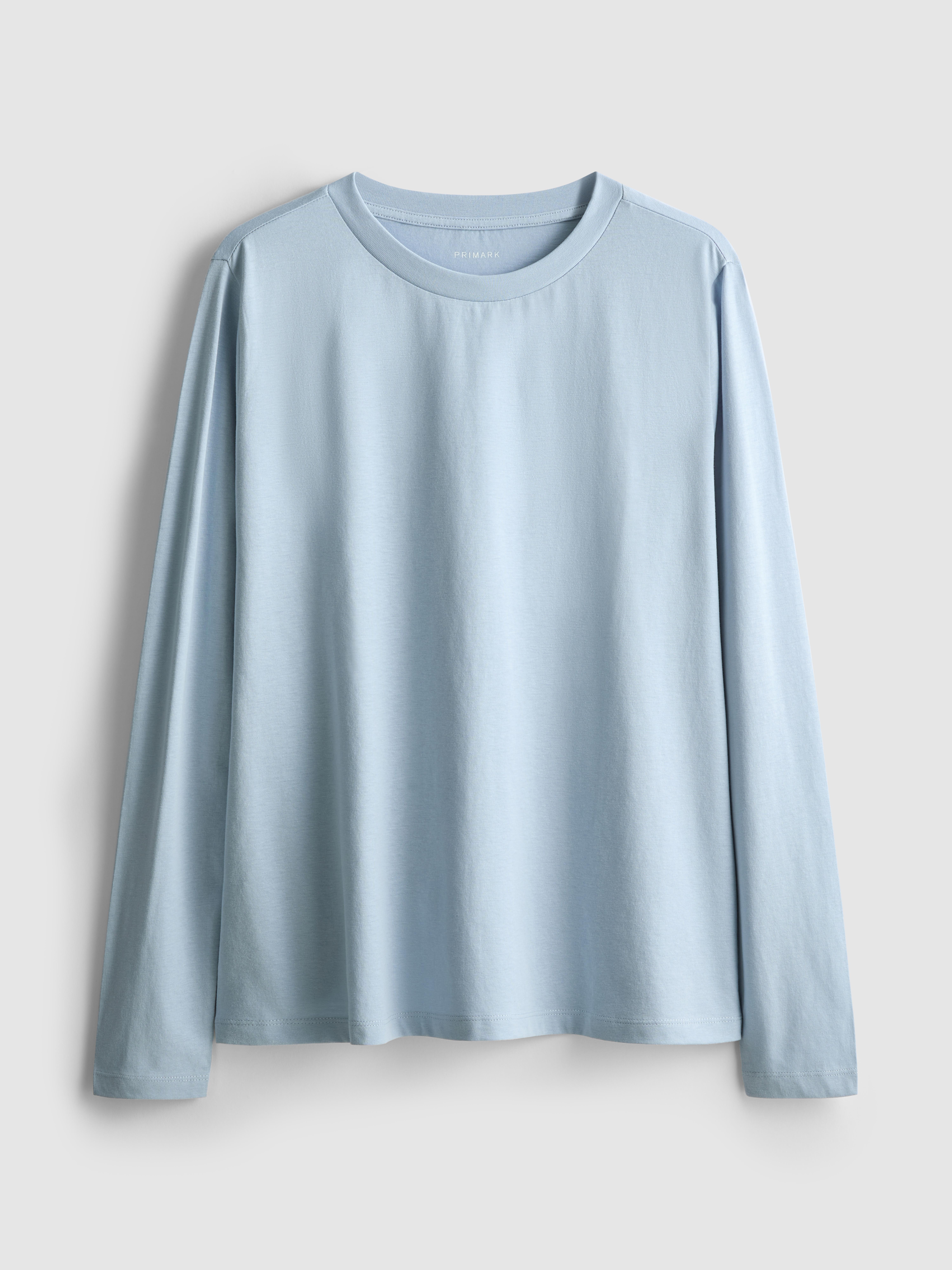 Keep it simple and comfortable with this long sleeve cotton crew neck tee. Designed in a soft jersey fabric, it’s cut in a regular fit for easy everyday wear. The classic crew neckline and light blue shade makes it a versatile piece you can layer under jackets or style solo when the weather calls for it. With its clean, no-fuss design, this top is an easy go-to for relaxed days and effortless outfits. A timeless basic you’ll keep reaching for, whether you’re at home or out and about.