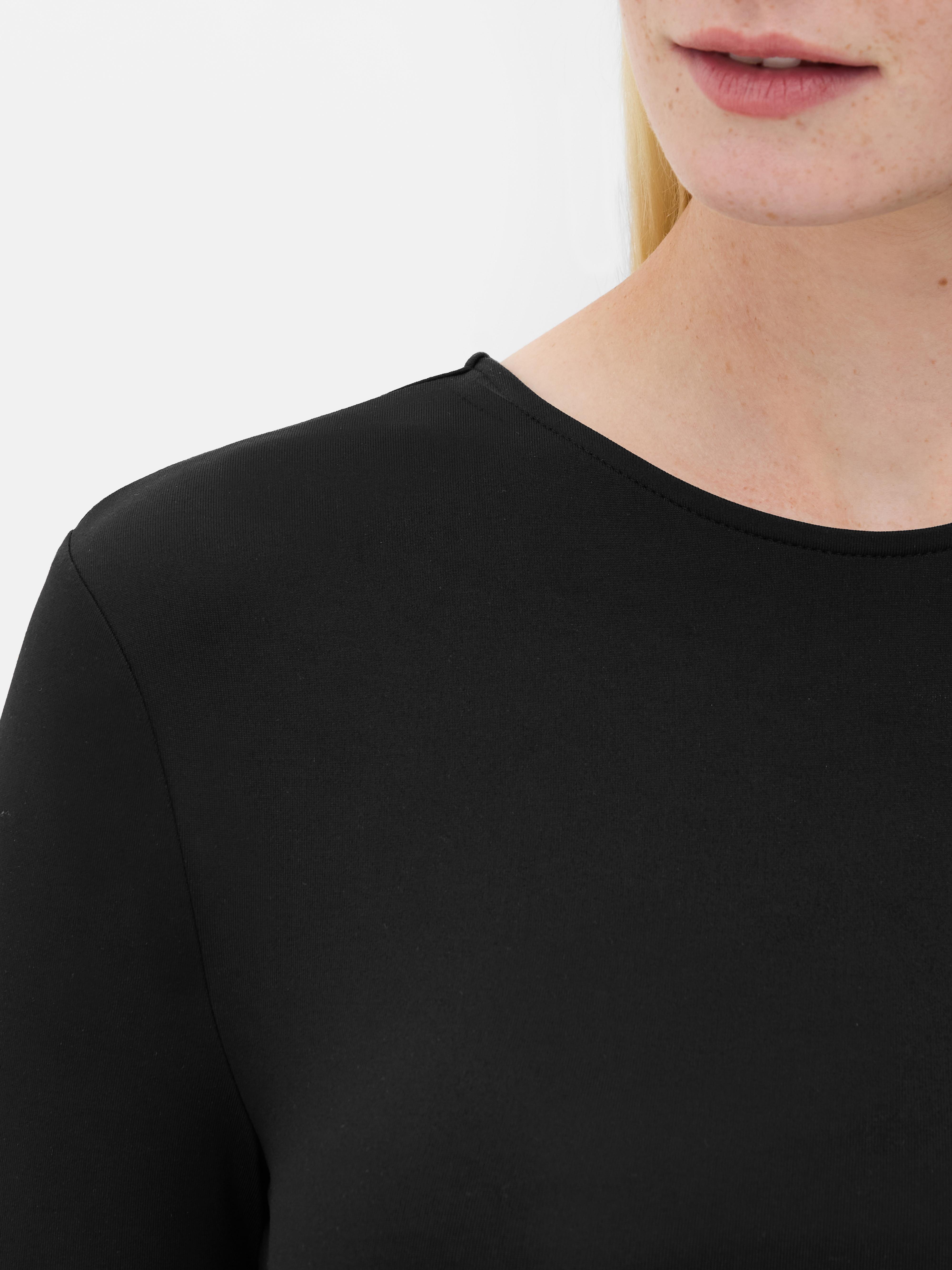 Keep things simple and sleek with this essential black long sleeve bodysuit. Made from a smooth, stretchy fabric, it hugs the body for a comfy, figure-skimming fit. Designed with a classic crew neckline and full-length sleeves, it’s an easy piece to layer under jeans, skirts or trousers. The snap button closure at the bottom keeps things secure, so you’re good to go from morning to night. A go-to basic you'll wear on repeat, whatever the season.