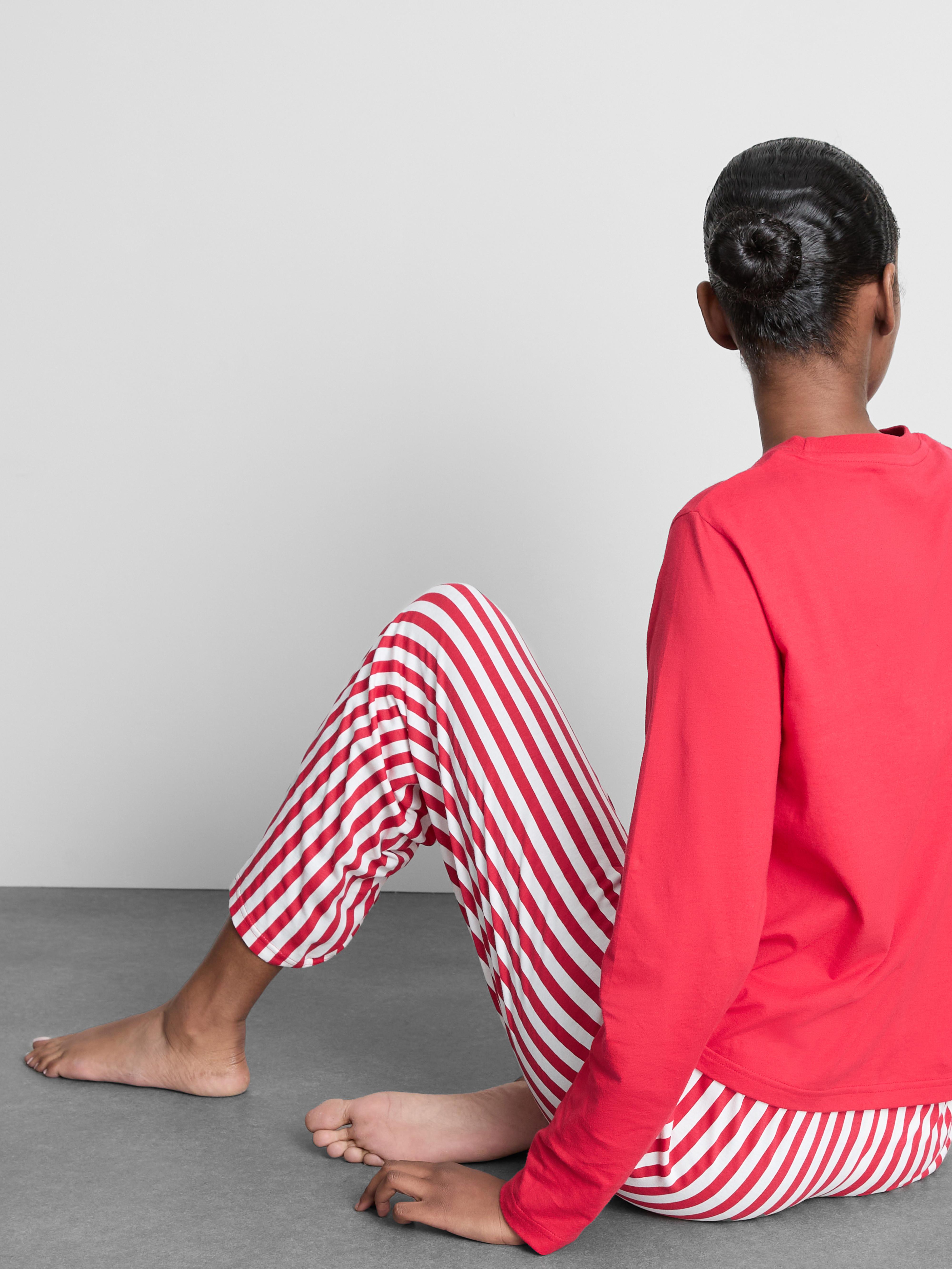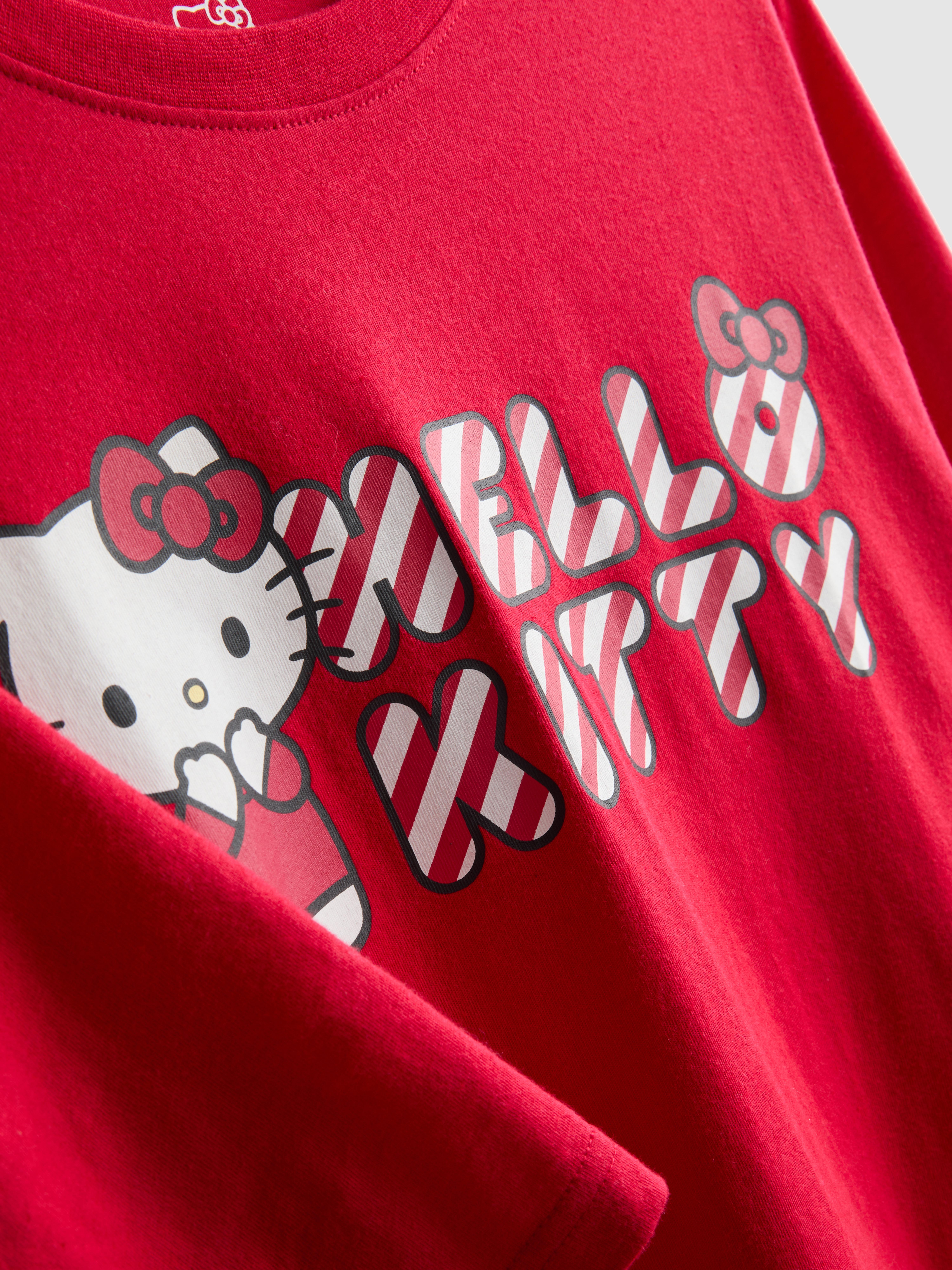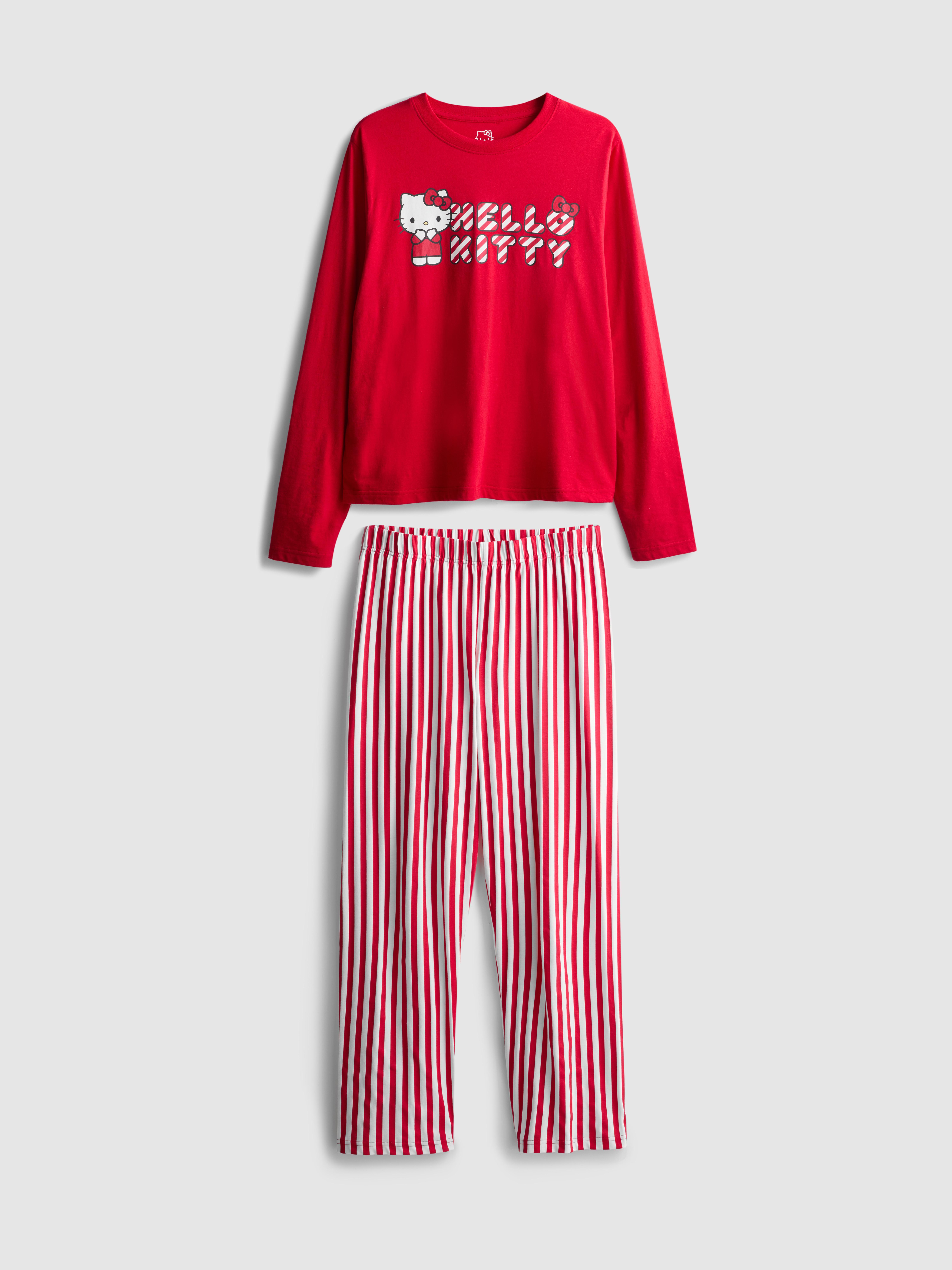 Say hello to cosy nights with this Hello Kitty striped pyjama set. Made from 100% cotton, the set includes a bright red long-sleeve top with a bold Hello Kitty graphic and lettering across the chest. The matching full-length trousers are designed with playful red and white vertical stripes for a classic look. Both pieces come in a relaxed fit to keep you comfy while you sleep or lounge. It’s a fun, nostalgic pick that brings a touch of sweetness to bedtime.