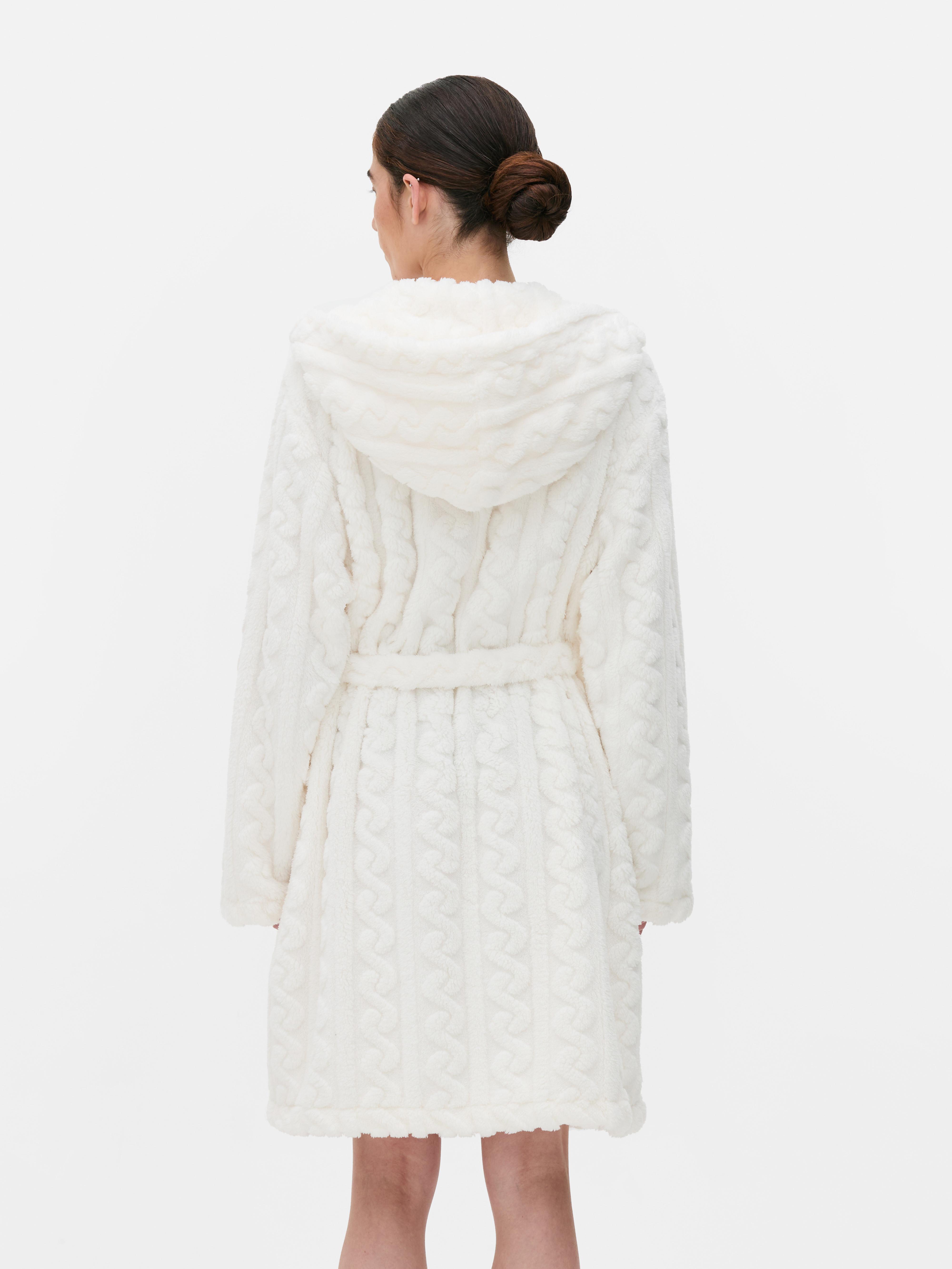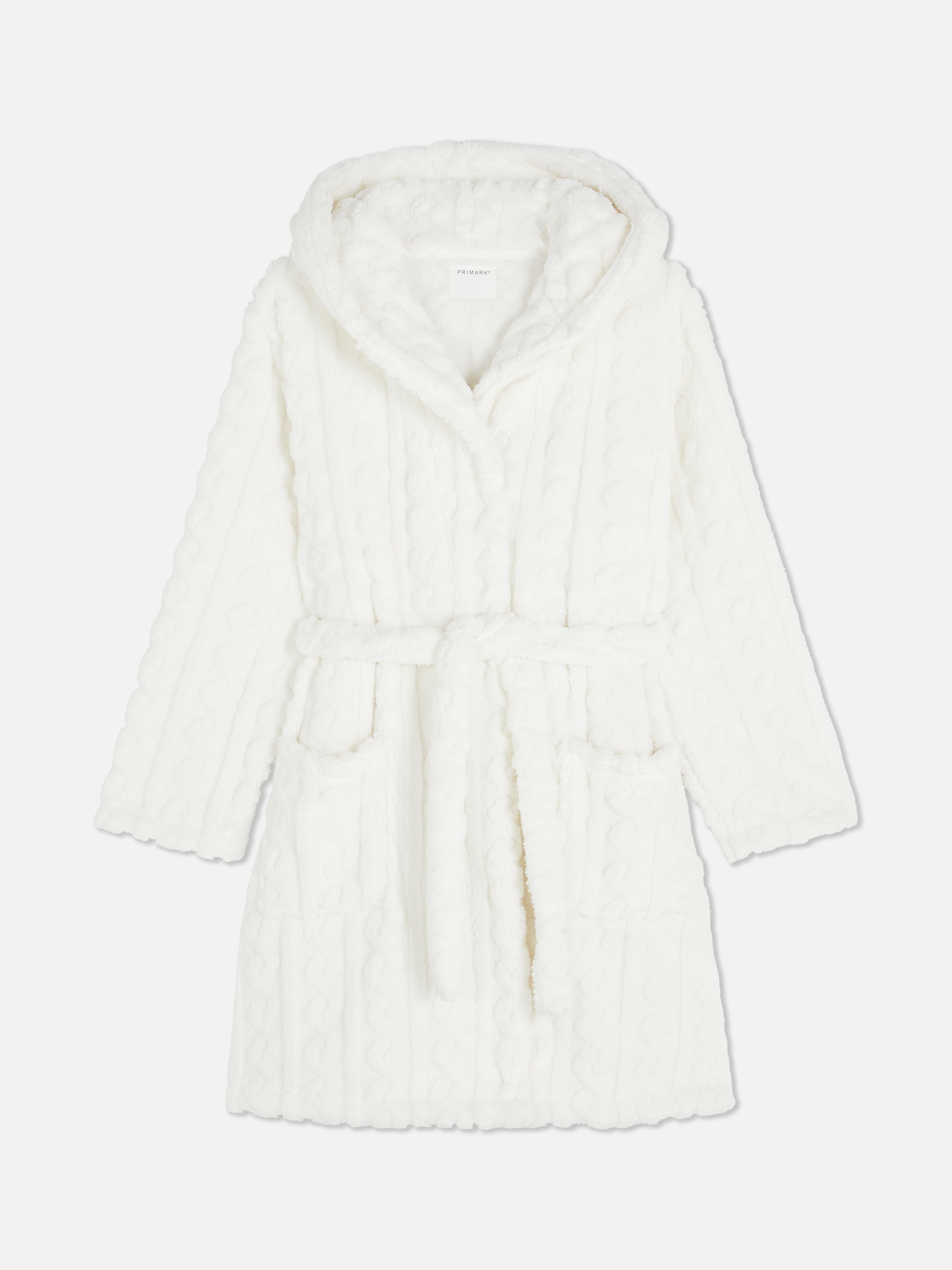 In a gorgeous borg fabric, this mid length dressing gown has a tie waist and hood and two front pockets
