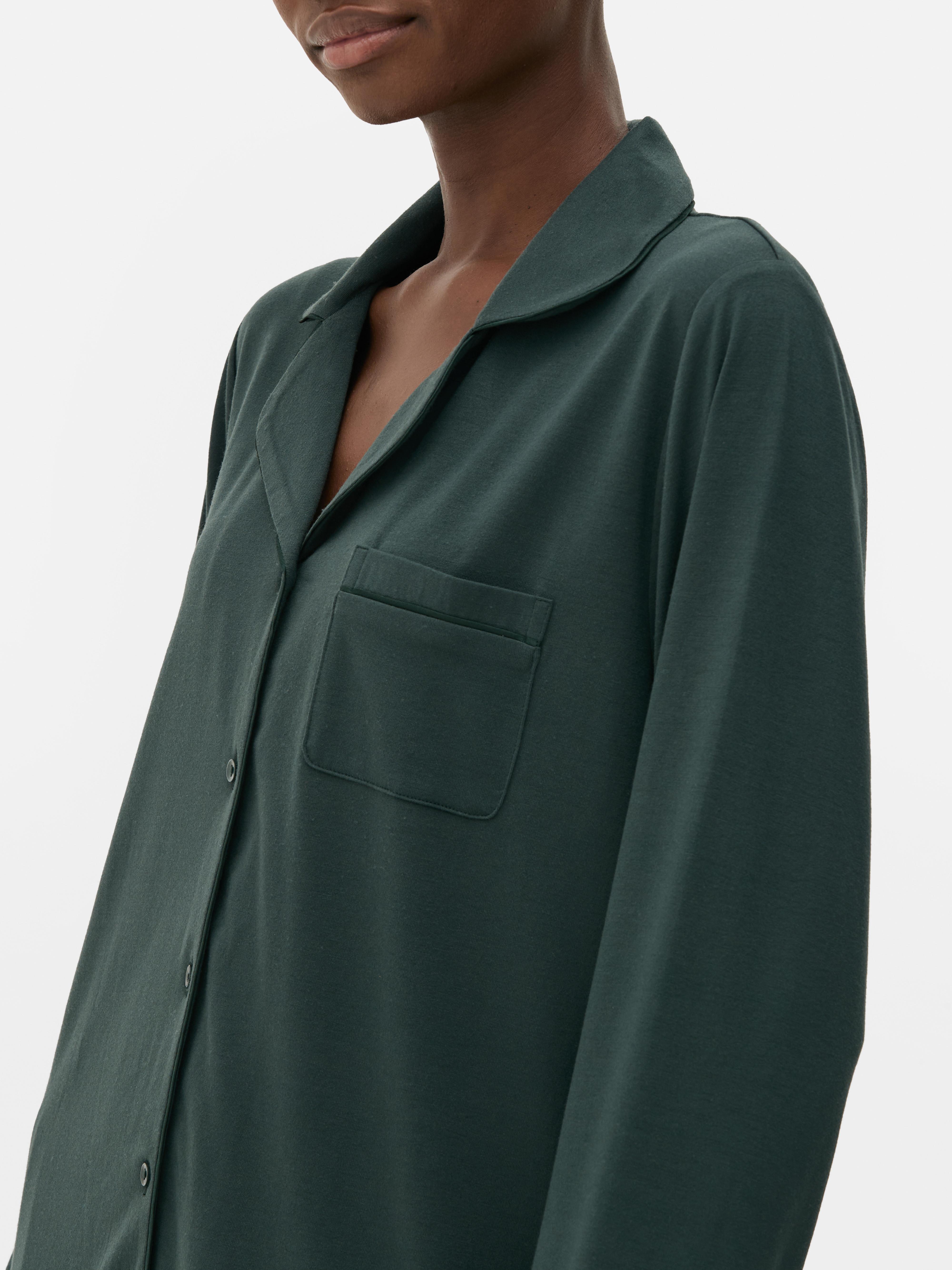 or nightwear that’s as stylish as your daytime wardrobe, you can count on these boyfriend pyjamas! Made from a soft jersey, the long sleeve top features a revere collar, button-up front and chest pocket for timeless charm. The coordinating trousers enjoy an elasticated waist that falls to a relaxed wide leg silhouette to offer a comfy wearing experience. Finished with classic contrast piping, you can layer these PJs with your fluffiest dressing gown for those moments you want to be extra toasty!