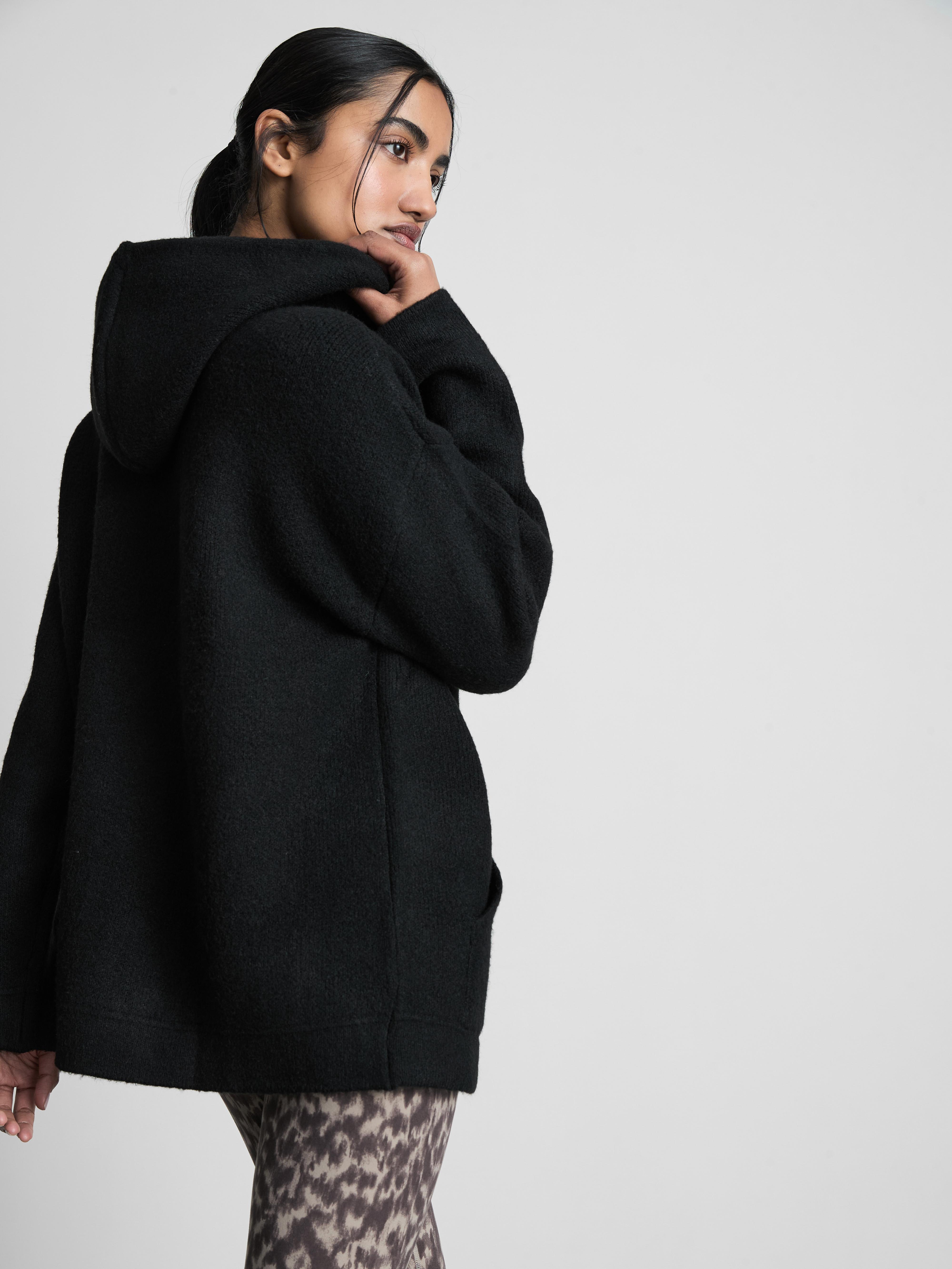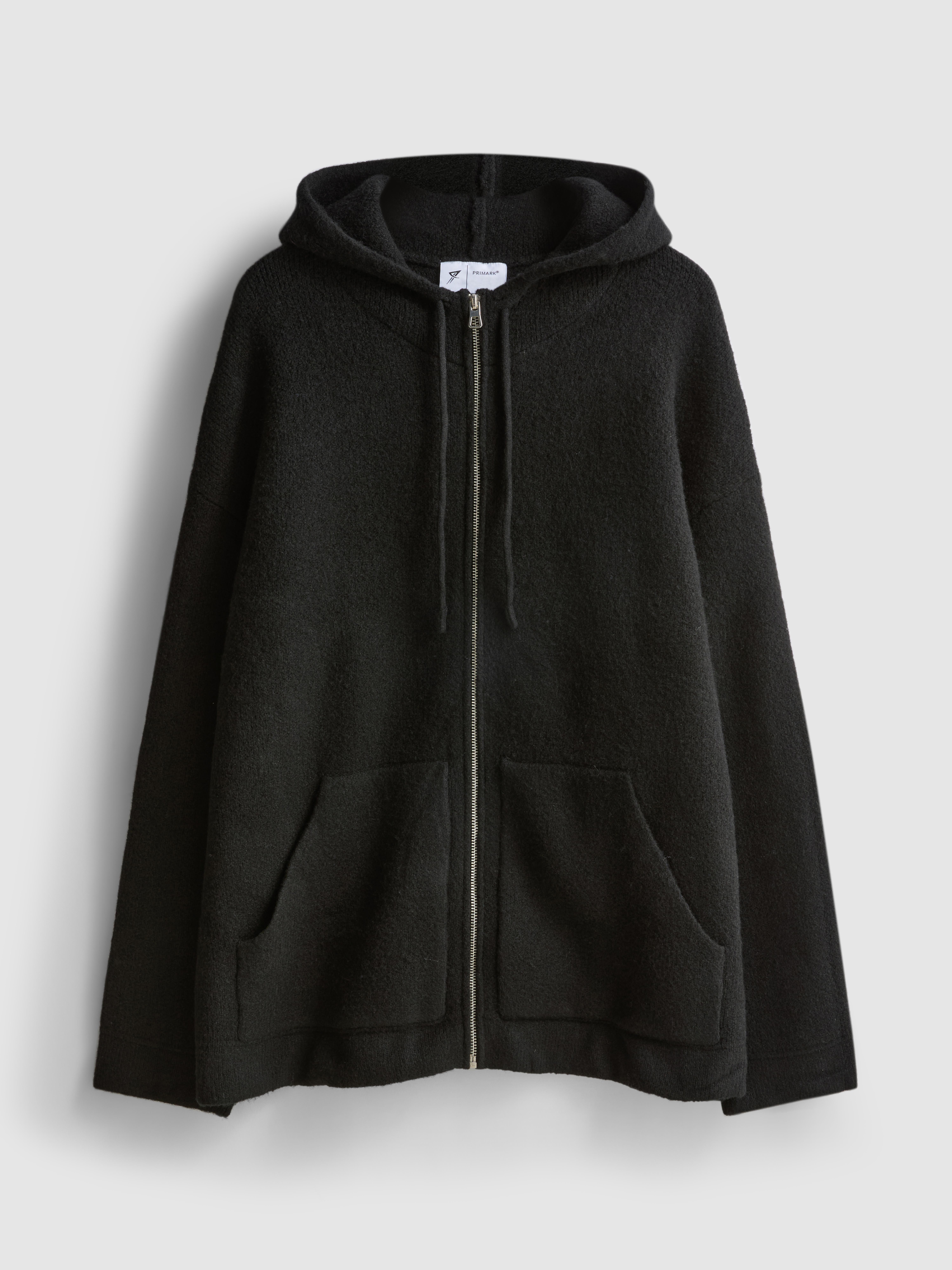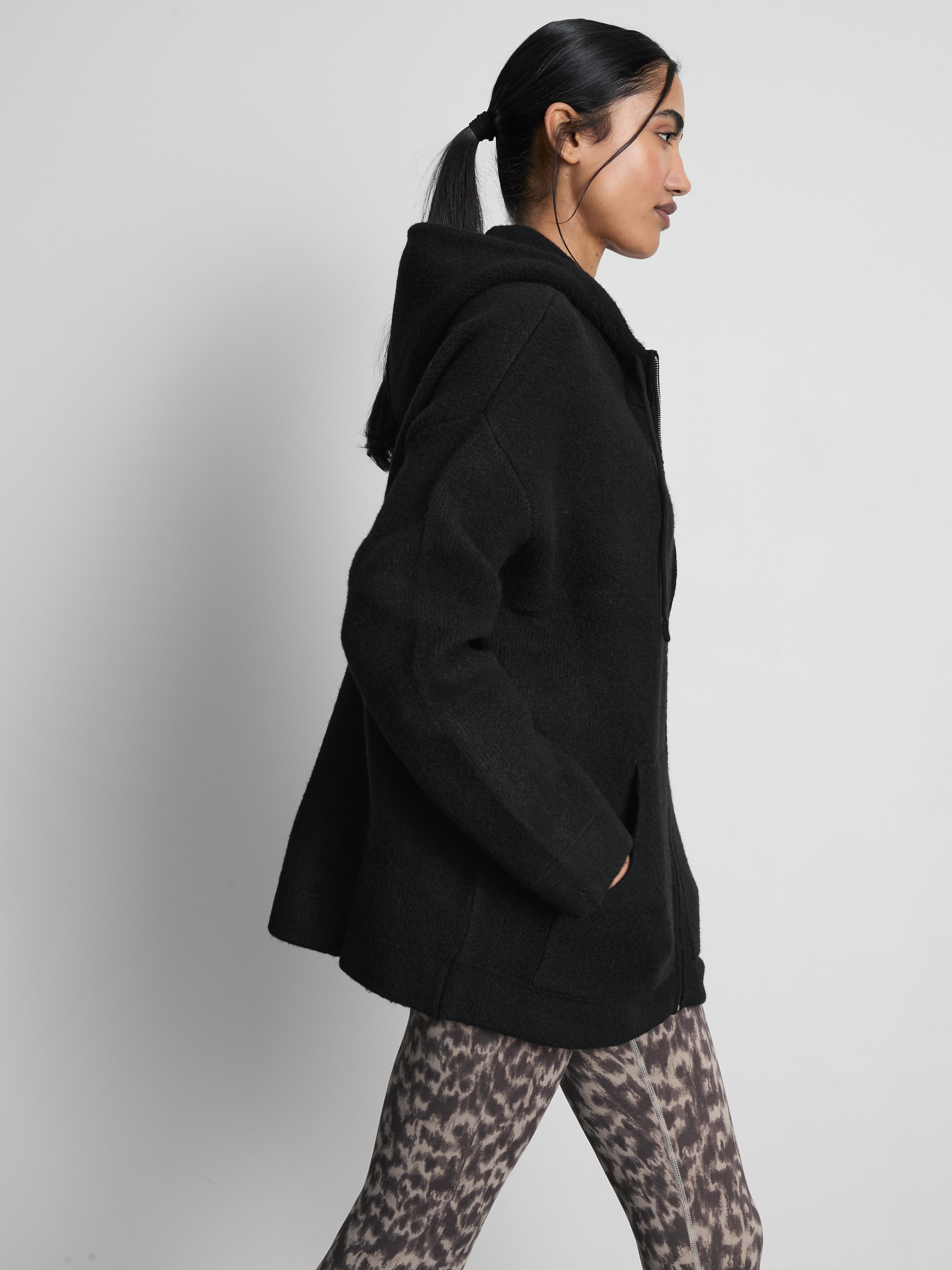 Stay comfortable on and off the move with this black knitted zip-through hoodie. Made from soft, brushed fabric, it provides warmth and a smooth, plush feel. The full-length silver zipper makes it easy to pull on or off, while the attached hood with drawstring adds coverage when you need it. Two large front pockets keep essentials close at hand, and the relaxed fit with long sleeves and straight hem ensures comfort throughout the day. Perfect for workouts, casual strolls, or layering over your favourite activewear, it’s a versatile wardrobe essential.