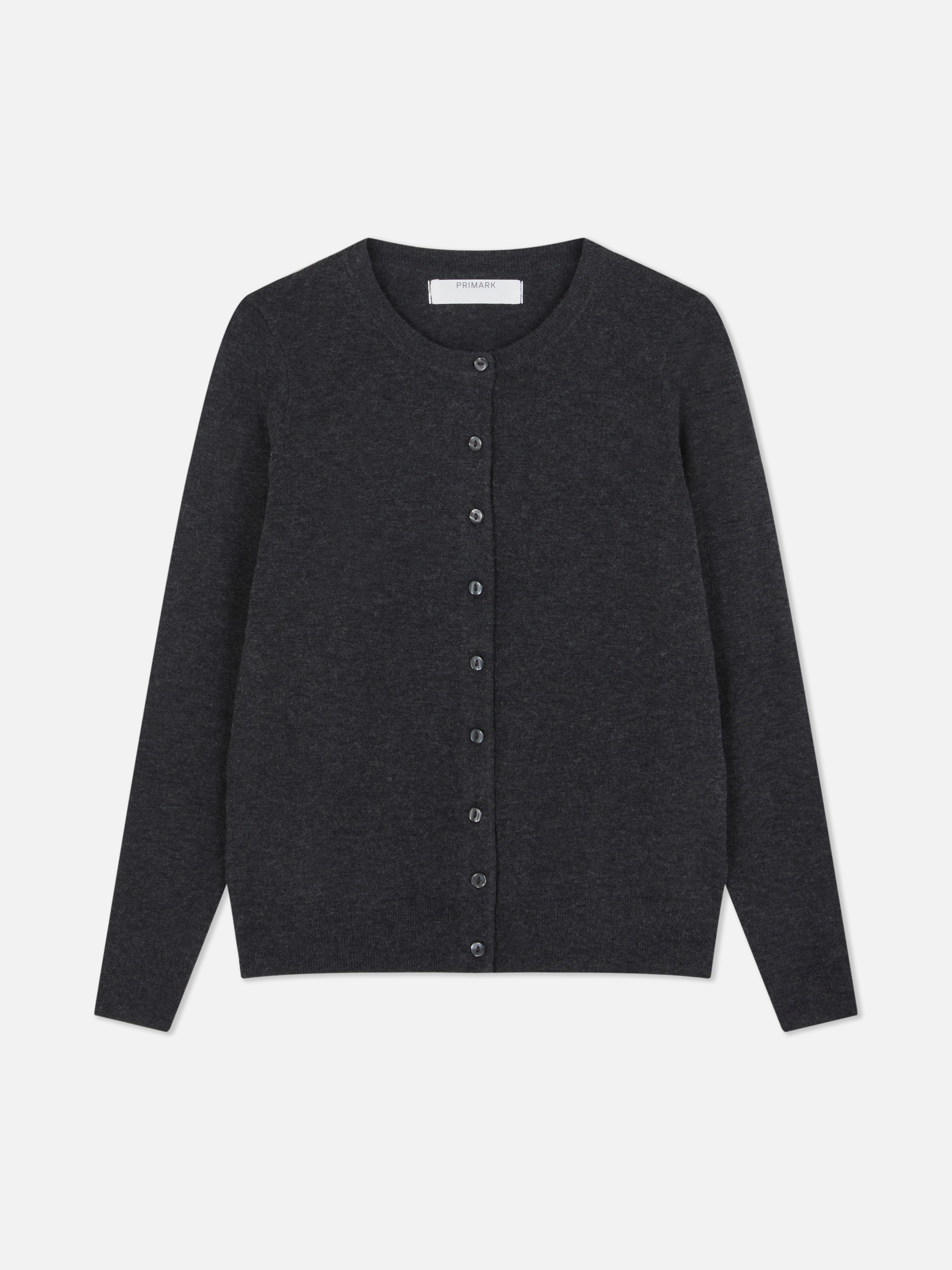 Perfect for layering, this cardigan has a crew neck, button down front and ribbed cuffs and hems