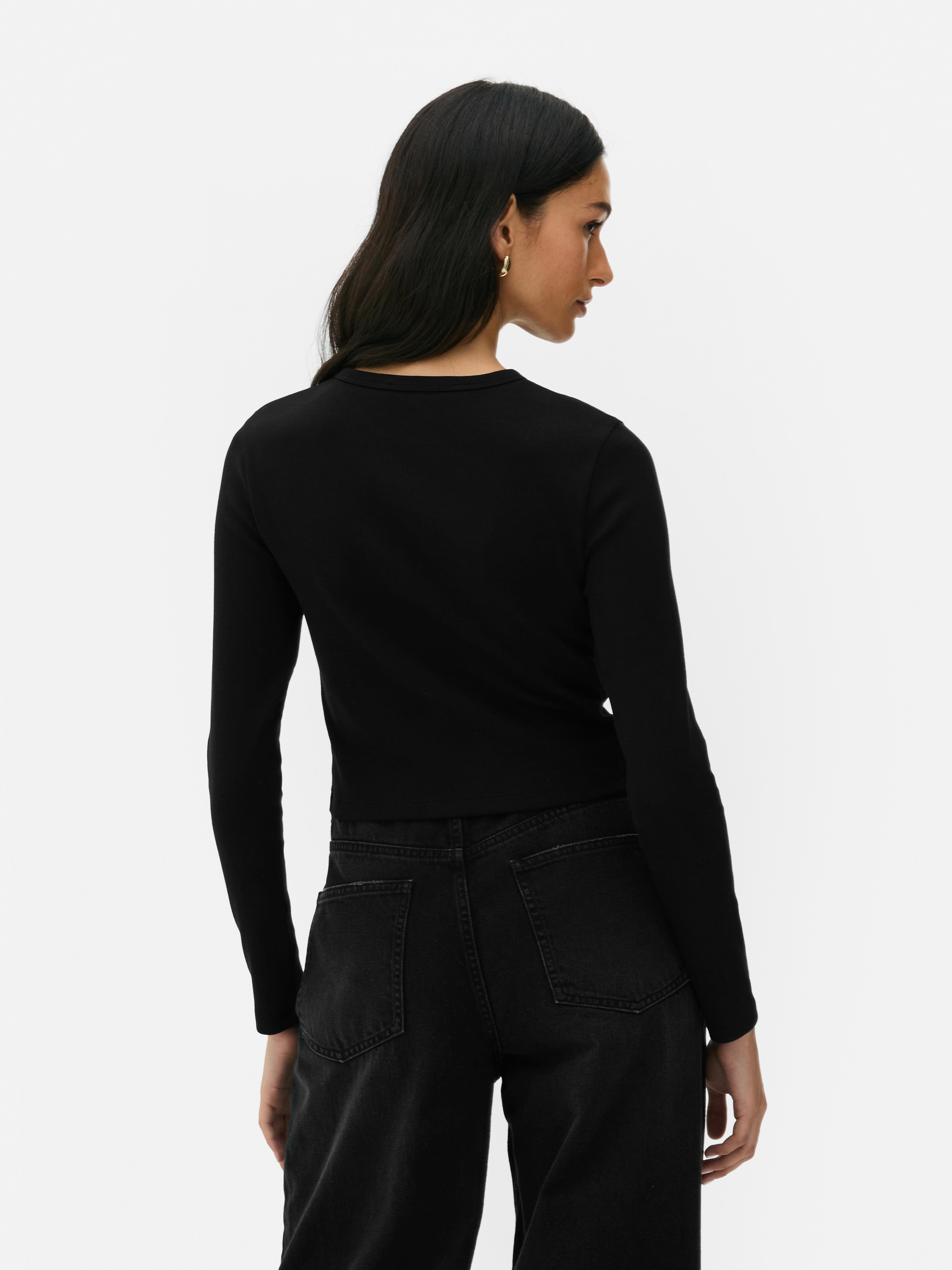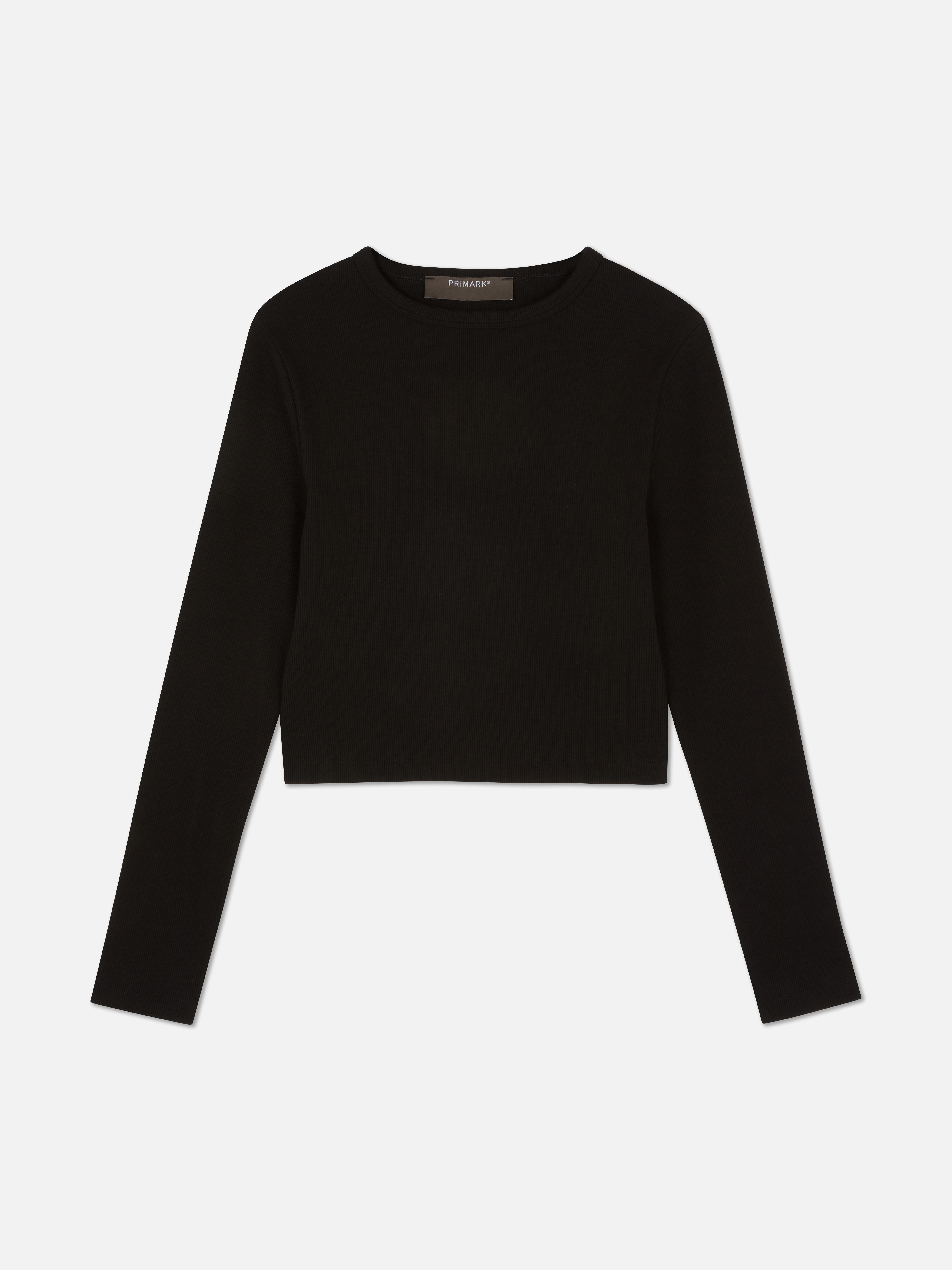 A wardrobe essential with a contemporary twist, this long-sleeve ribbed top is designed in solid black with an all-over ribbed texture. Its cropped hemline brings a modern feel, while the classic round neckline keeps it easy to layer with your favourite pieces. The fitted silhouette makes it perfect for pairing with high-waisted jeans or skirts, creating an effortless look that works from day to night. Whether worn solo for a sleek finish or styled under jackets and blazers, this top is versatile enough to suit every occasion and will quickly become a go-to in your collection.