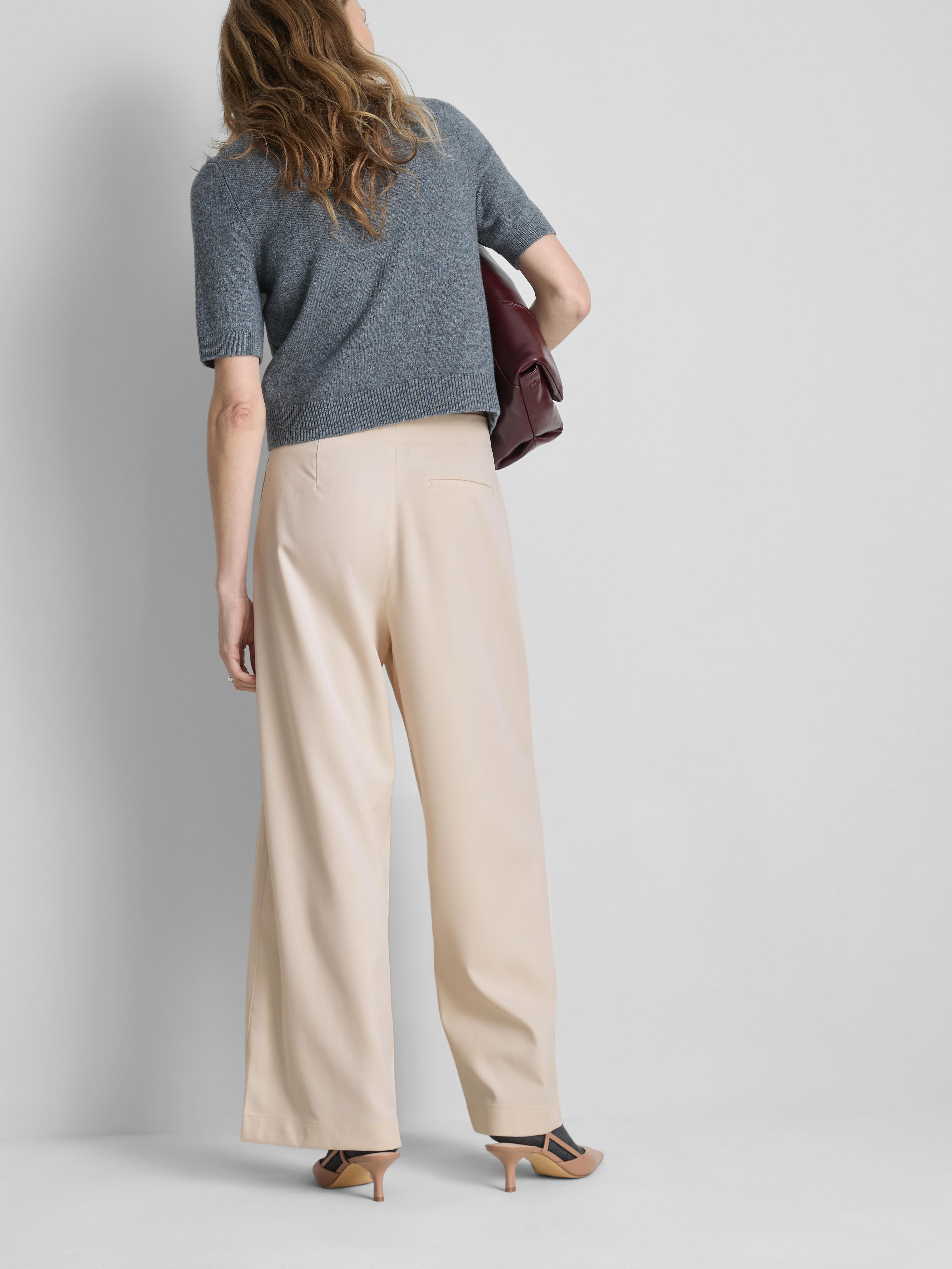 Step out in easy style with these mid-rise wide leg trousers. Made from a smooth woven fabric in an ecru shade, they bring a smart, modern look to your day. The structured waistband sits comfortably at the mid rise and includes belt loops, while the concealed front closure keeps the finish clean. Vertical pleats add shape and a polished feel, and the wide leg drapes to an ankle-grazer length for a fresh, contemporary silhouette. Side-seam pockets offer handy storage, making these trousers a simple go-to for work or weekend plans.