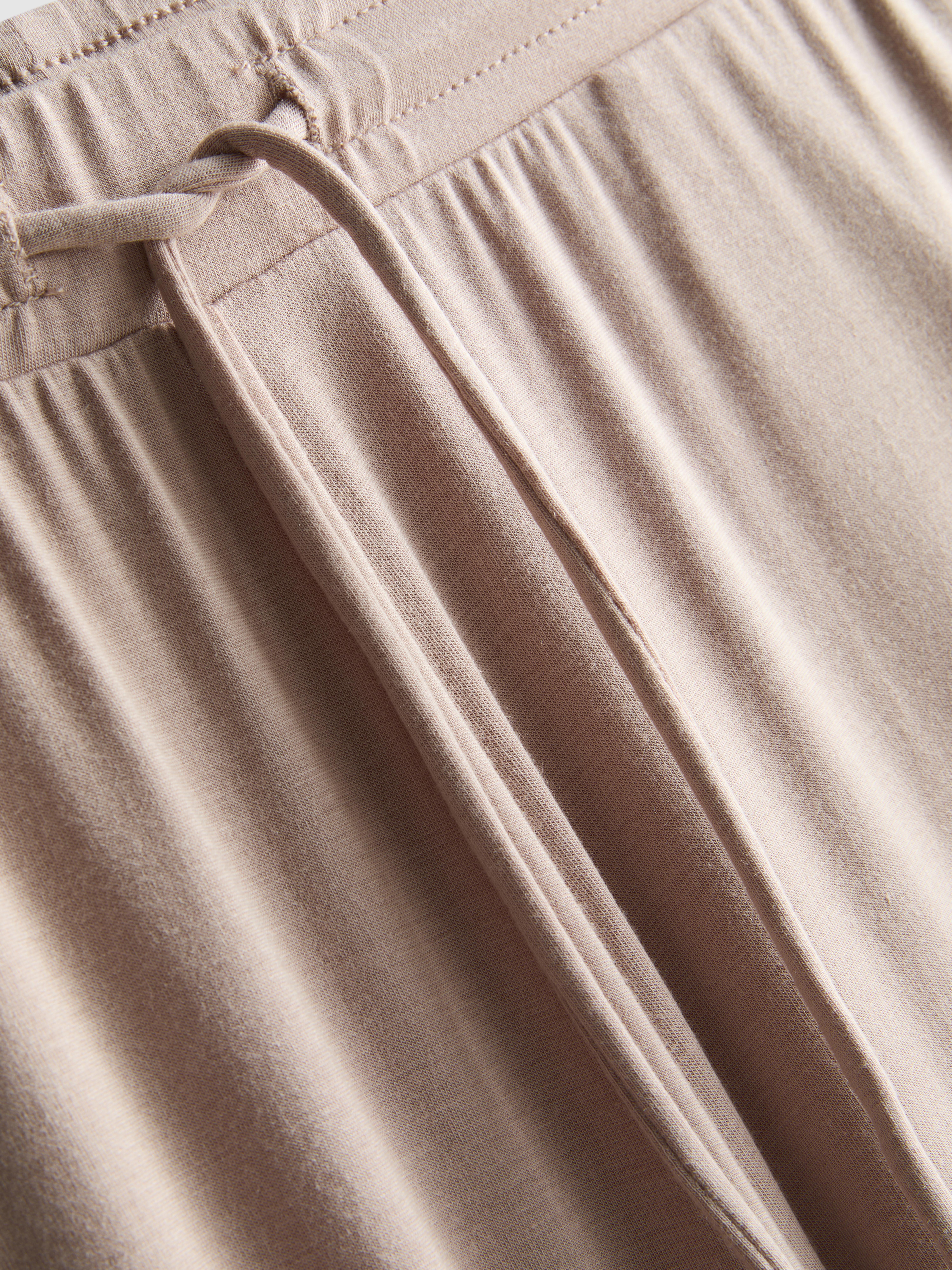 Relax in these soft modal-rich pyjama bottoms in an oatmeal shade - made from a lightweight, draping fabric, they feel smooth against the skin. The wide, covered elasticated waistband with a central drawstring tie allows for an adjustable fit, while the full length wide leg design offers a loose, flowing silhouette. Comfortable and elegant, they are ideal for sleep or lounging. The clean, minimal design and fluid fabric make them a versatile addition to any sleepwear or loungewear collection.