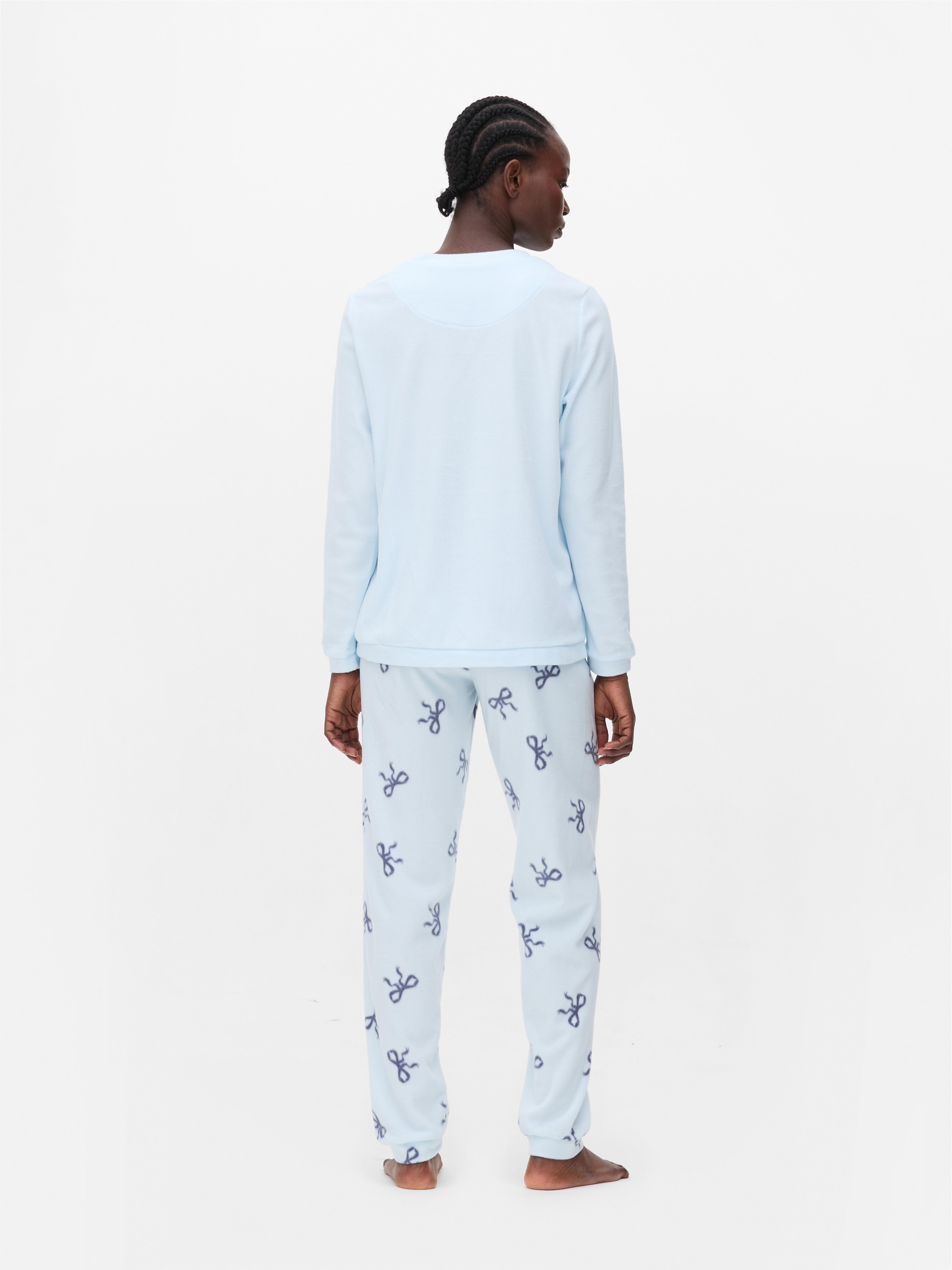 Snuggle season? You’re covered with this fleecey PJ favourite. The long sleeved top comes in a gentle light blue shade with a bold bow motif on the front, while the full length bottoms are printed all over with matching mini bows. The relaxed fit and elasticated waistband make it easy to move, snooze, or lounge in total comfort. Finished with a classic crew neck and cosy feel, you’ll struggle to put this pair of pyjamas down.