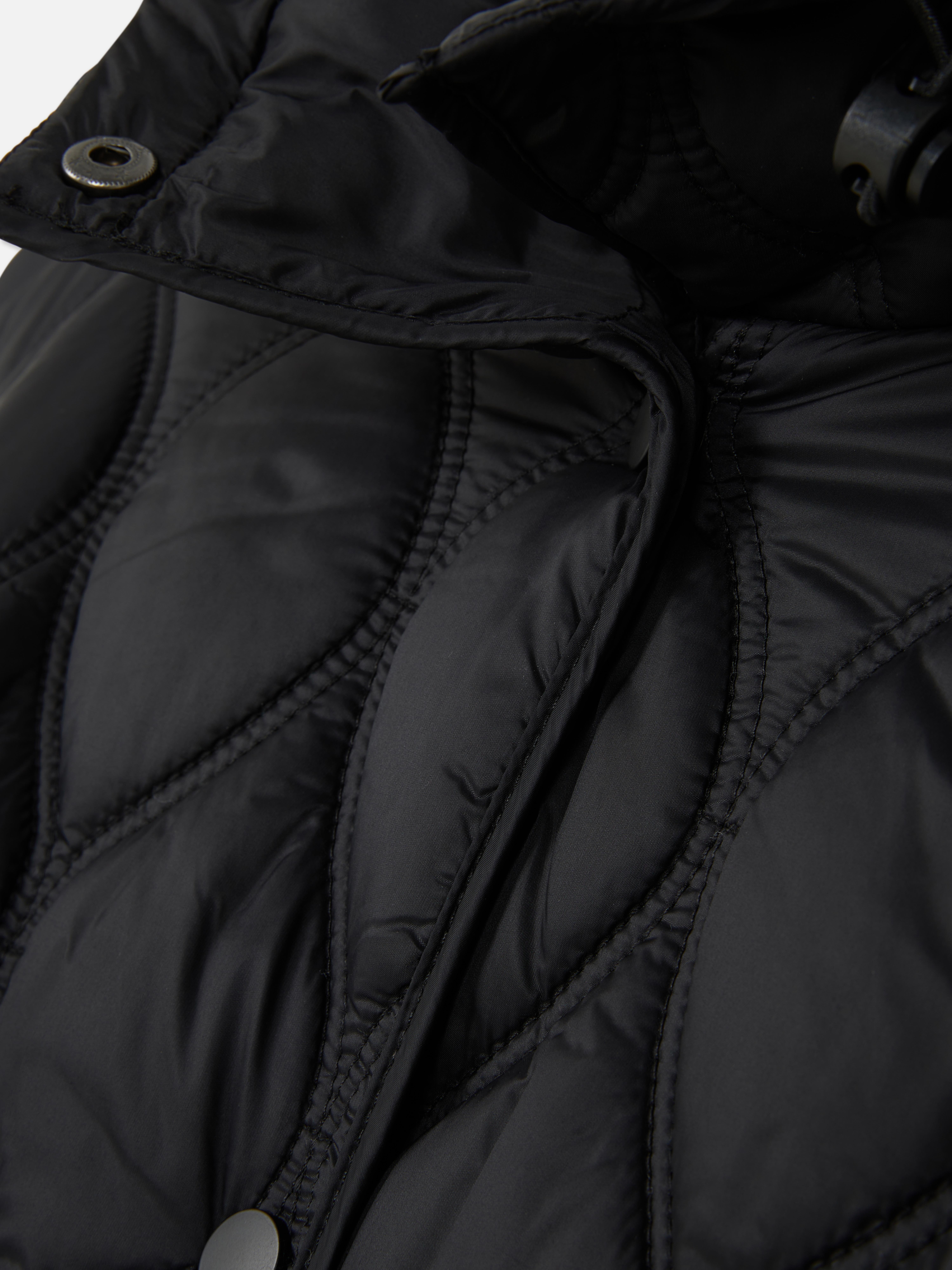 Wrap up without the bulk in this black quilted hooded coat, made for cool days and easy layering. Designed in a relaxed, oversized fit with soft padding and a diamond quilt pattern, it brings warmth without feeling too heavy. The high neckline and hood help keep the chill out, while the snap-button closure and side seam pockets add practical touches. Finished with long sleeves and a gently rounded hem, it’s the kind of coat that’s comfy, cosy and always ready to go.