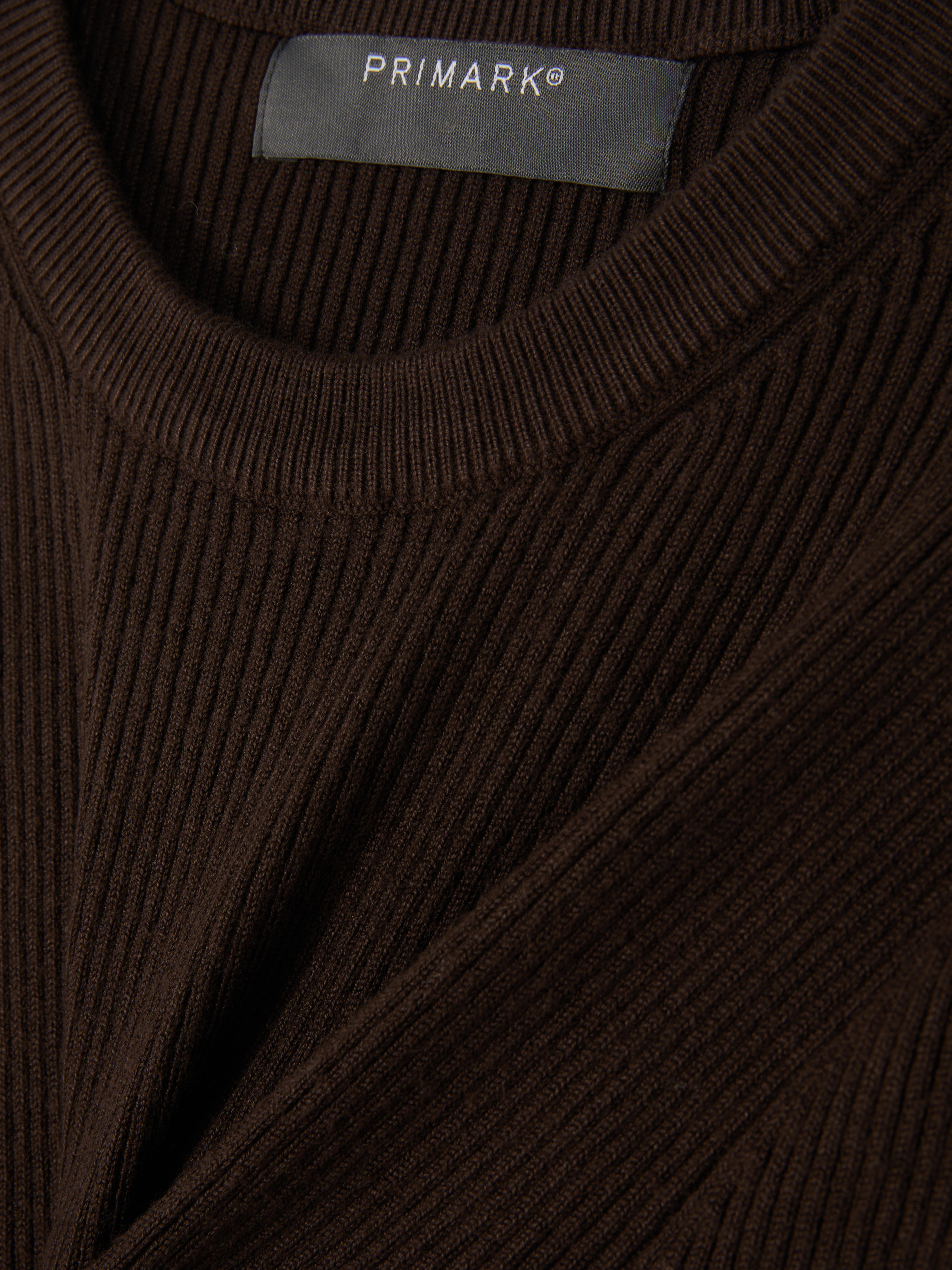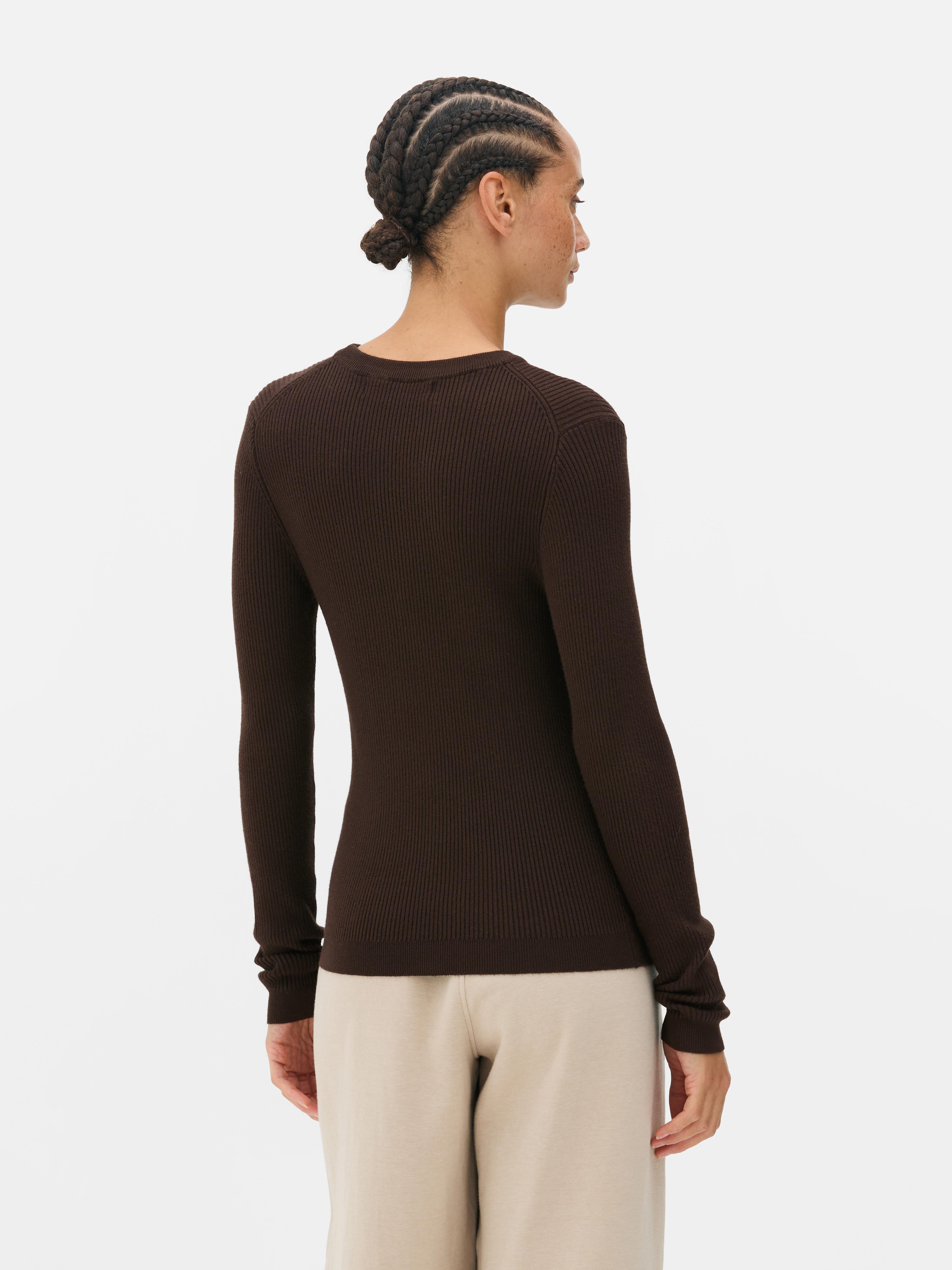 Simple, soft and easy to wear, this ribbed crew neck jumper is a layering staple you'll reach for on repeat. It comes in a chocolate shade that goes with everything, with a classic crew neckline and full length sleeves. The ribbed knit adds a bit of stretch and texture, while the fitted shape keeps it sleek. Perfect for styling under jackets or pairing with your favourite high waisted jeans.