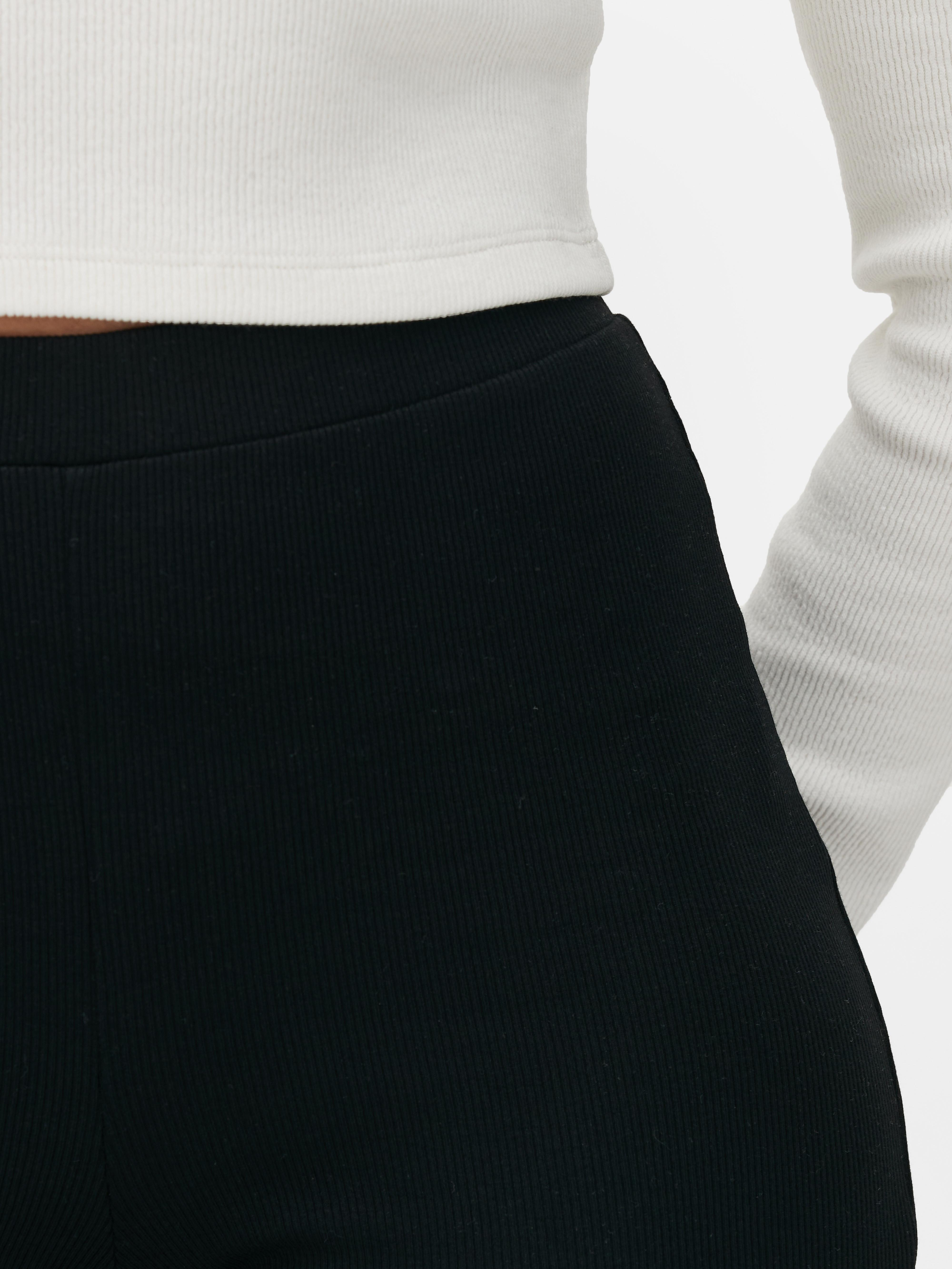 Elevate your everyday style with our mid-rise flared leggings, designed to combine comfort with a trendy edge! Featuring a ribbed texture, these leggings offer a touch of sophistication while providing a flattering fit. The mid-rise waist ensures a secure and comfortable feel, making them perfect for all-day wear while the flared leg silhouette adds a stylish twist, creating a sleek and elongated look. Pair them with the coordinating cropped sweater and trainers for a chic daytime outfit, or dress them up with a blouse and heels for a night out!