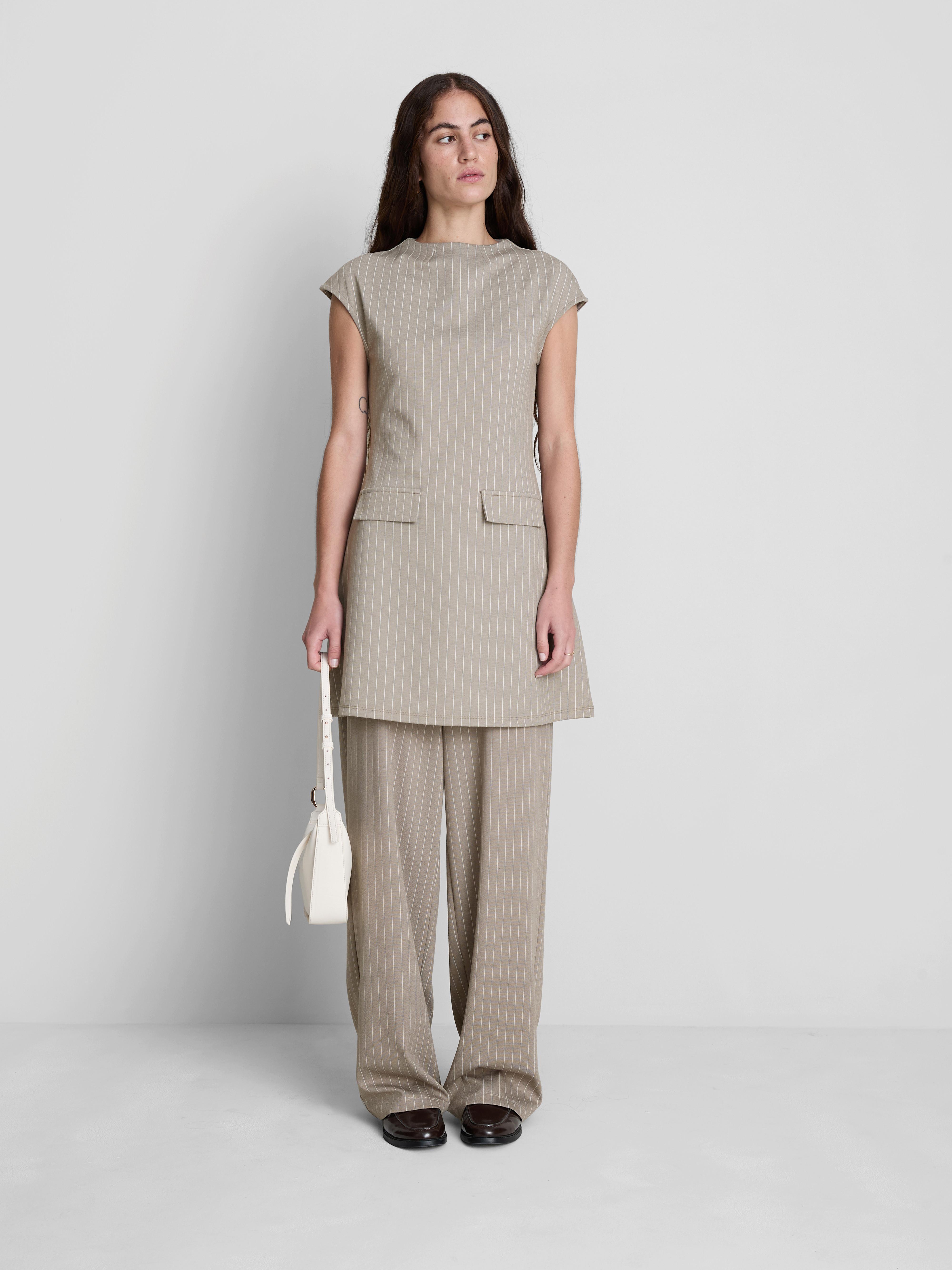 This pinstripe dress comes in a mini length with short sleeves, decorative pockets, a round neck cut, and a fitted silhouette