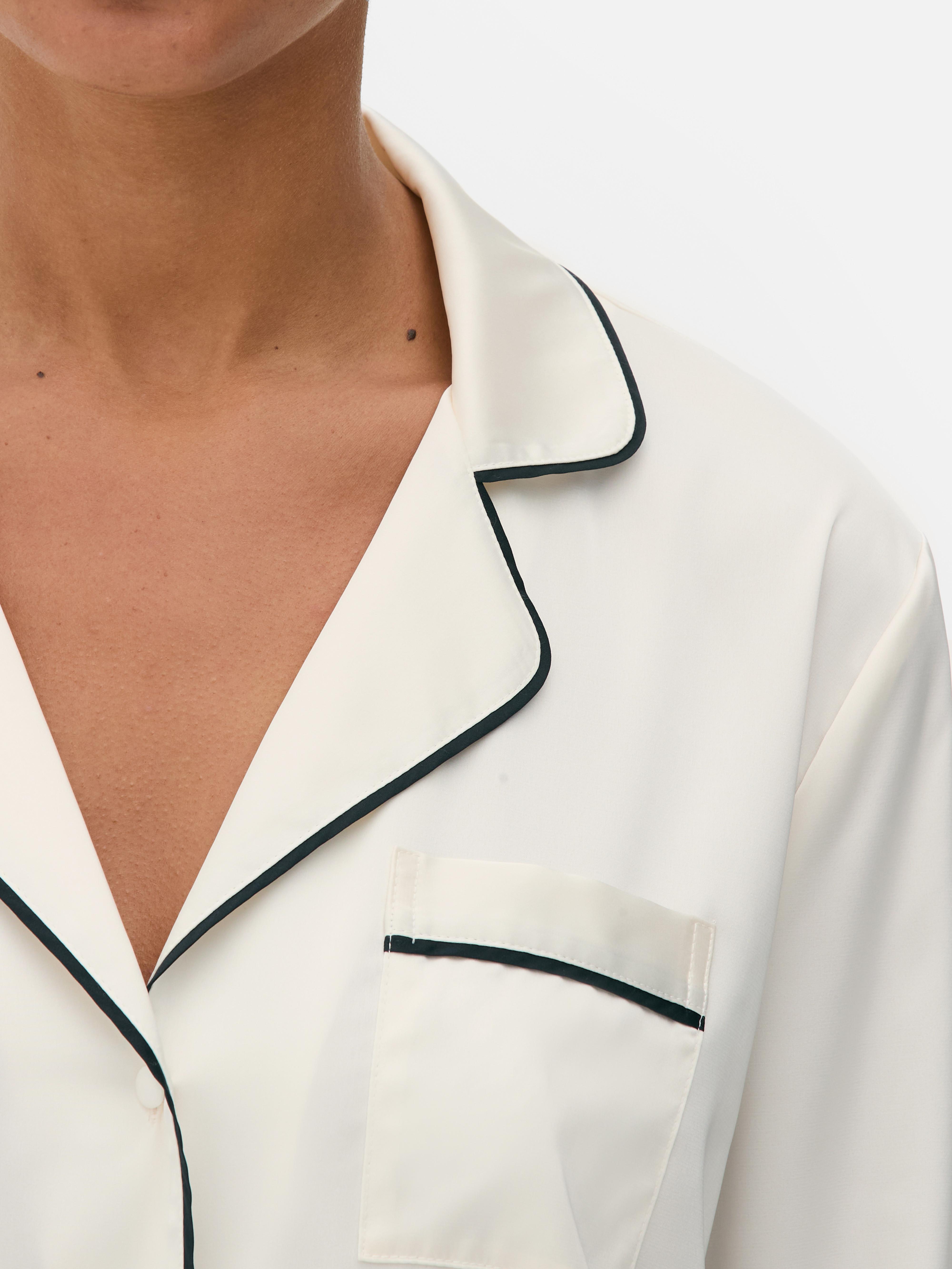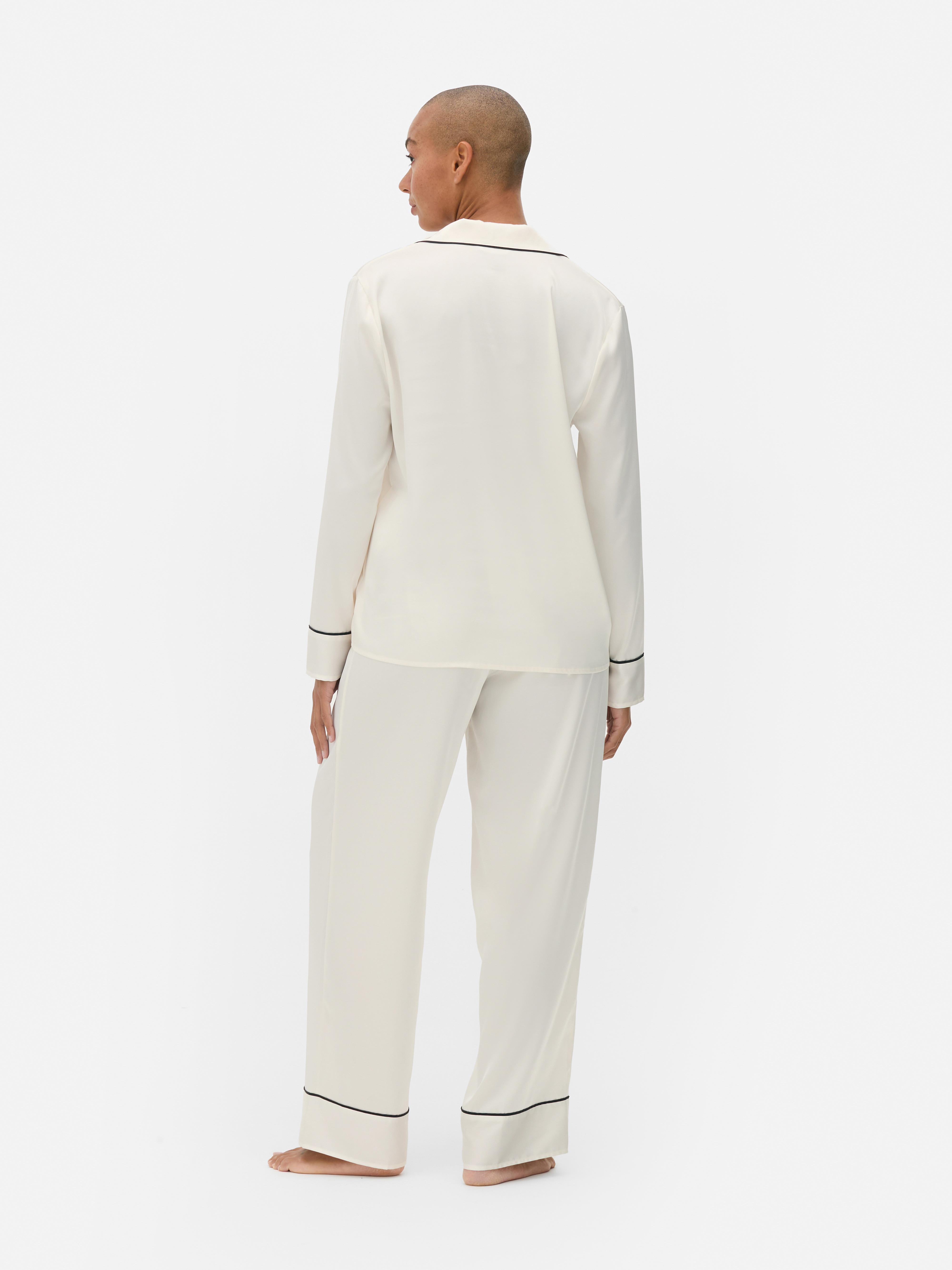 Make bedtime a little more beautiful wearing our satin long sleeve pyjamas. Coming as a two-piece set, you can enjoy rocking our satin-made long sleeve pyjama shirt and matching bottoms, feeling oh-so-stylish as you slumber! Sporting a flattering wide leg silhouette and elasticated waistband with a drawstring detail, we adore how the trousers look with not just the button-up pyjama shirt, but T-shirts, tops, and pyjama camis too for endless wearability. With each garment in a white colourway adorned with contrasting piping, they’re sure to complement a variety of styles and aesthetics!