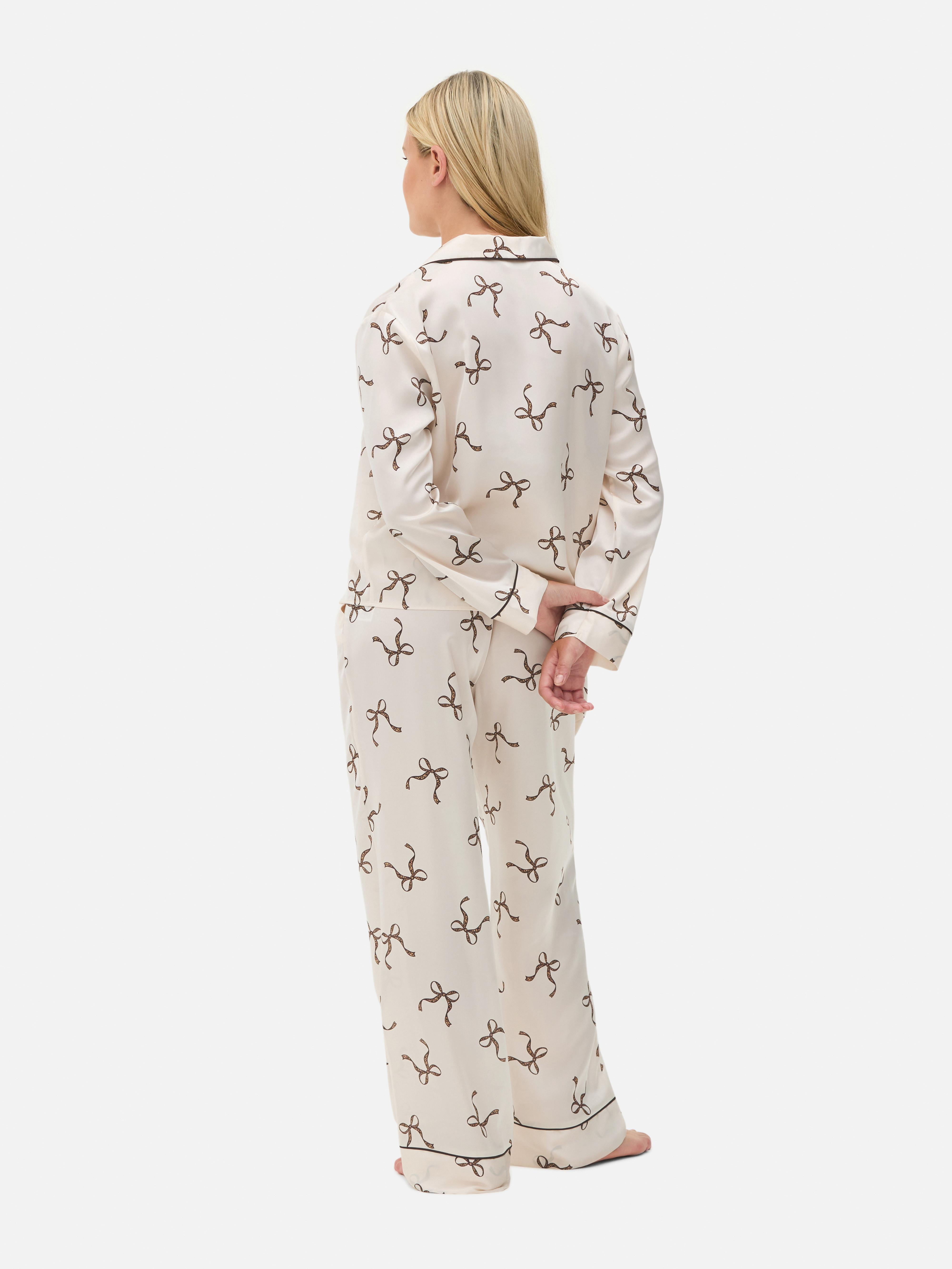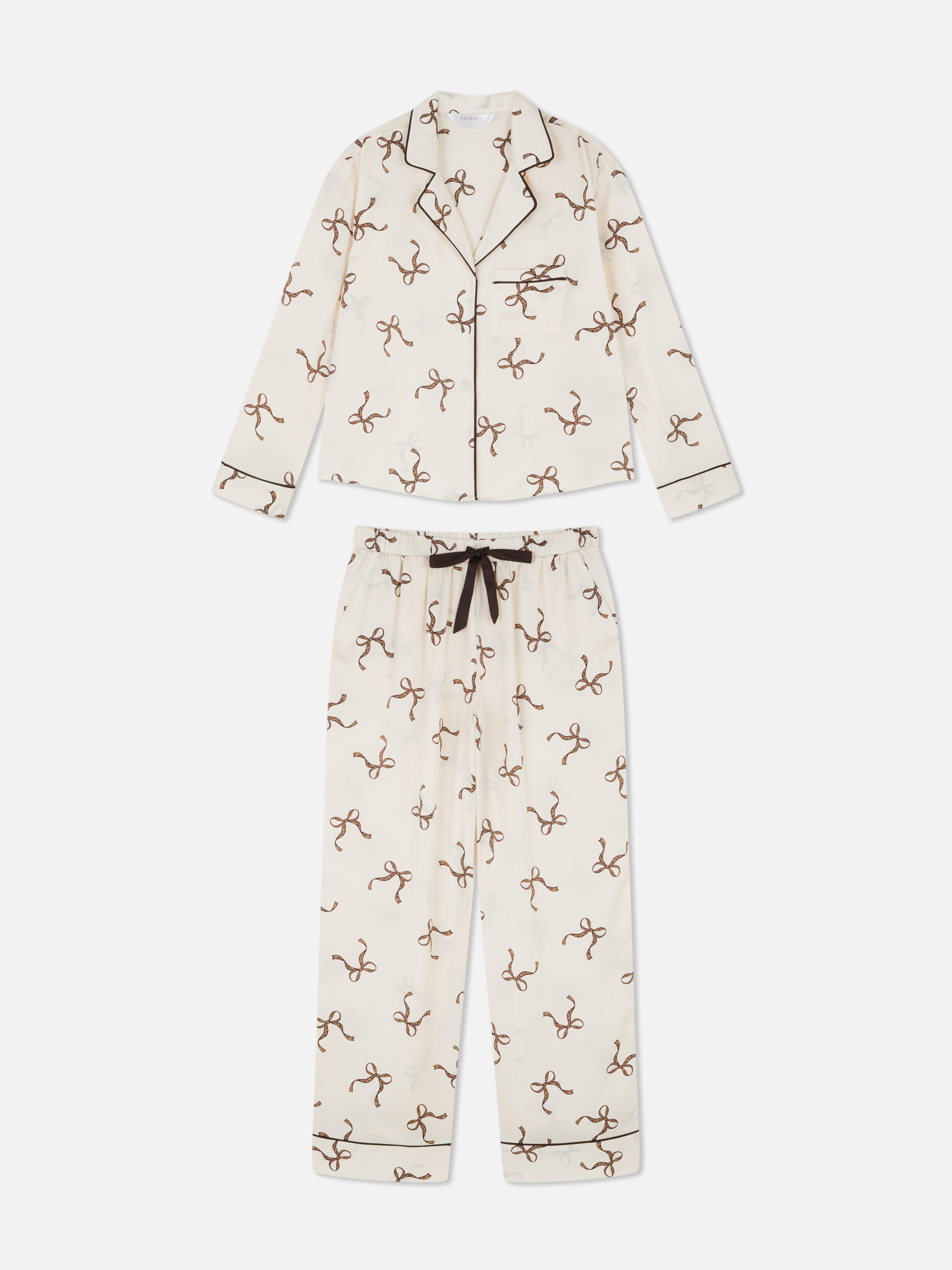 A set of boyfriend pajamas in a satin finish - collared, button through shirt and the matching straight leg pants