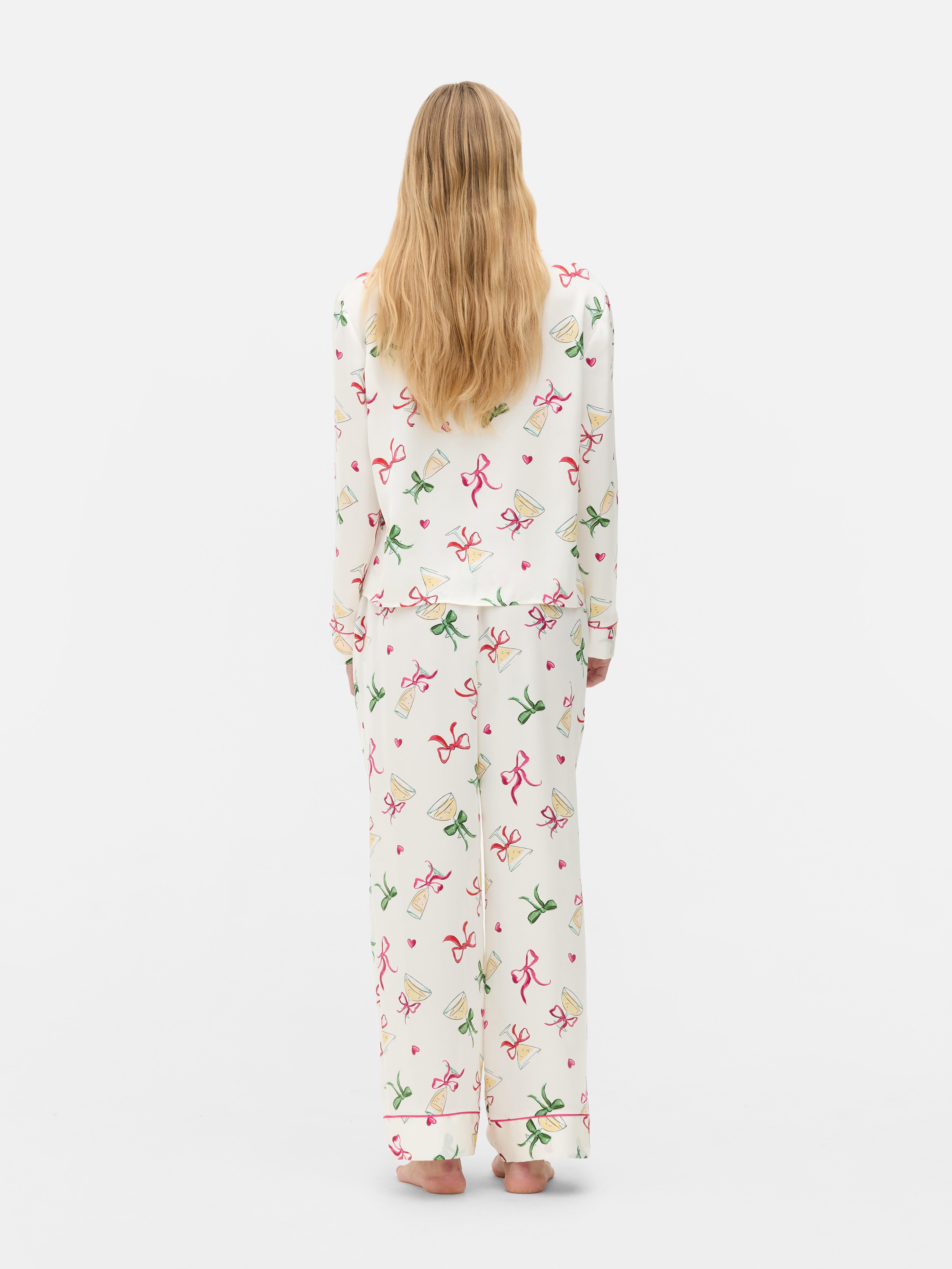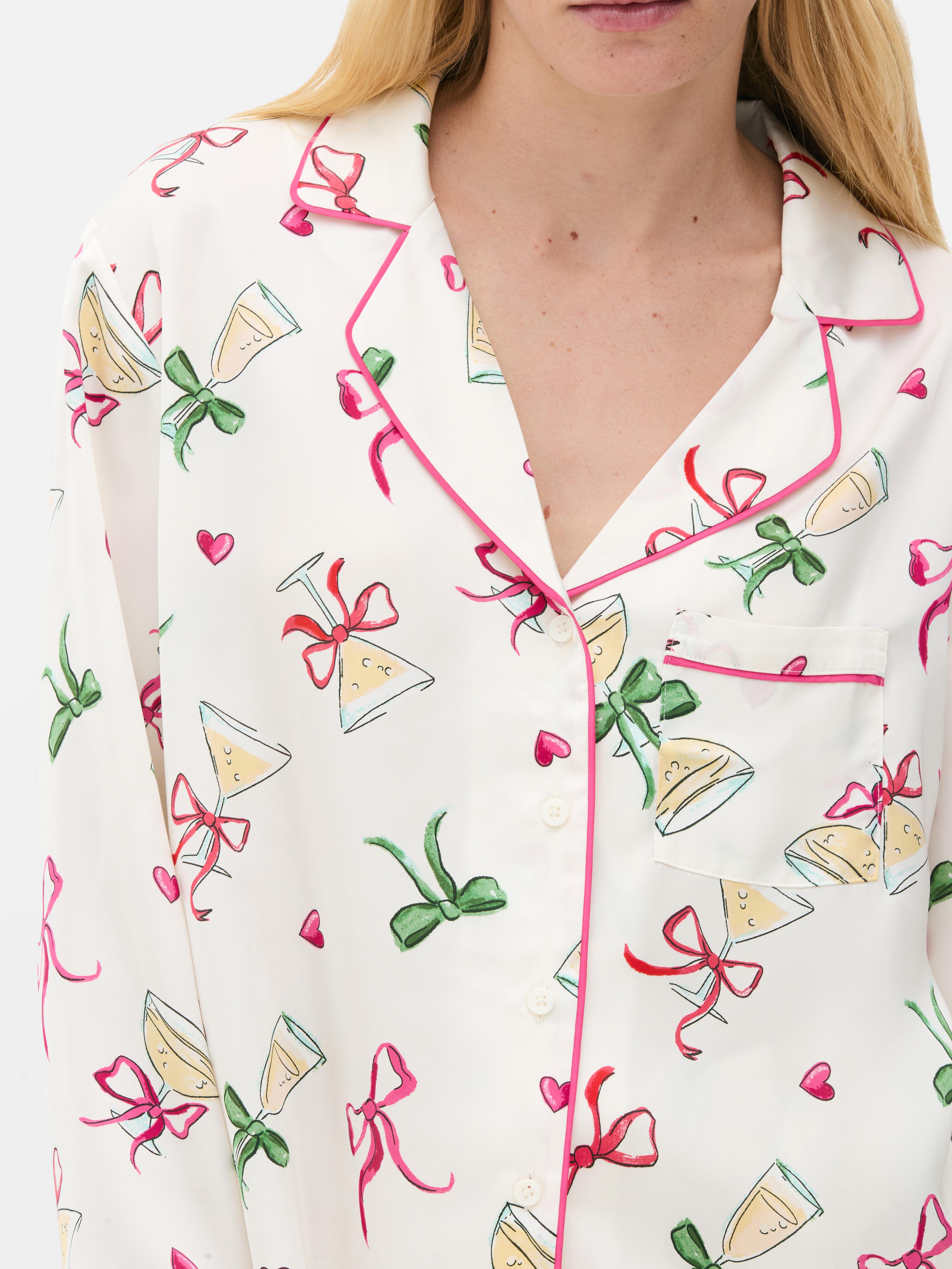 Satin boyfriend pajamas with an allover print of champagne glasses and bows