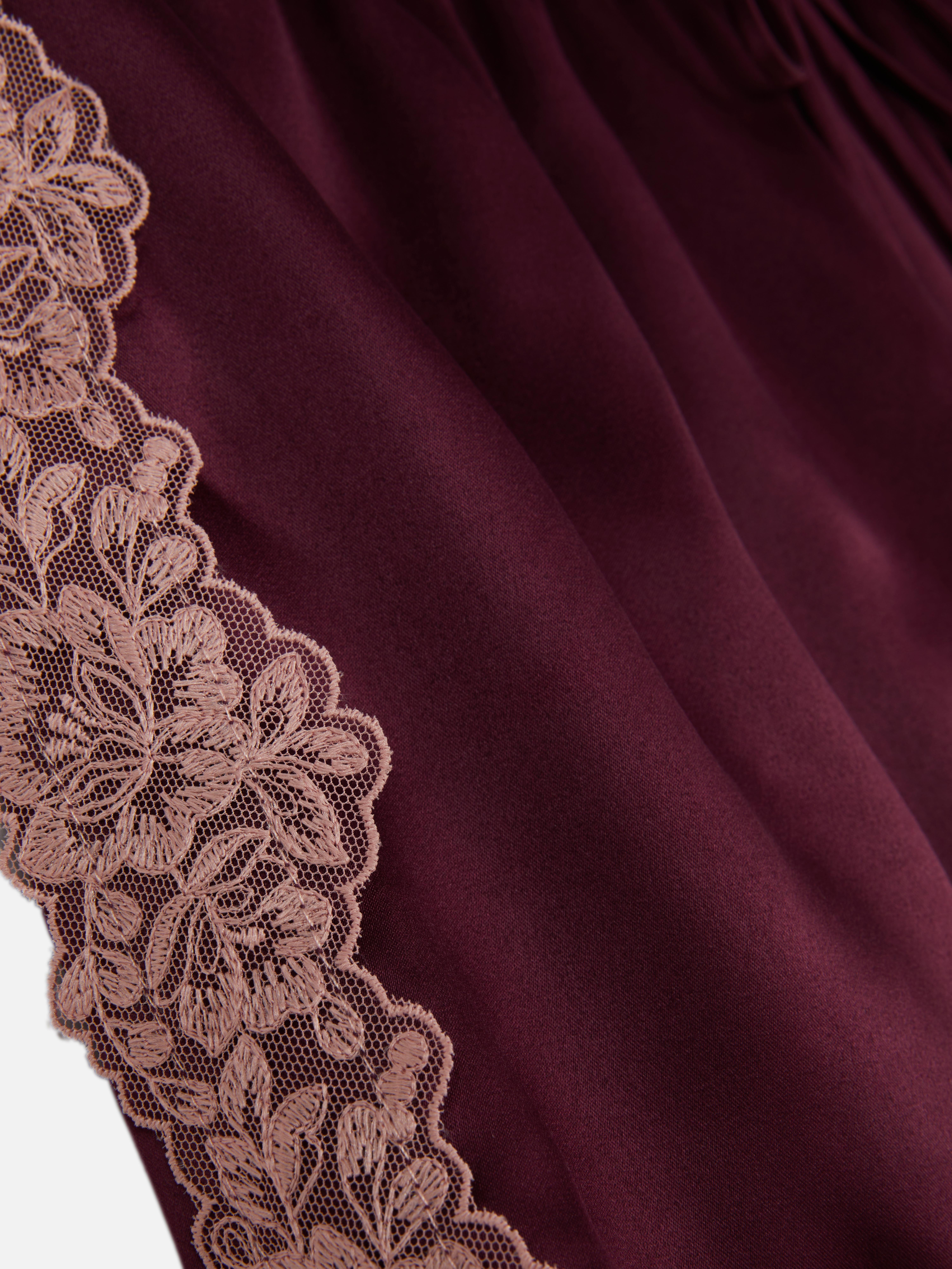 Comfy meets pretty in these satin style lace shorts, perfect for lounging or snoozing in style. In a rich fig hue, they’re made with a soft, silky fabric and finished with delicate contrast lace in a soft pink tone along the sides. The elasticated waistband and drawstring tie keep things easy and adjustable, while the short length adds a relaxed feel. Pair them with the matching cami for a co-ordinated look you’ll want to wear on repeat.