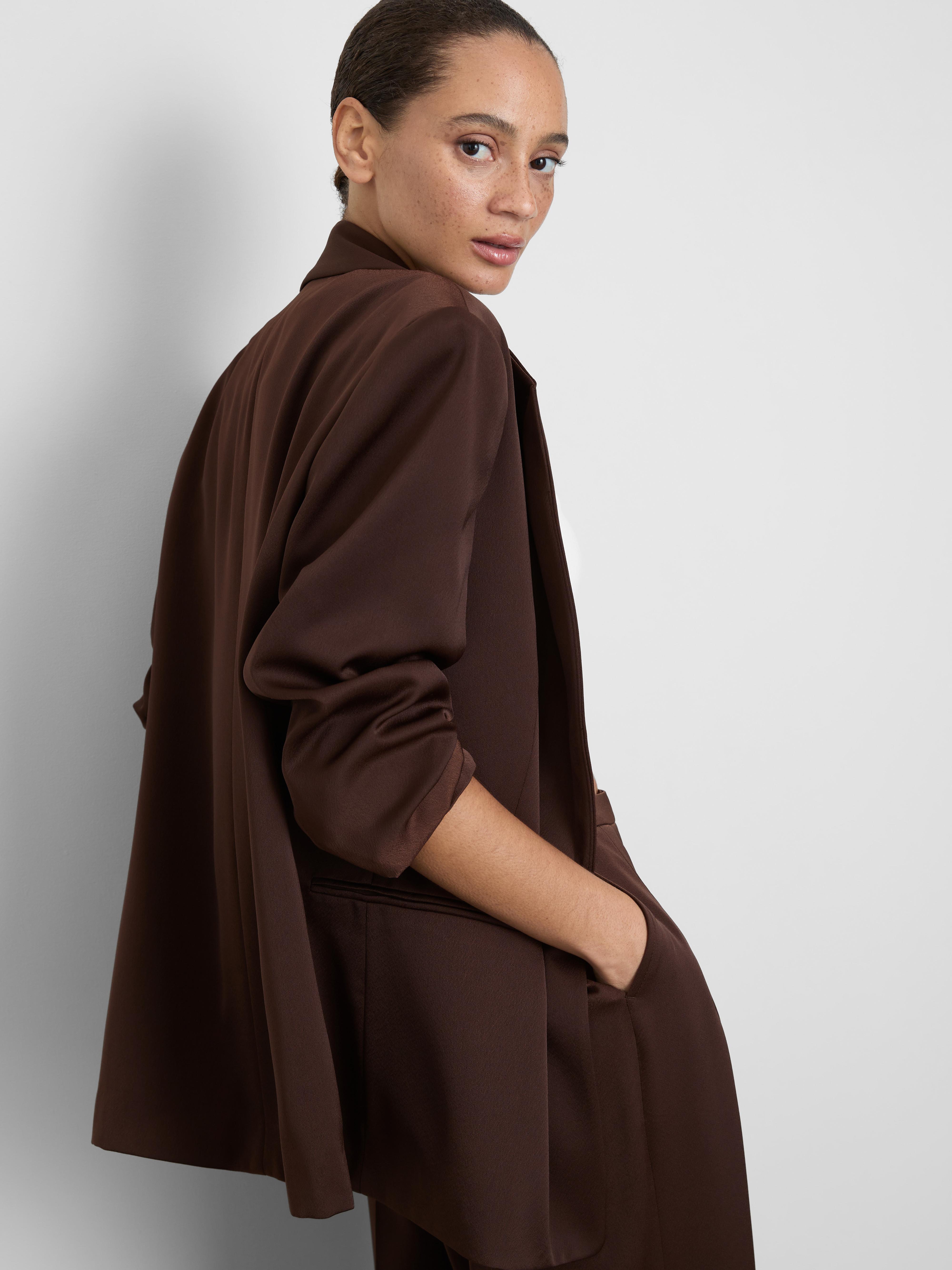 Tailored satin blazer with notch lapels, shaping darts and front pocket details